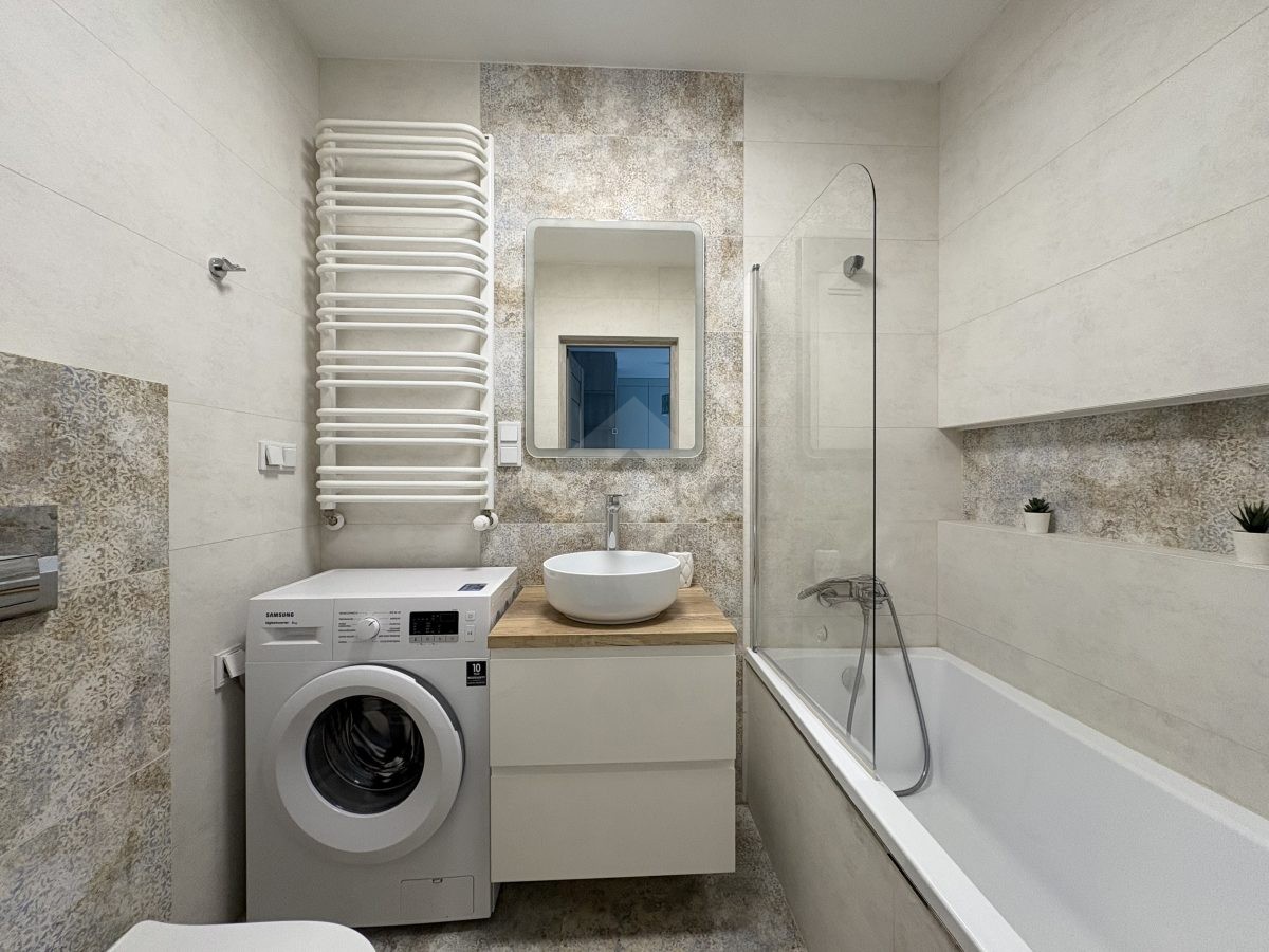 Stan nieruchomości: WYSOKI STANDARD. Ogrzewanie oraz ciepła woda realizowane z sieci miejskiej. Kuchnia wyposażona jest w lodówko-zamrażarkę, zmywarkę, płytę indukcyjną oraz okap, salon w stół z krzesłami, szafę w zabudowie, łóżko oraz komodę. W łazience znajduje się wanna, pralka oraz umywalka. W przedpokoju znajduję się dwudrzwiowa szafa.