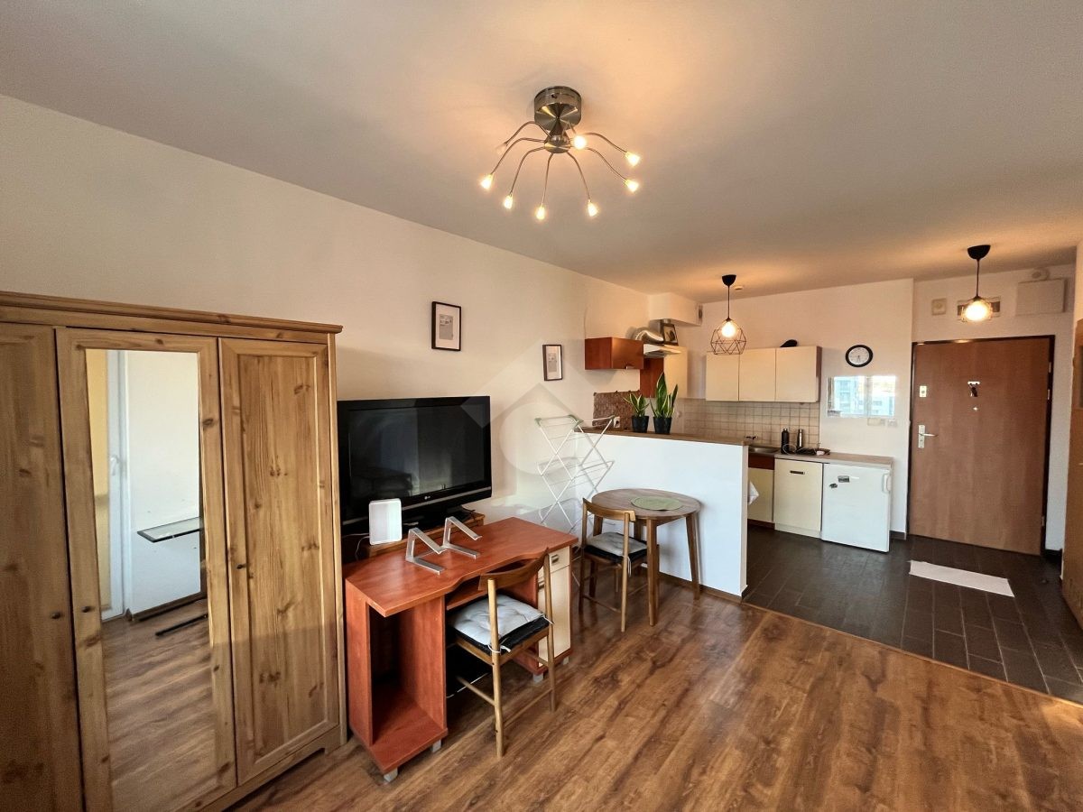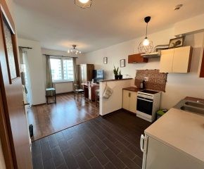The design of the studio apartment focuses on maximizing the available space, creating a functional interior that combines aesthetics with practicality. Every detail has been carefully planned to ensure comfort and convenience in daily life. The spacious living area leads directly to the balcony, which serves as an ideal place for relaxation.
