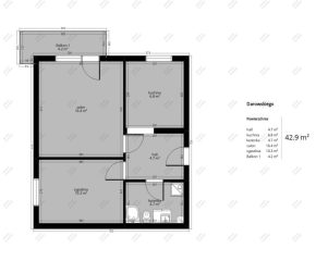 The property with an area of 43 m² consists of a bedroom, a living room with access to the balcony, a separate bright kitchen, a hallway, and a bathroom with WC.