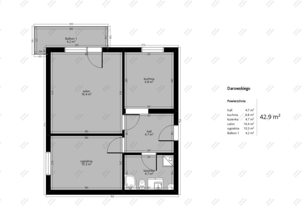 Nieruchomość o powierzchni 43 m² składa się sypialni, salonu z wyjściem na balkon, oddzielnej jasnej kuchni, przedpokoju oraz łazienki z WC.
