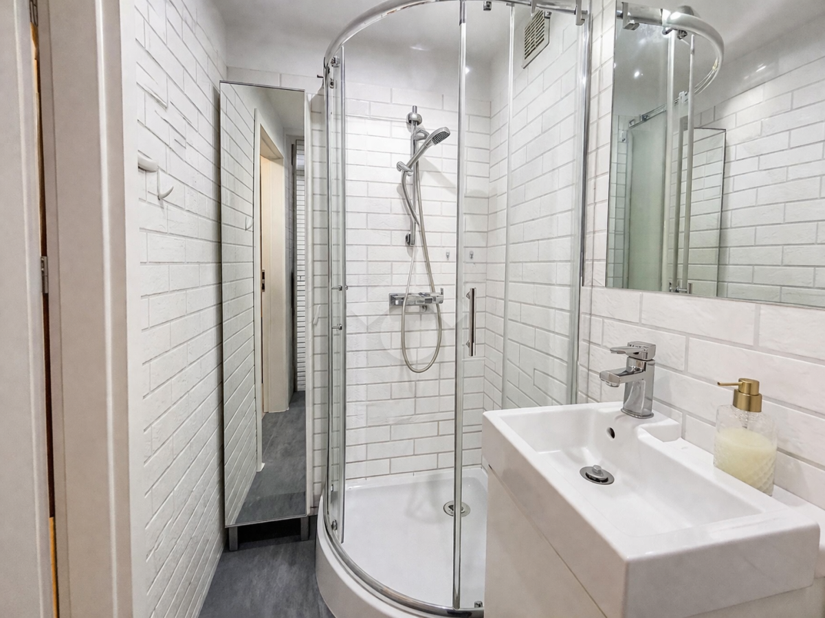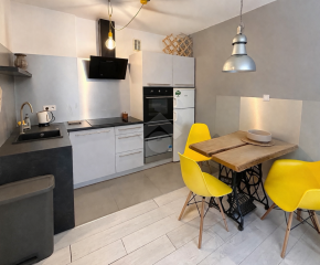Bardzo dobry – w części aneksu kuchennego zabudowa kuchenna wyposażona w podstawowe sprzęty AGD. W łazience znajduje się prysznic, umywalka oraz WC.