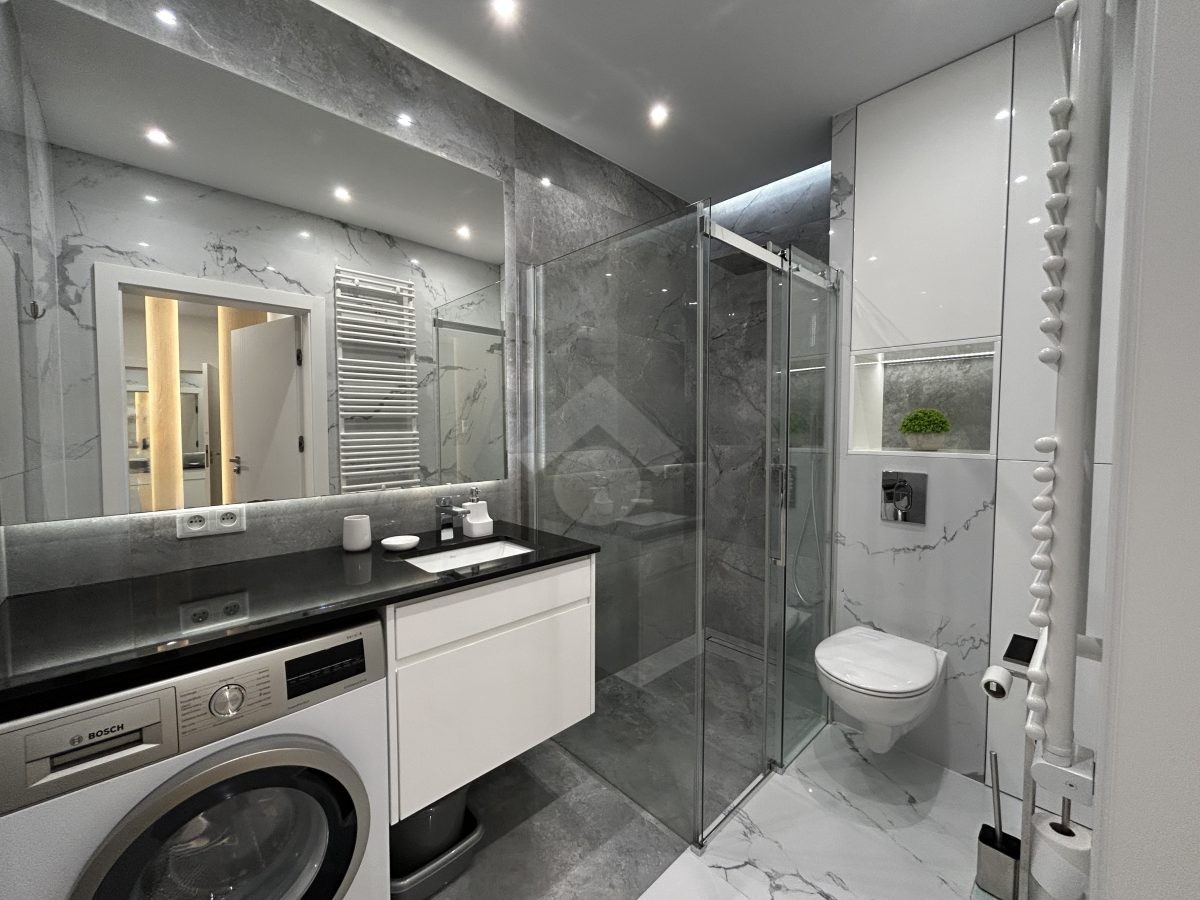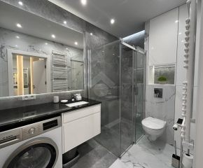 Bardzo dobry – w części aneksu kuchennego zabudowa kuchenna wyposażona w podstawowe sprzęty AGD (zmywarka, piekarnik, płyta indukcyjna, lodówka). W łazience znajduje się prysznic, umywalka, pralka oraz WC. W mieszkaniu zamontowana została klimatyzacja.