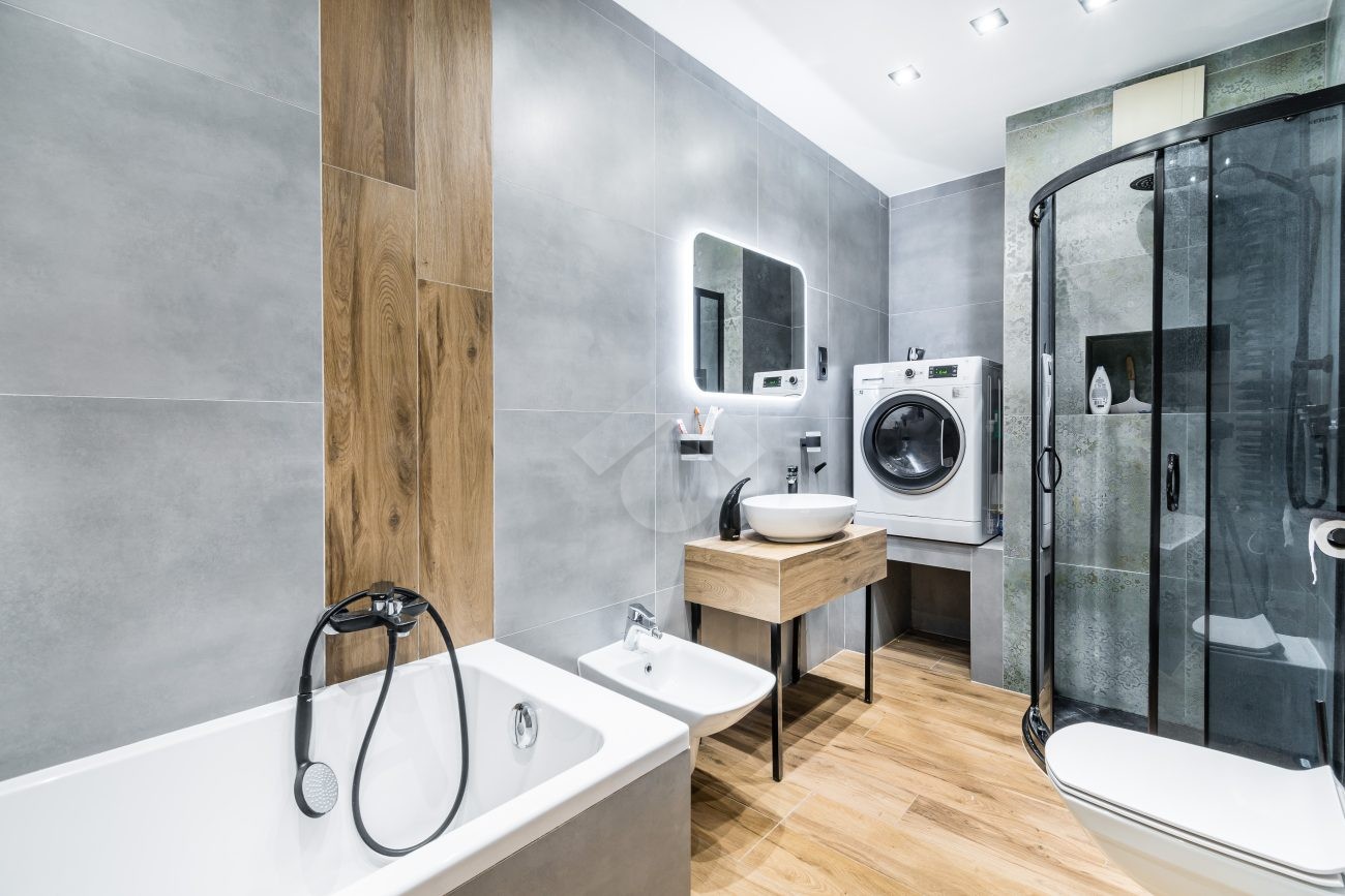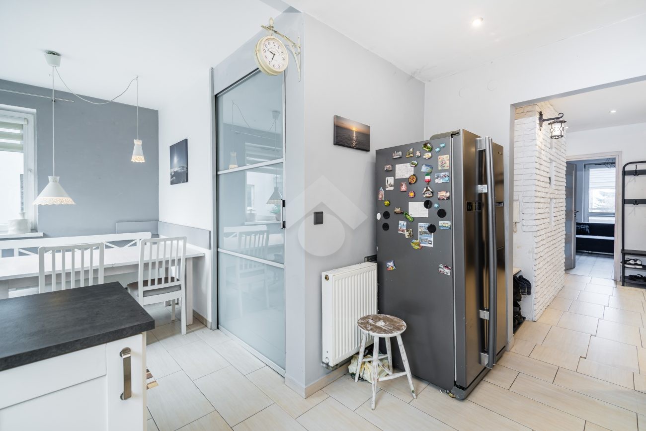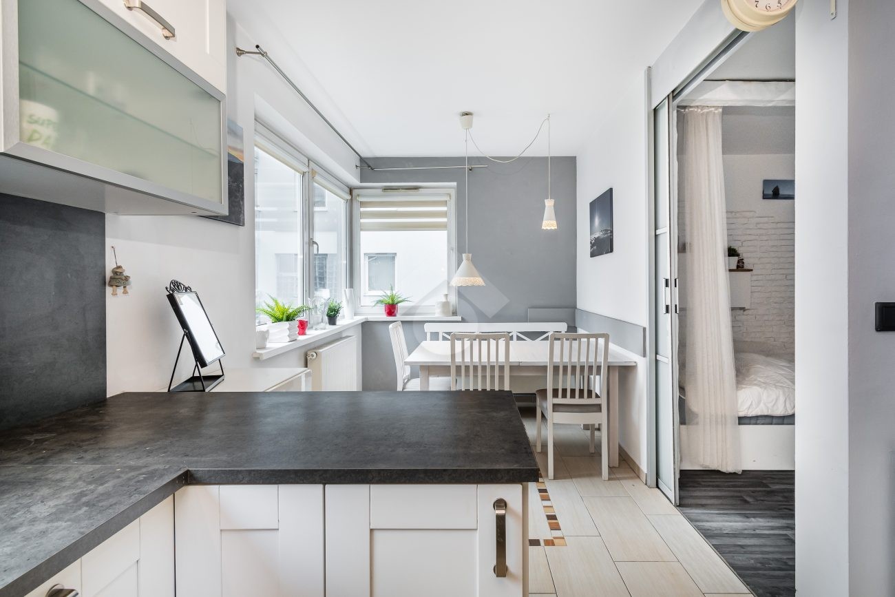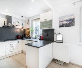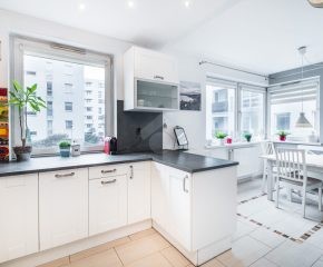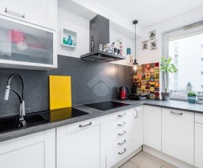 Bardzo dobry – w kuchni zabudowa kuchenna na wymiar wyposażona w podstawowe sprzęty AGD (płyta indukcyjna, piekarnik, lodówka, zmywarka, mikrofalówka). W łazience znajduje się wanna, prysznic, umywalka, pralka oraz WC.