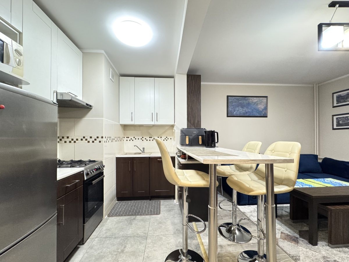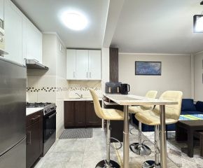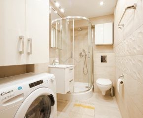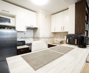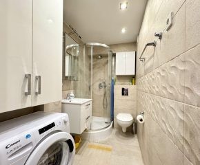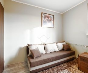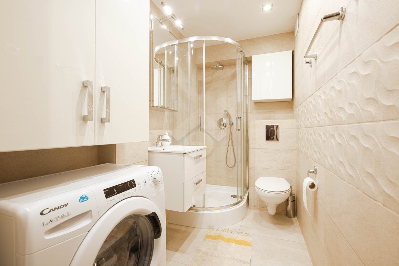 Bardzo dobry. W przedpokoju oraz części aneksu kuchennego na podłodze wyłożone zostały płytki, w pokojach panele. Kuchnia wyposażona w podstawowe sprzęty AGD. W łazience znajduje się prysznic, umywalka, pralka oraz WC. Wszystkie instalacje zostały wymienione w 2018 roku.