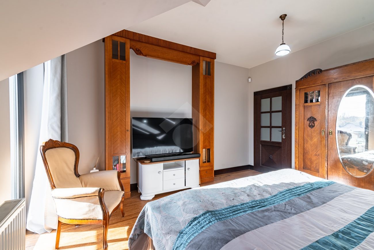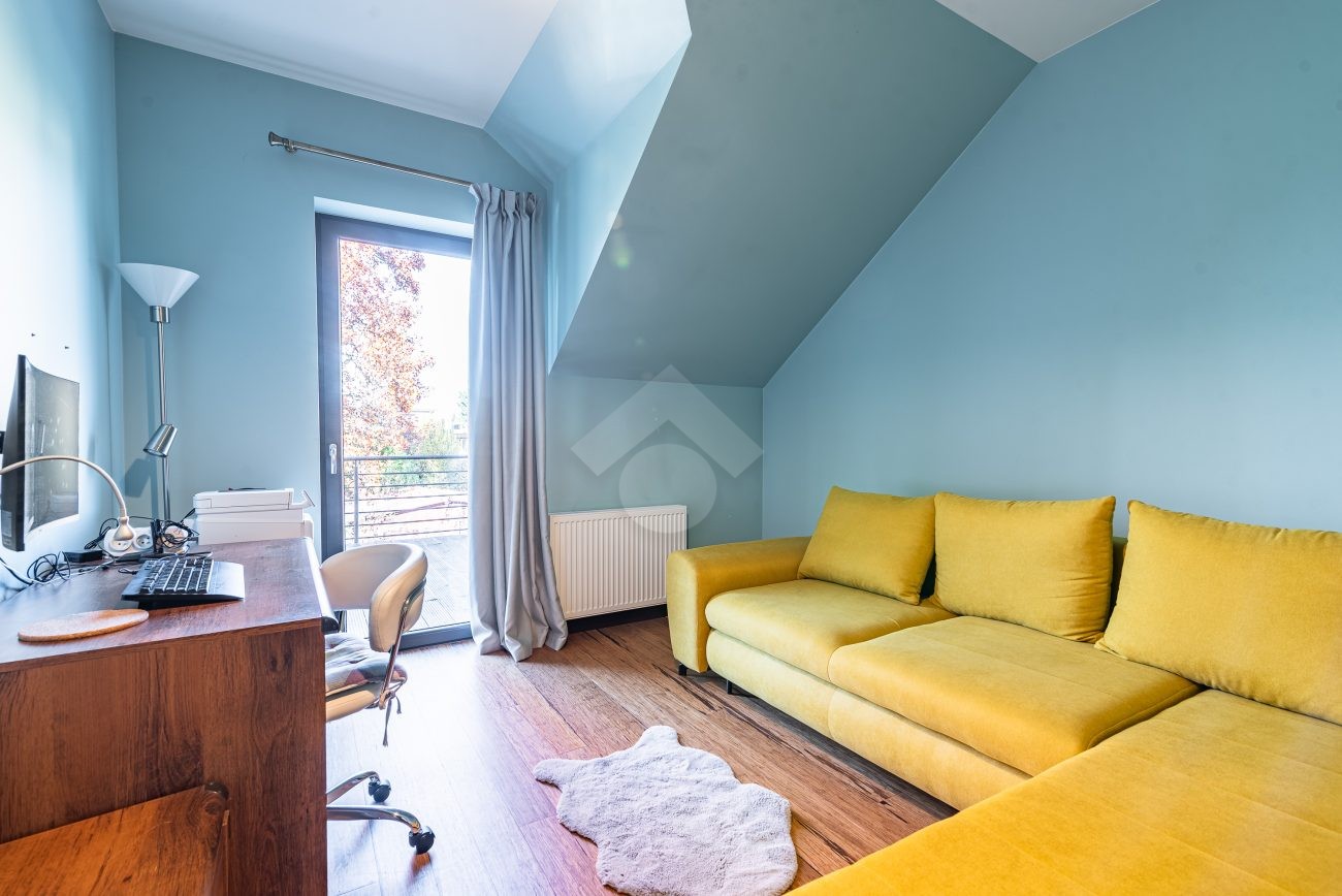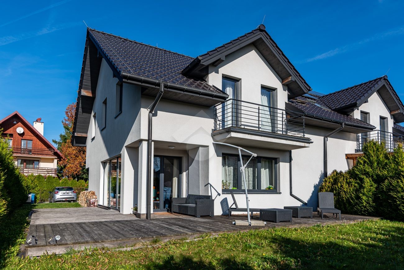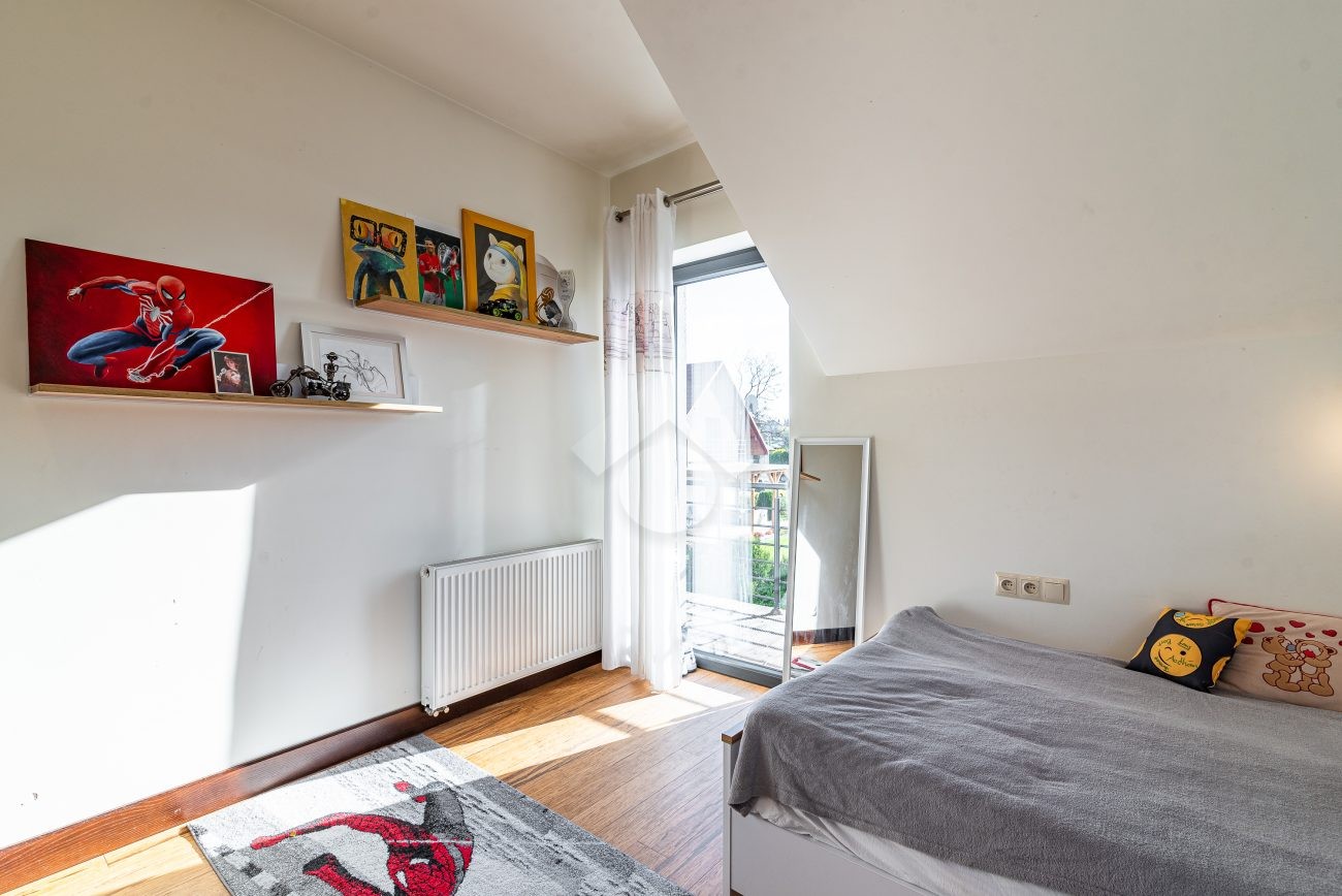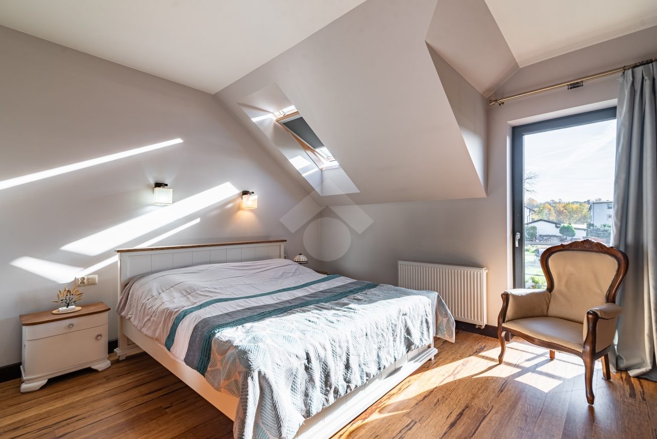 Rozkład pomieszczeń: Na parterze znajdziemy: przestronny salon z jadalnią, nowoczesną kuchnię, przedpokój, łazienkę z prysznicem, pomieszczenie gospodarcze. Z salonu prowadzi wyjście na duży ogród, a na terenie posesji znajduje się także przestronny drewniany taras. Na pierwszym piętrze znajdują się cztery sypialnie oraz druga łazienka, wyposażona zarówno w prysznic, jak i wanna z hydromasażem. Duży strych o powierzchni około 60 m² zapewnia dodatkową przestrzeń do zagospodarowania.
