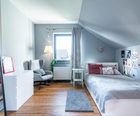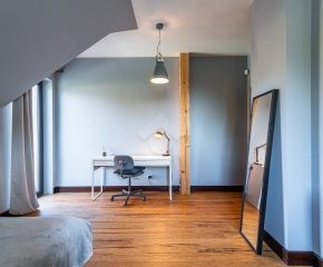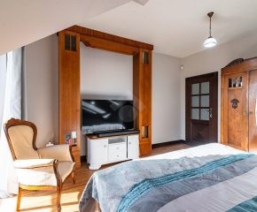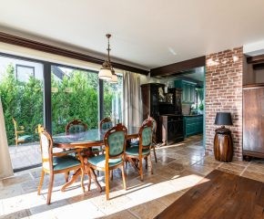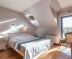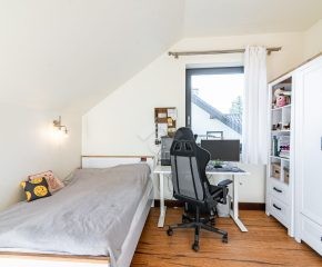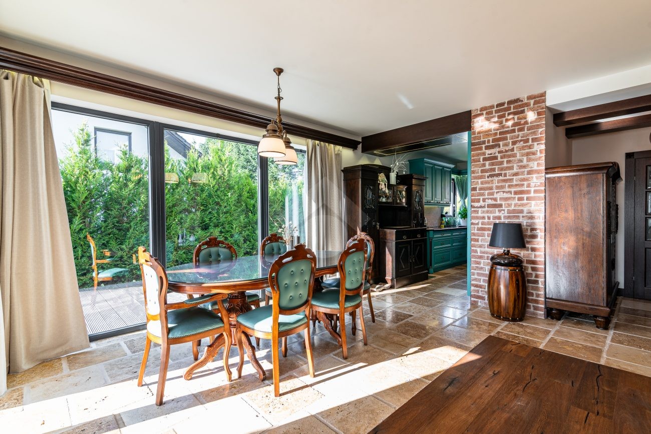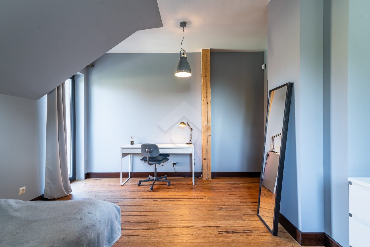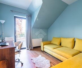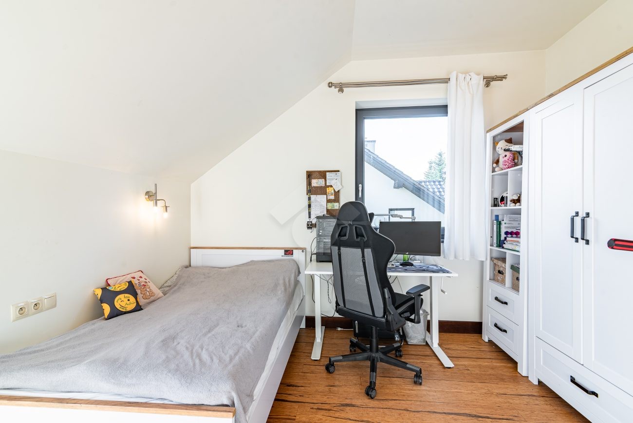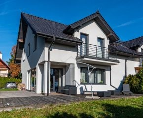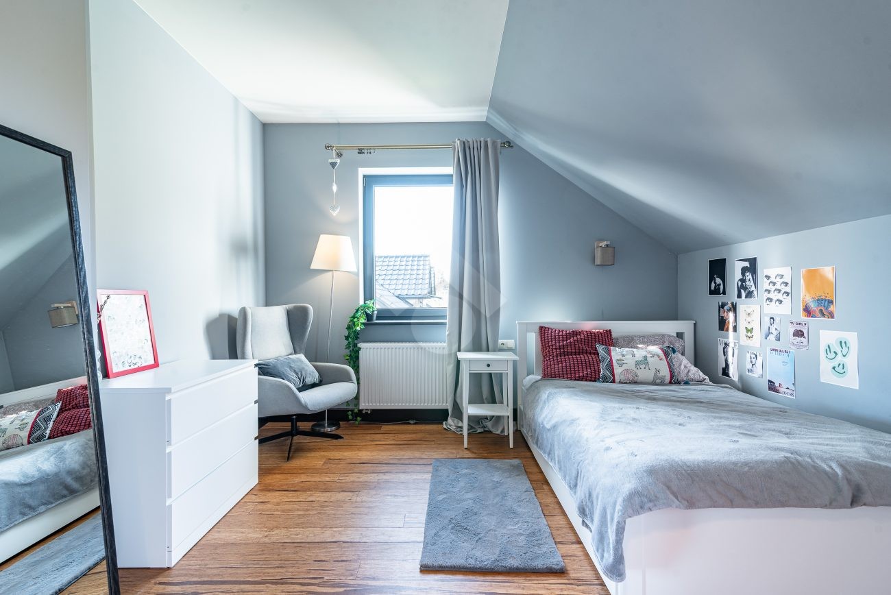 Rozkład pomieszczeń: Na parterze znajdziemy: przestronny salon z jadalnią, nowoczesną kuchnię, przedpokój, łazienkę z prysznicem, pomieszczenie gospodarcze. Z salonu prowadzi wyjście na duży ogród, a na terenie posesji znajduje się także przestronny drewniany taras. Na pierwszym piętrze znajdują się cztery sypialnie oraz druga łazienka, wyposażona zarówno w prysznic, jak i wanna z hydromasażem. Duży strych o powierzchni około 60 m² zapewnia dodatkową przestrzeń do zagospodarowania.