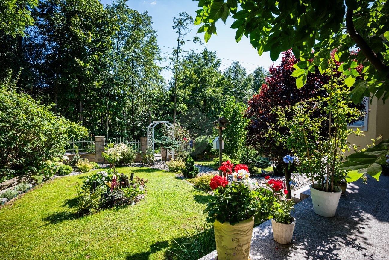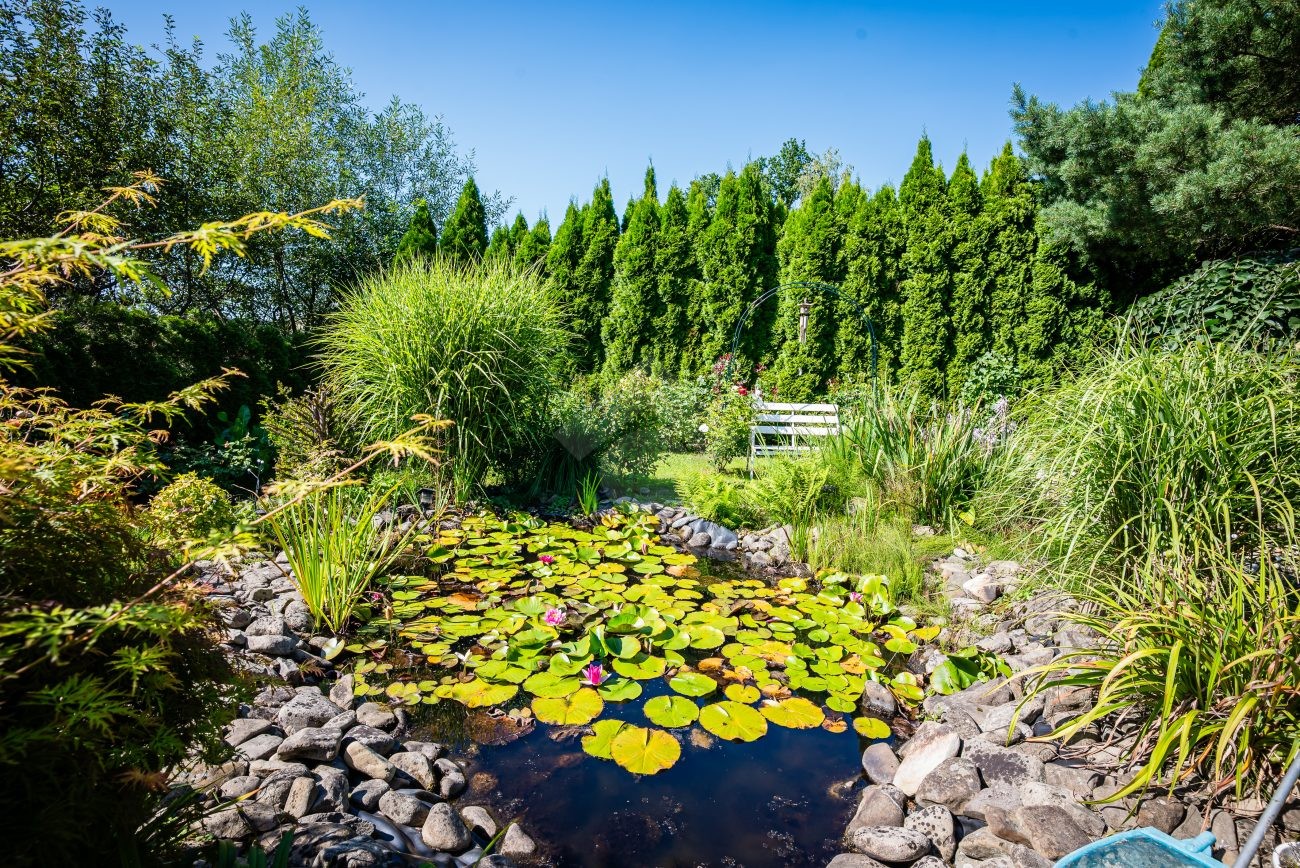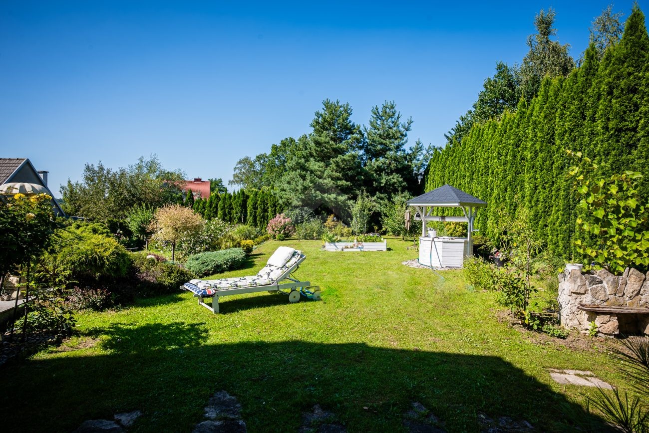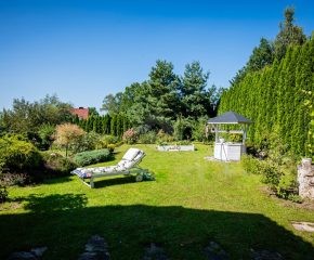 Działka o powierzchni 0,13 ha jest o ekspozycji południowej (przód budynku) i południowej (bezpośrednie wyjście z kuchni na taras z zejściem na ogród). Działka w kształcie prostokąta, zagospodarowana – trawnik, nasadzenia krzewów ozdobnych, wydzielone miejsce rekreacyjne. Możliwość rozbudowy lub aranżacji dodatkowych elementów ogrodu. Z tyłu działki znajduje się oczko wodne, pięknie zaaranżowany ogród z fontanną i studnią, której ujęcie zasila nieruchomość w wodę. Z przodu budynku ułożona kostka brukowa łączy wjazd do działki z garażem.
