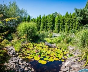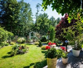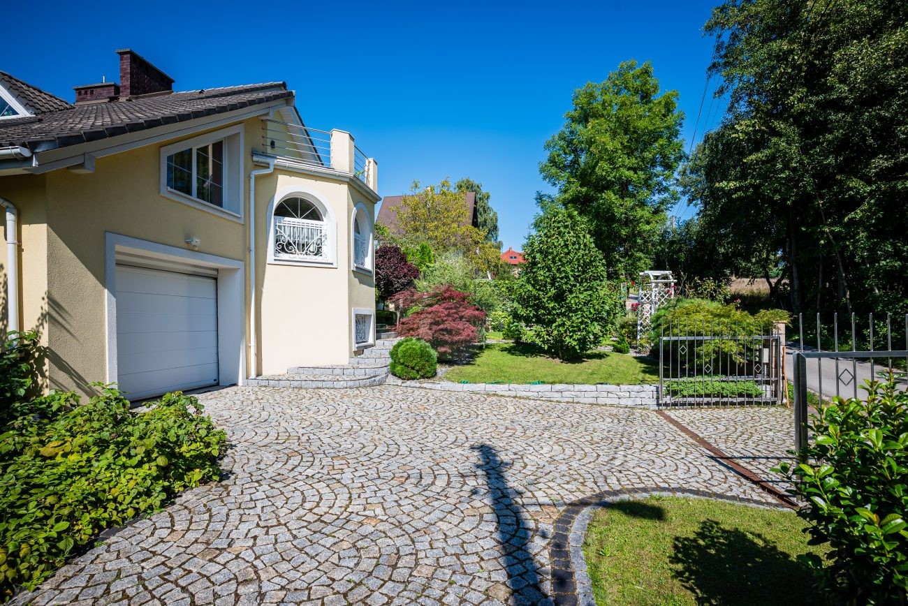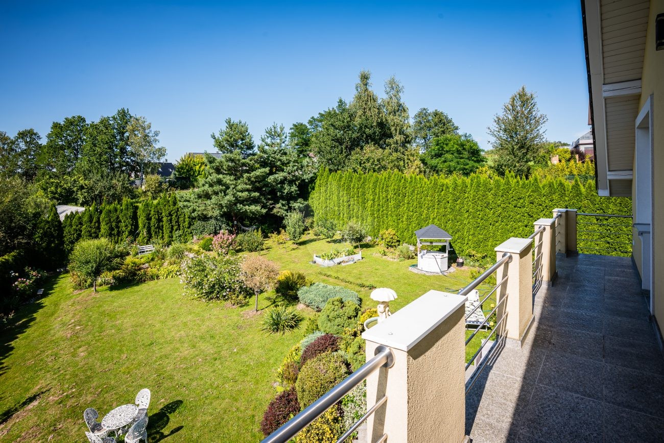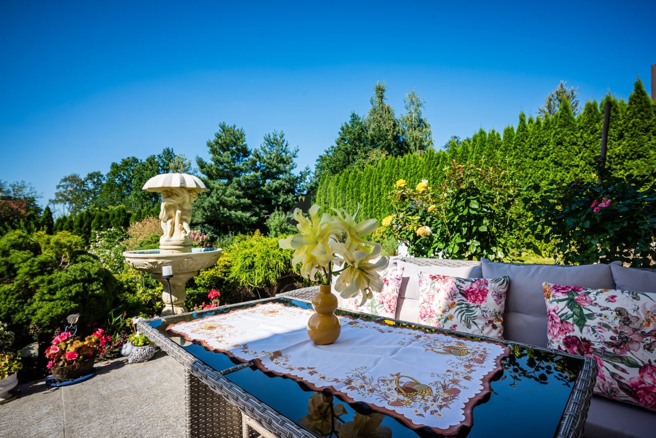 Działka o powierzchni 0,13 ha jest o ekspozycji południowej (przód budynku) i południowej (bezpośrednie wyjście z kuchni na taras z zejściem na ogród). Działka w kształcie prostokąta, zagospodarowana – trawnik, nasadzenia krzewów ozdobnych, wydzielone miejsce rekreacyjne. Możliwość rozbudowy lub aranżacji dodatkowych elementów ogrodu. Z tyłu działki znajduje się oczko wodne, pięknie zaaranżowany ogród z fontanną i studnią, której ujęcie zasila nieruchomość w wodę. Z przodu budynku ułożona kostka brukowa łączy wjazd do działki z garażem.