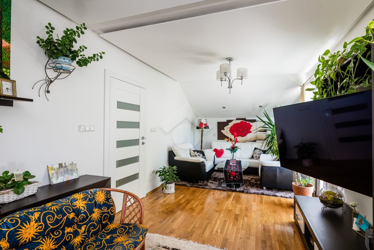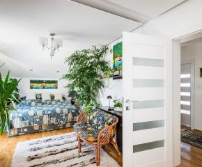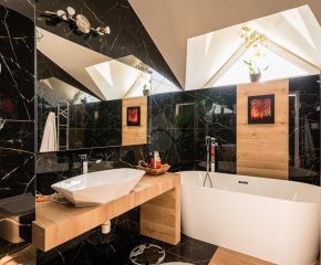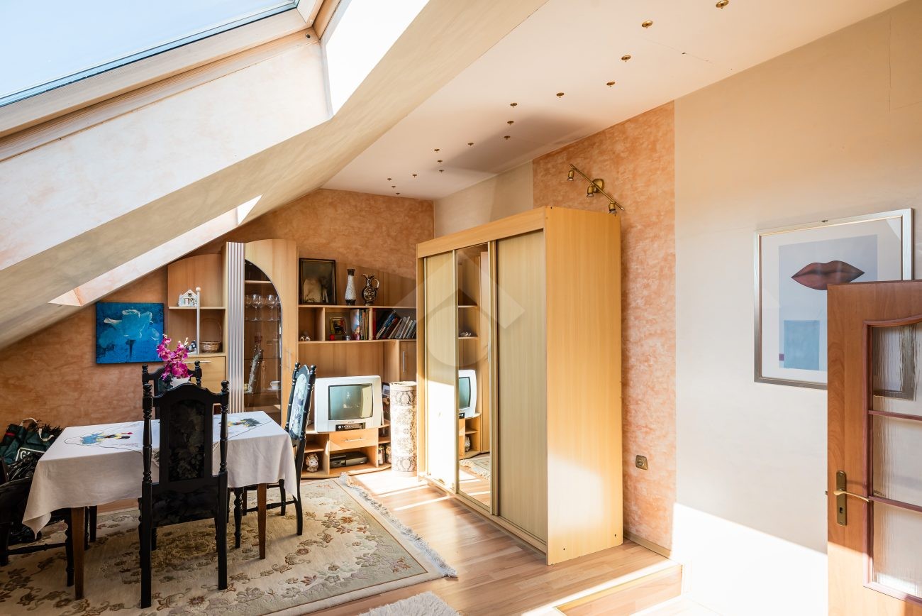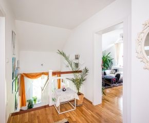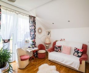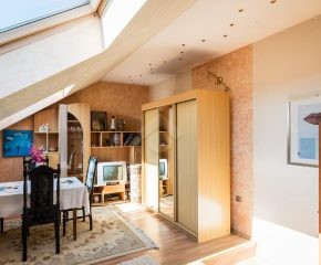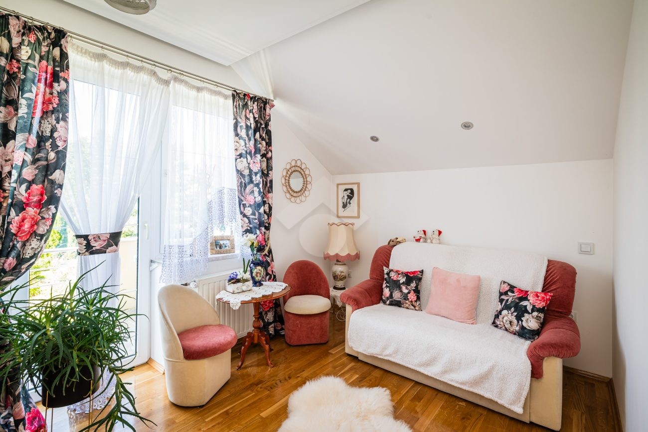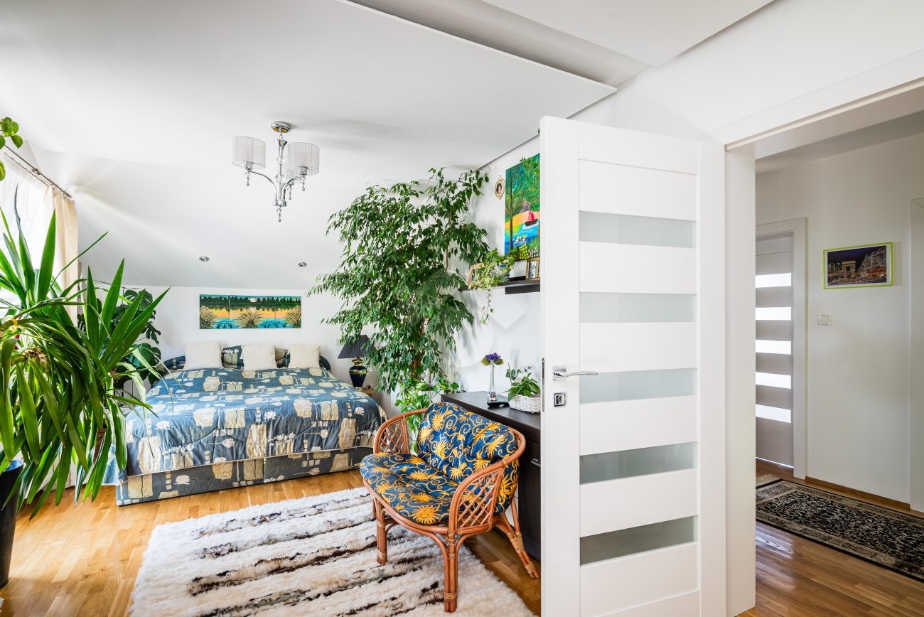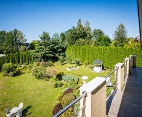 – Poddasze: hol z klatką schodową (11,90 m2), łazienka z wanną (4,60 m2), sypialnia 1 (10 m2), sypialnia 2 (9,90 m2) i sypialnia 3 (24,50 m2). Wszystkie sypialnie posiadają wyjście na balkony. Od strony południowej budynku znajduje się taras o powierzchni ok. 25,62 m2. Balkon od strony północnej ma powierzchnię ok. 10,84 m2.