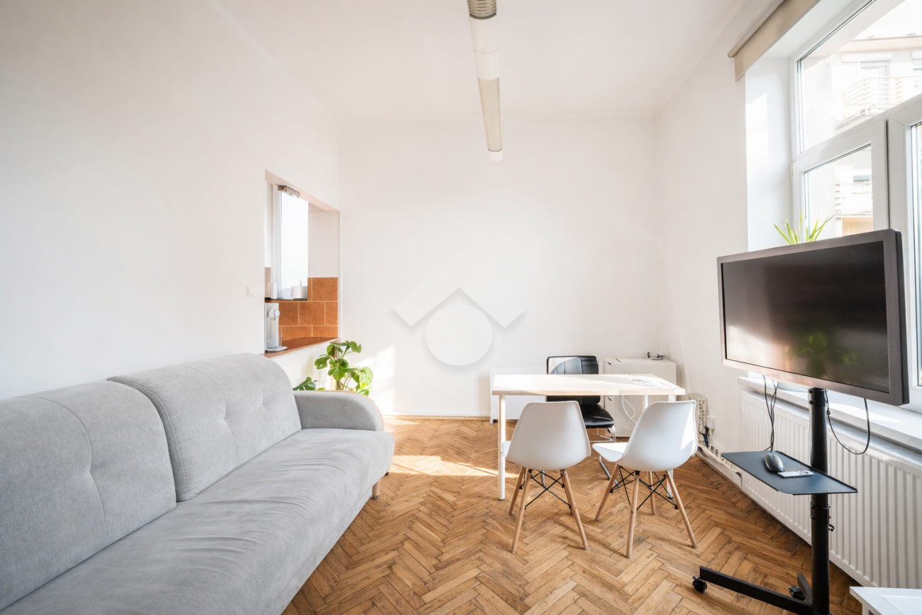 Mieszkanie zachowało klimatyczny charakter kamienicy, który podkreślają wysokie na około 3,5 m sufity oraz drewniany parkiet w pomieszczeniach. Układ mieszkania jest przestronny i funkcjonalny, co daje duże możliwości aranżacyjne oraz pozwala dostosować wnętrze do własnych potrzeb.