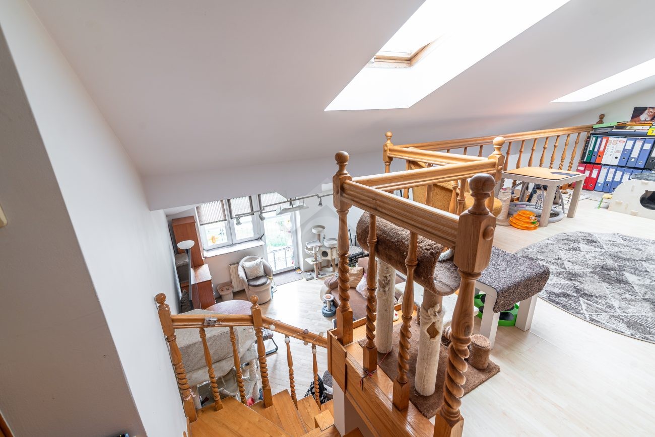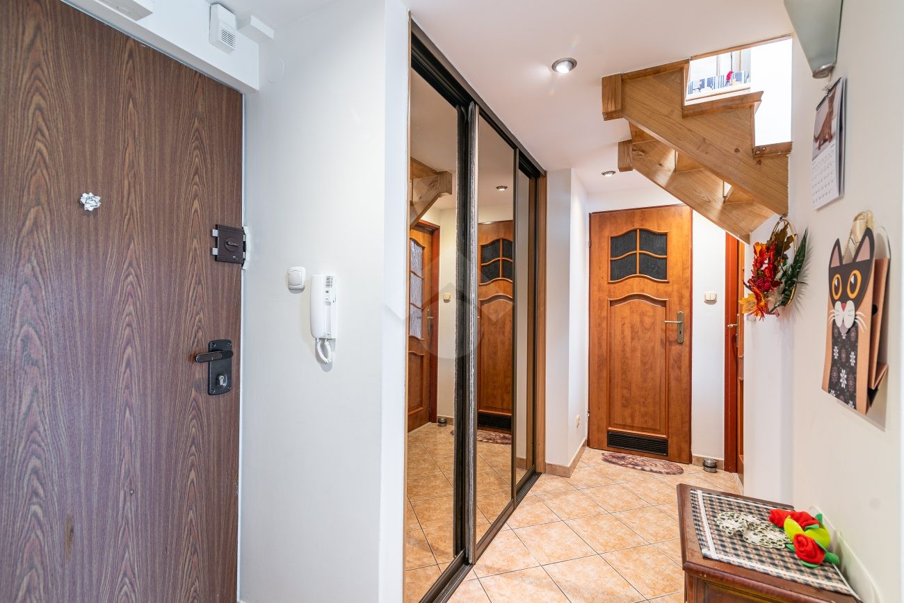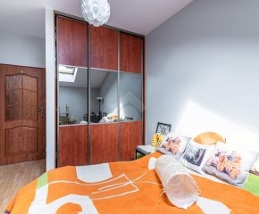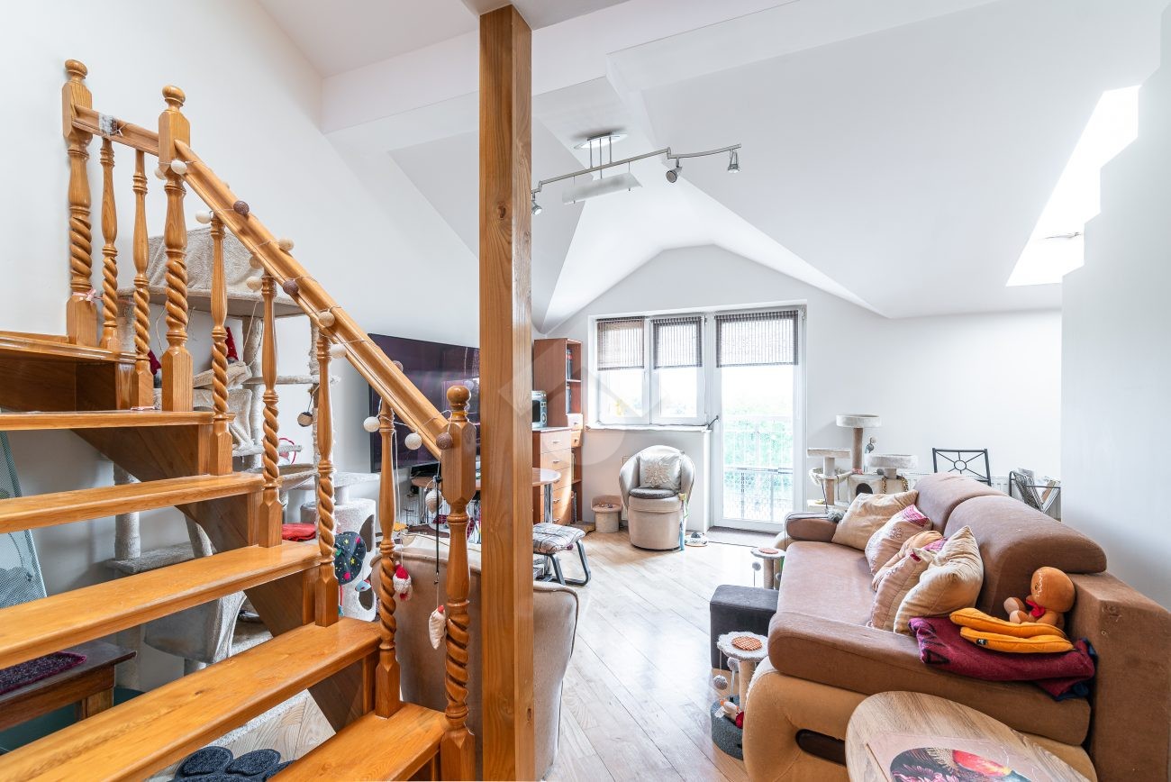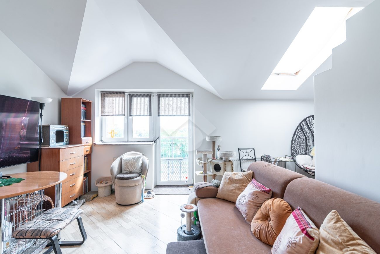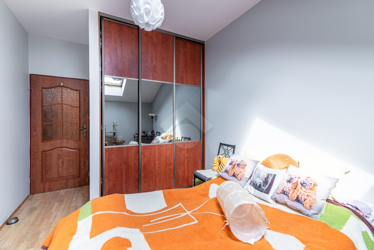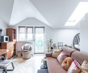 Mieszkanie składa się z salonu z aneksem kuchennym, sypialni, łazienki z WC, przedpokoju oraz dodatkowej przestrzeni na drugim poziomie, która może pełnić funkcję drugiej sypialni, gabinetu lub pokoju rekreacyjnego. Dzięki wschodniej ekspozycji oraz dużych dachowych oknach wnętrza są doskonale doświetlone przez cały dzień. Dodatkowym atutem jest balkon o powierzchni ok. 3 m².