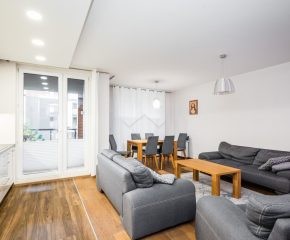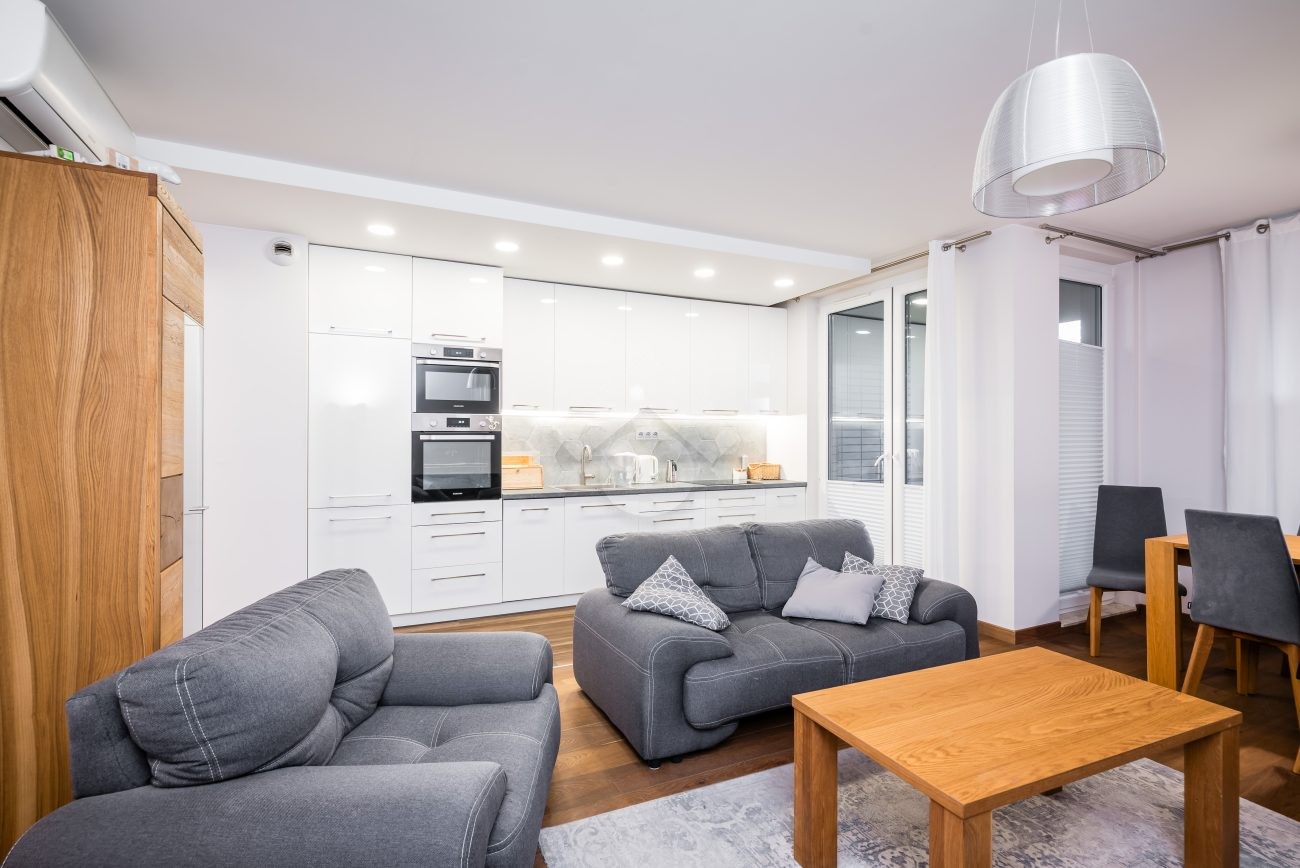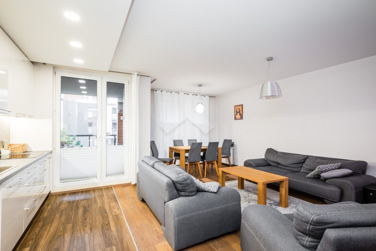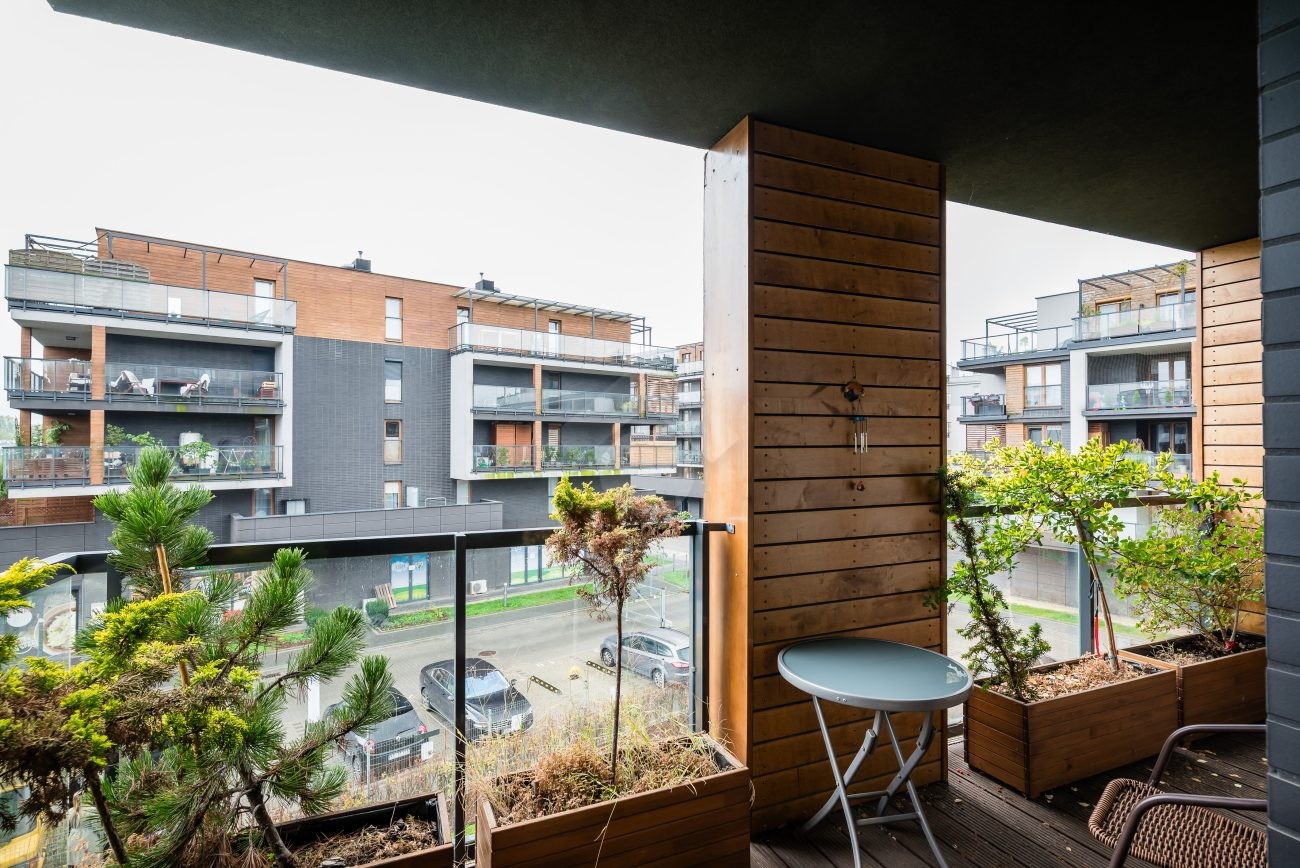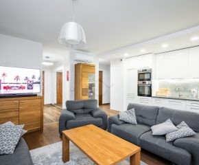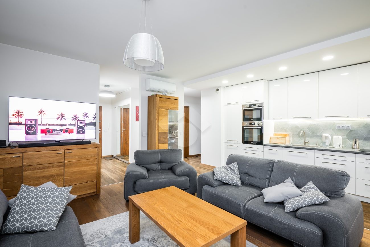 Mieszkanie utrzymane w bardzo dobrym stanie technicznym i wizualnym. Wykończone z użyciem wysokiej jakości materiałów – w salonie i sypialniach na podłodze znajduje się drewno, natomiast w pozostałych pomieszczeniach płytki. Aneks kuchenny wyposażony jest w sprzęt AGD: piekarnik, mikrofalę, lodówkę, płytę indukcyjną marki Samsung oraz zmywarkę Candy 45 cm. Każda z sypialni posiada własny balkon z widokiem na zieleń, natomiast z salonu prowadzi wyjście na duży taras z miejscem do wypoczynku.