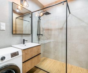 Łazienka została urządzona w nowoczesnym standardzie — znajduje się w niej prysznic typu walk-in, pojemna szafka z dwiema szufladami oraz pralka.