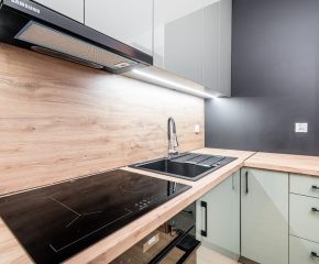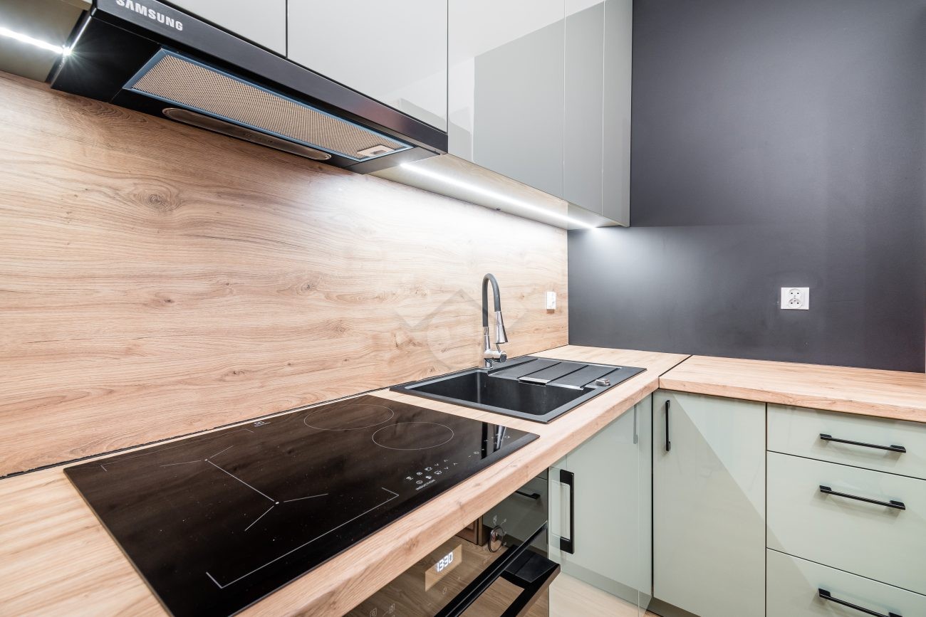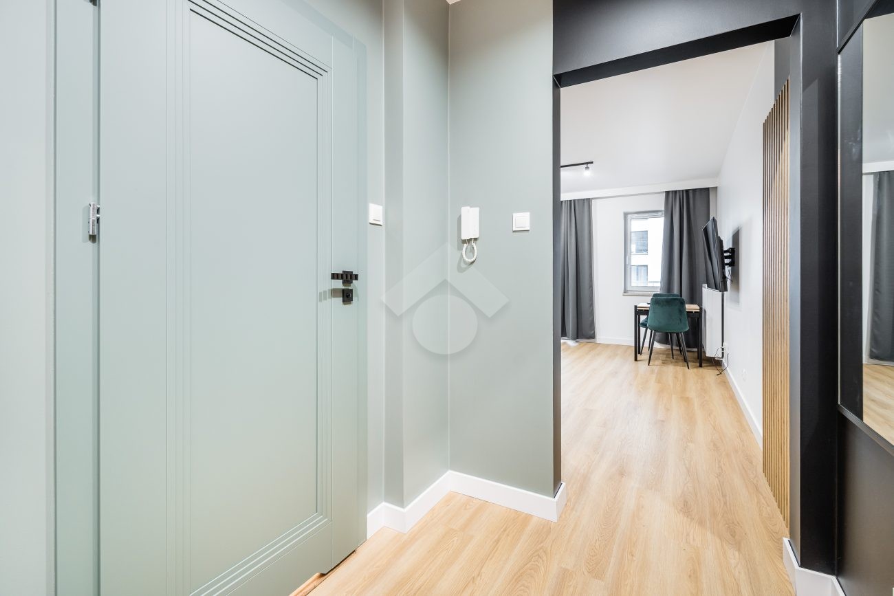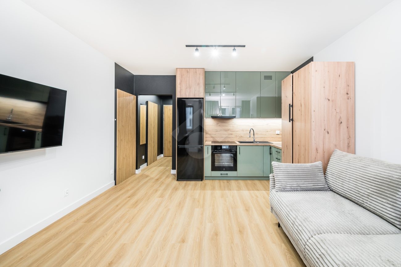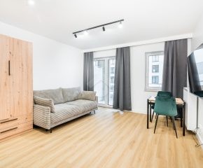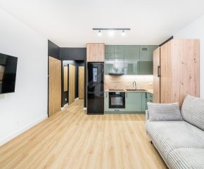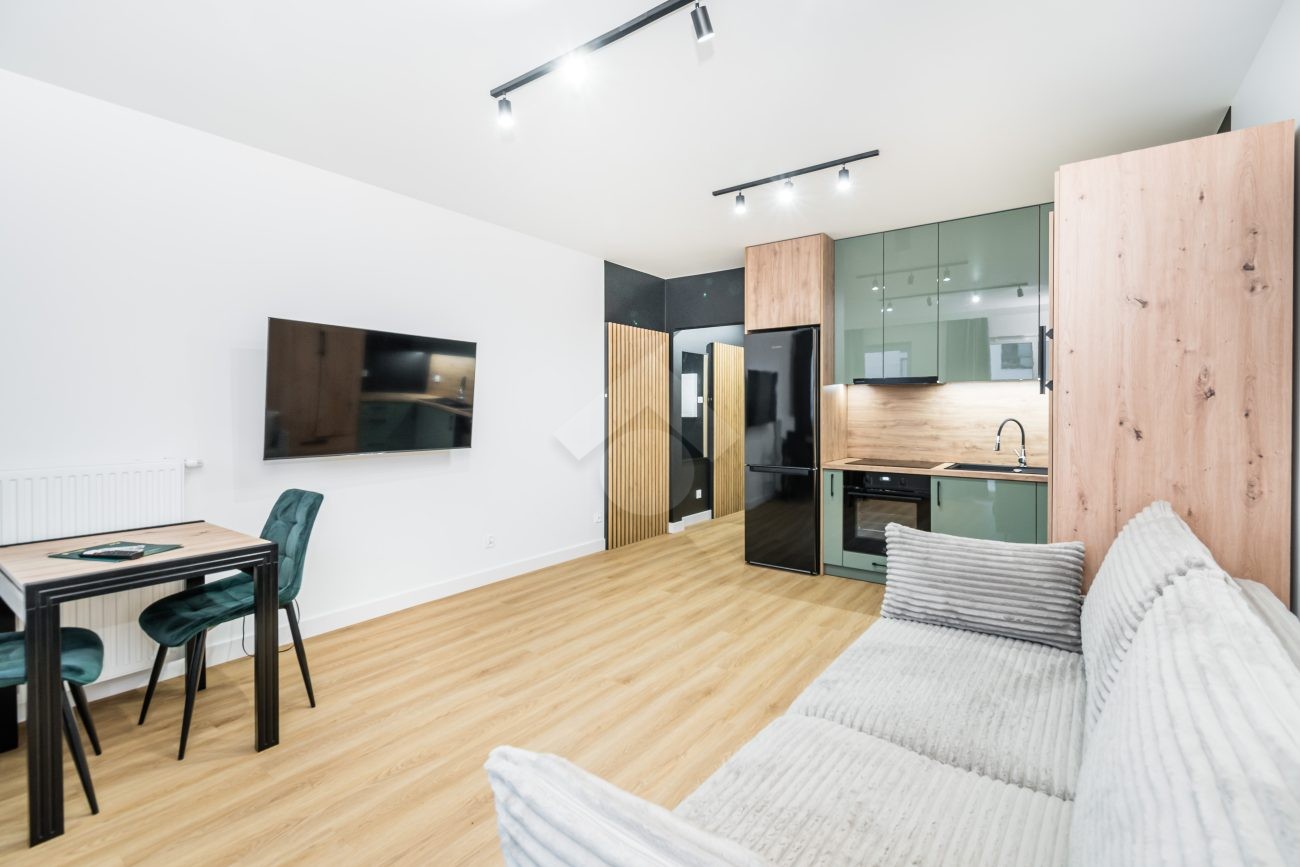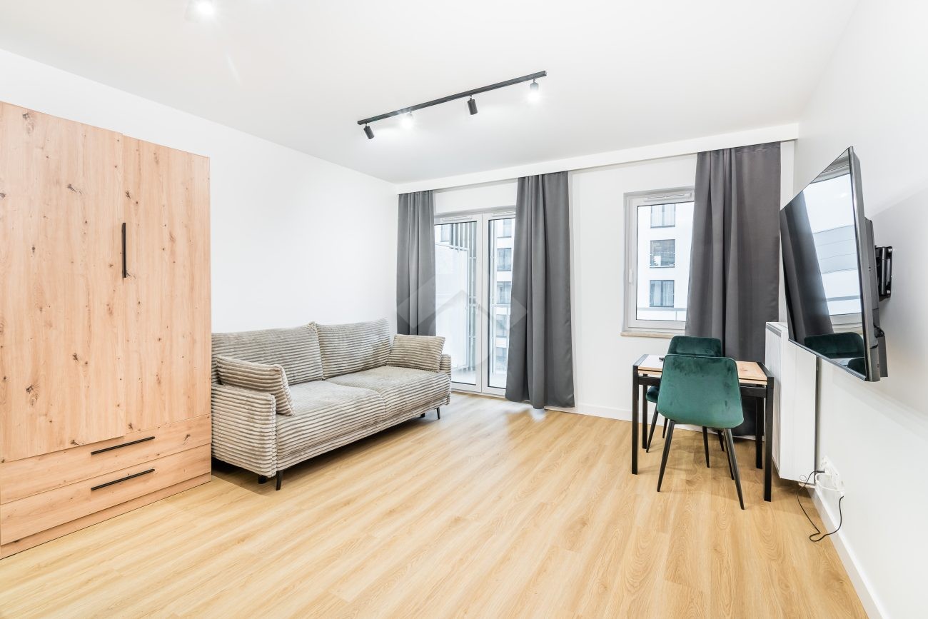 Mieszkanie obejmuje jasny salon z aneksem kuchennym wyposażonym w sprzęty AGD dobrej klasy: piekarnik i płytę indukcyjną Electrolux, okap Samsung oraz lodówkę Indesit. Do dyspozycji najemcy pozostaje także rozkładana sofa, duża szafa, stół z dwoma krzesłami oraz telewizor.
