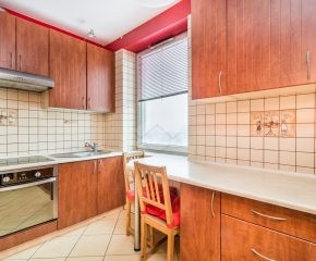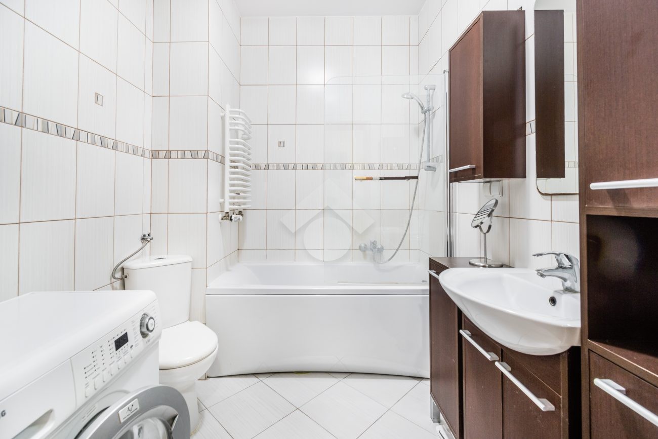 W kuchni znajduje się zabudowa kuchenna wraz z piekarnikiem, płytą indukcyjną oraz okapem marki Mastercook, a także lodówka z zamrażarką. Pokój został wyposażony w rozkładaną kanapę, biurko, komodę oraz szafkę pod telewizor. W łazience z WC znajduje się wanna z funkcją prysznica, pralka, umywalka, szafki oraz toaleta. W przedpokoju do dyspozycji najemcy jest pojemna szafa oraz półka na buty.