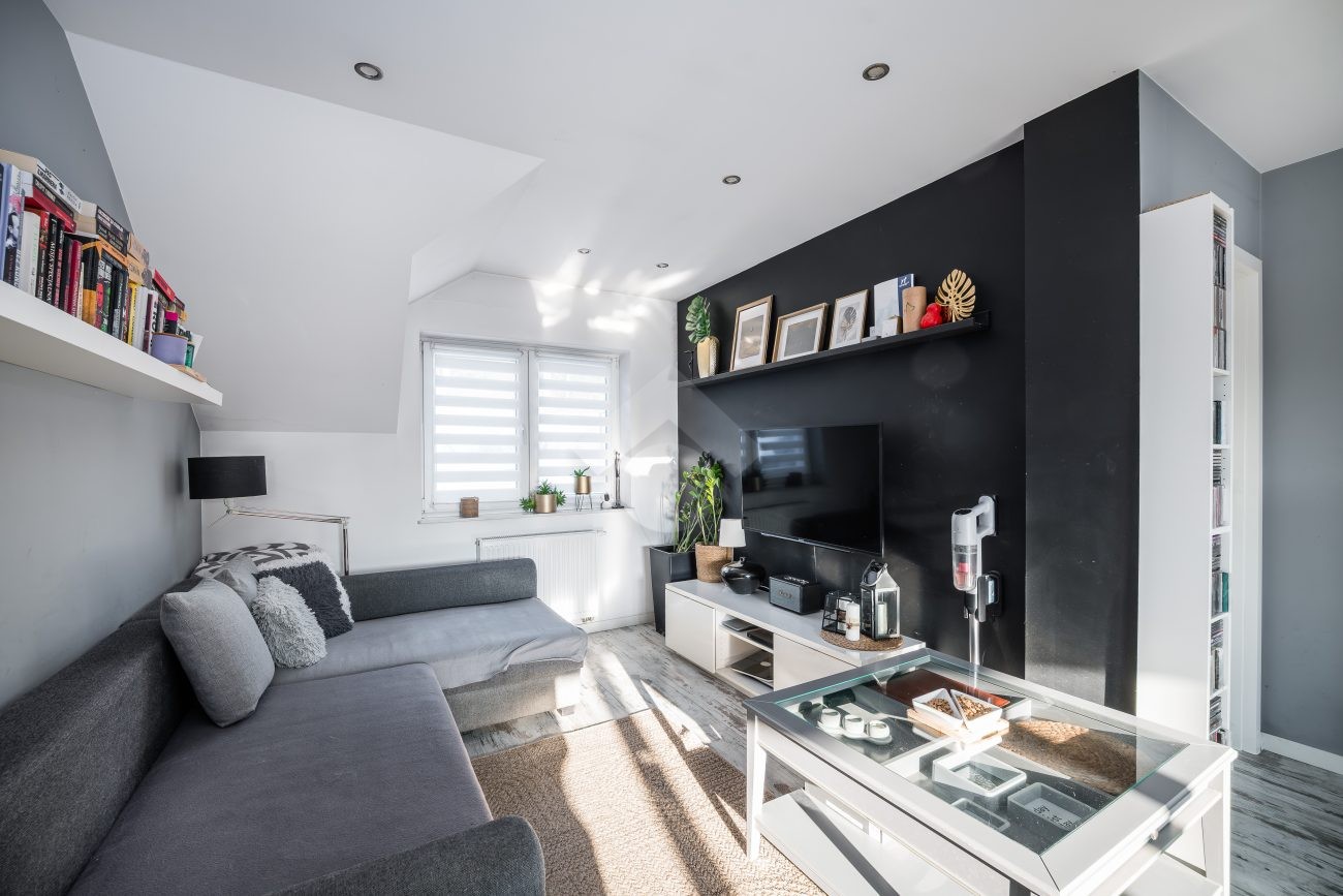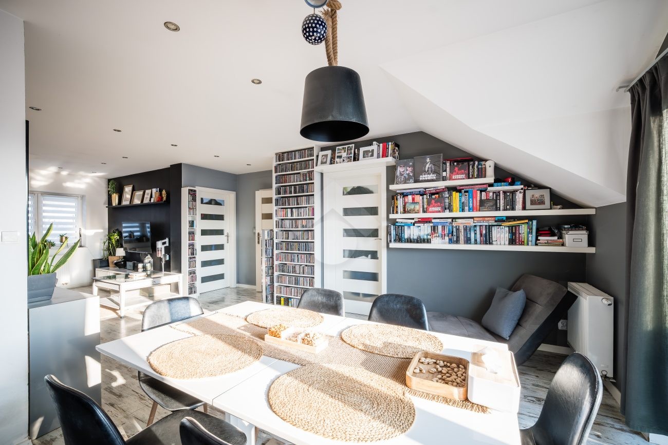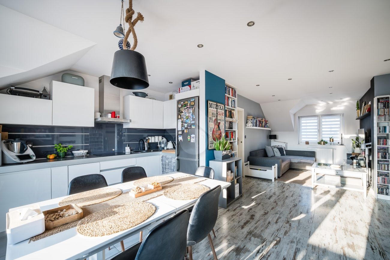 Aneks kuchenny wyposażony jest w zabudowę meblową oraz komplet sprzętu AGD, w tym piekarnik, płytę indukcyjną, zmywarkę, okap oraz lodówkę z zamrażarką. Na podłogach znajdują się panele, natomiast w łazience, przedpokoju oraz części kuchennej położono płytki. Ogrzewanie centralne gazowe pochodzi z osiedlowej kotłowni. Dodatkowo do dyspozycji jest strych, który zapewnia dodatkowe miejsce do przechowywania.