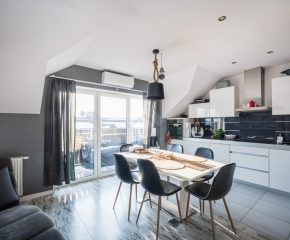 Mieszkanie ma dwustronną ekspozycję północno-wschodnią i południowo-zachodnią, dzięki czemu jest dobrze doświetlone przez cały dzień. Salon z ekspozycją południowo-zachodnią sprawia, że wnętrze pozostaje jasne przez większość dnia. Dodatkowym atutem jest klimatyzacja, która znacząco podnosi komfort użytkowania.