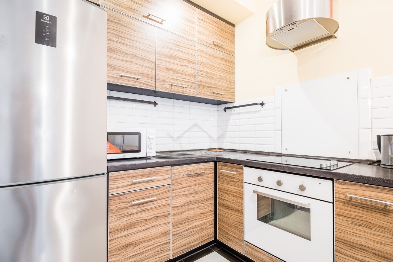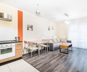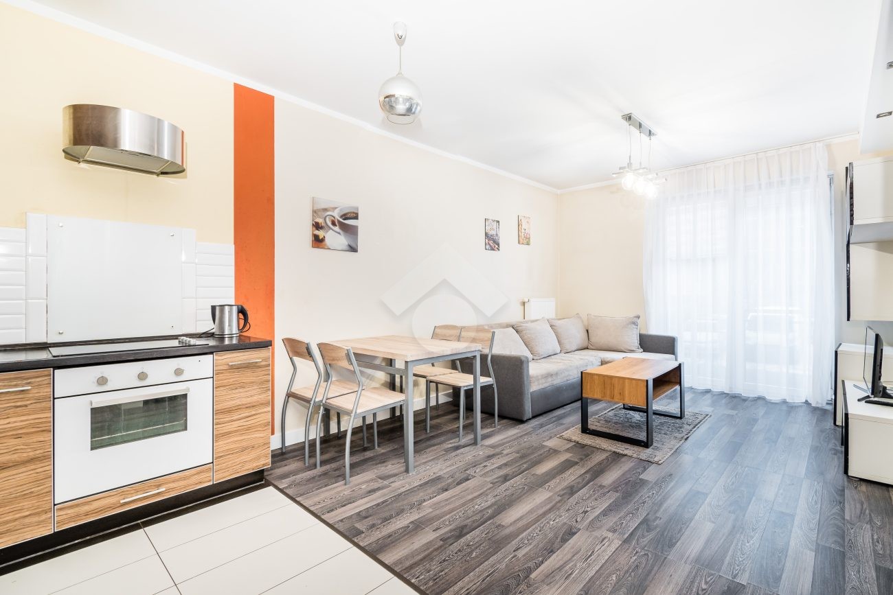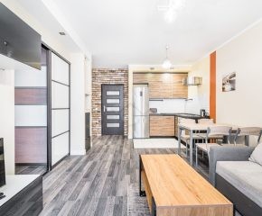 Salon z aneksem kuchennym jest w pełni wyposażony: narożna rozkładana sofa, stolik kawowy, szafki do przechowywania, telewizor, stół z krzesłami oraz zabudowa kuchenna z piekarnikiem, płytą indukcyjną, okapem i lodówką z zamrażarką. W łazience znajduje się prysznic, szafka z umywalką, pralka oraz toaleta. Sypialnia wyposażona jest w duże, podwójne łóżko oraz pojemną szafę w zabudowie.