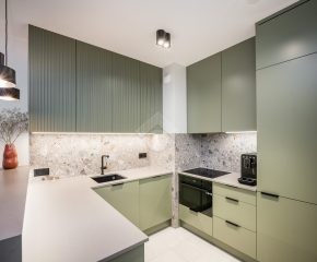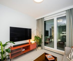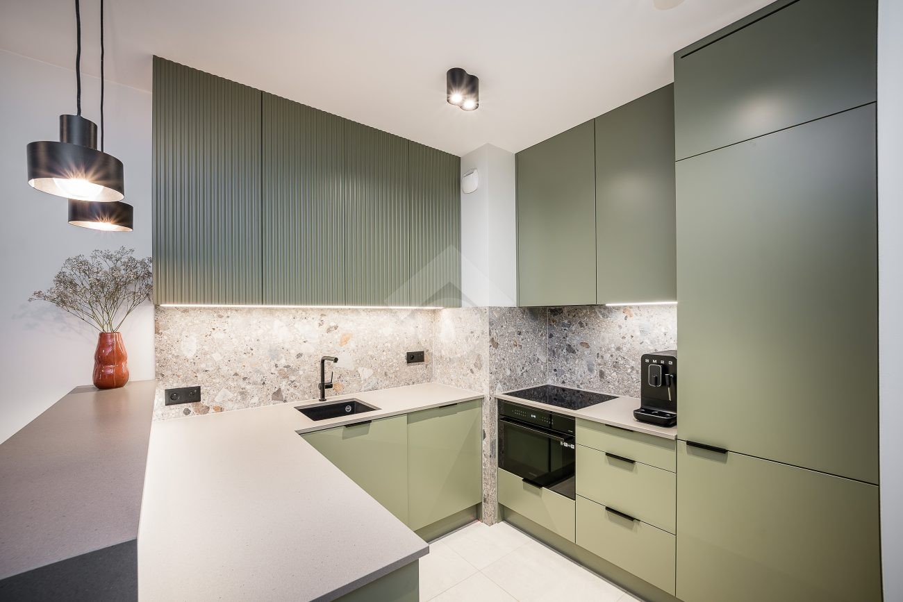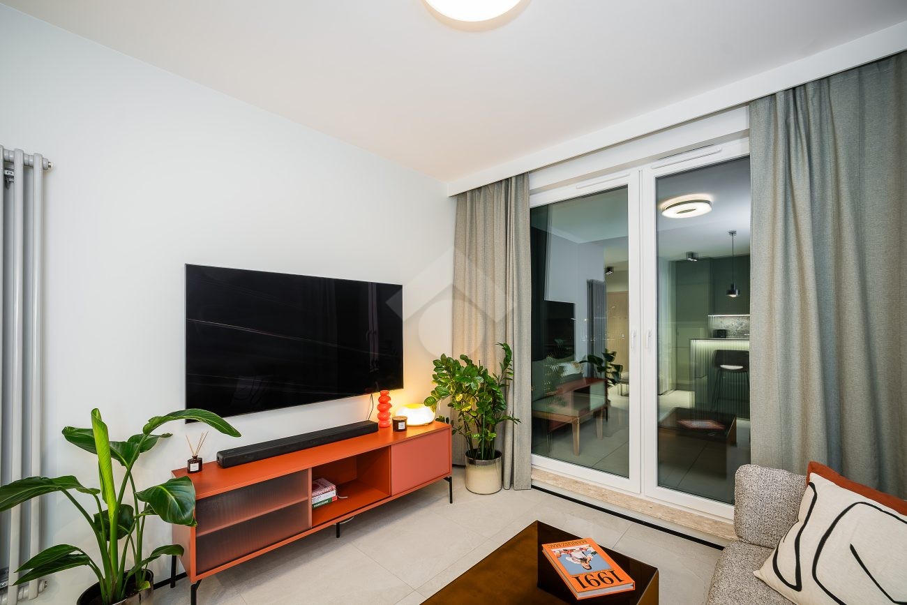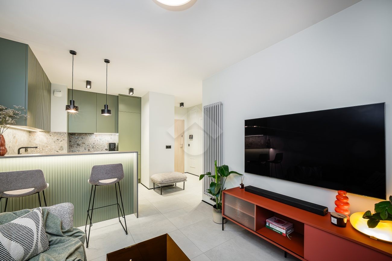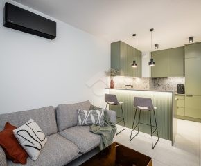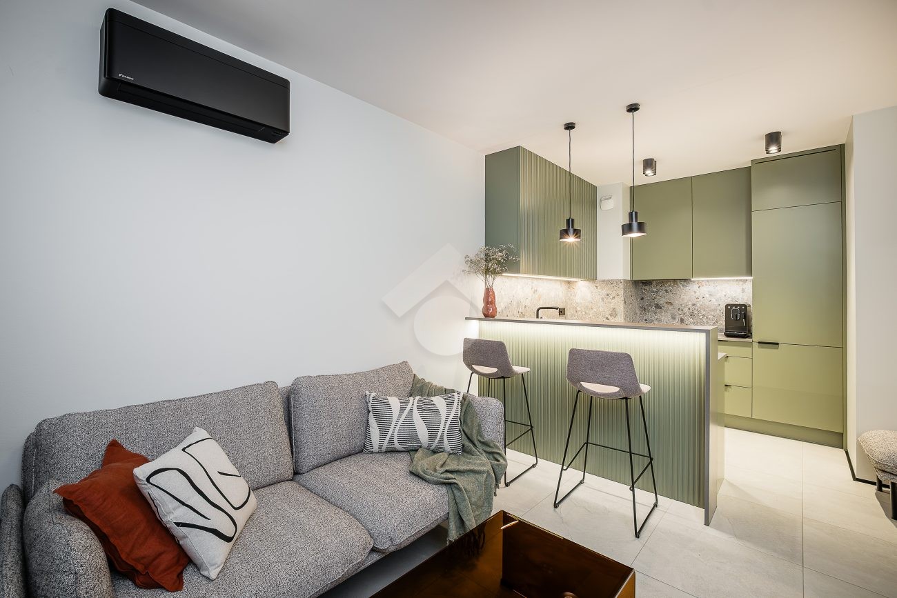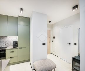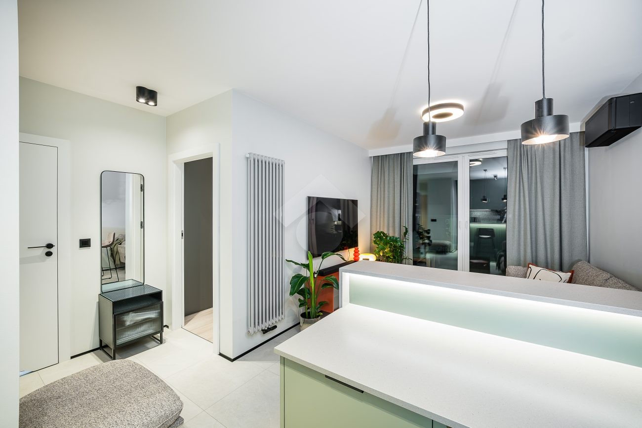 Mieszkanie wykończone jest w eleganckim stylu, pełne elementów dodających nieruchomości luksusowy klimat, takich jak meble wykonane pod wymiar od stolarza, kamienne blaty, inteligentne oświetlenie oraz pełne wysokiej jakości wyposażenie (włącznie z elektro-sprzętami).