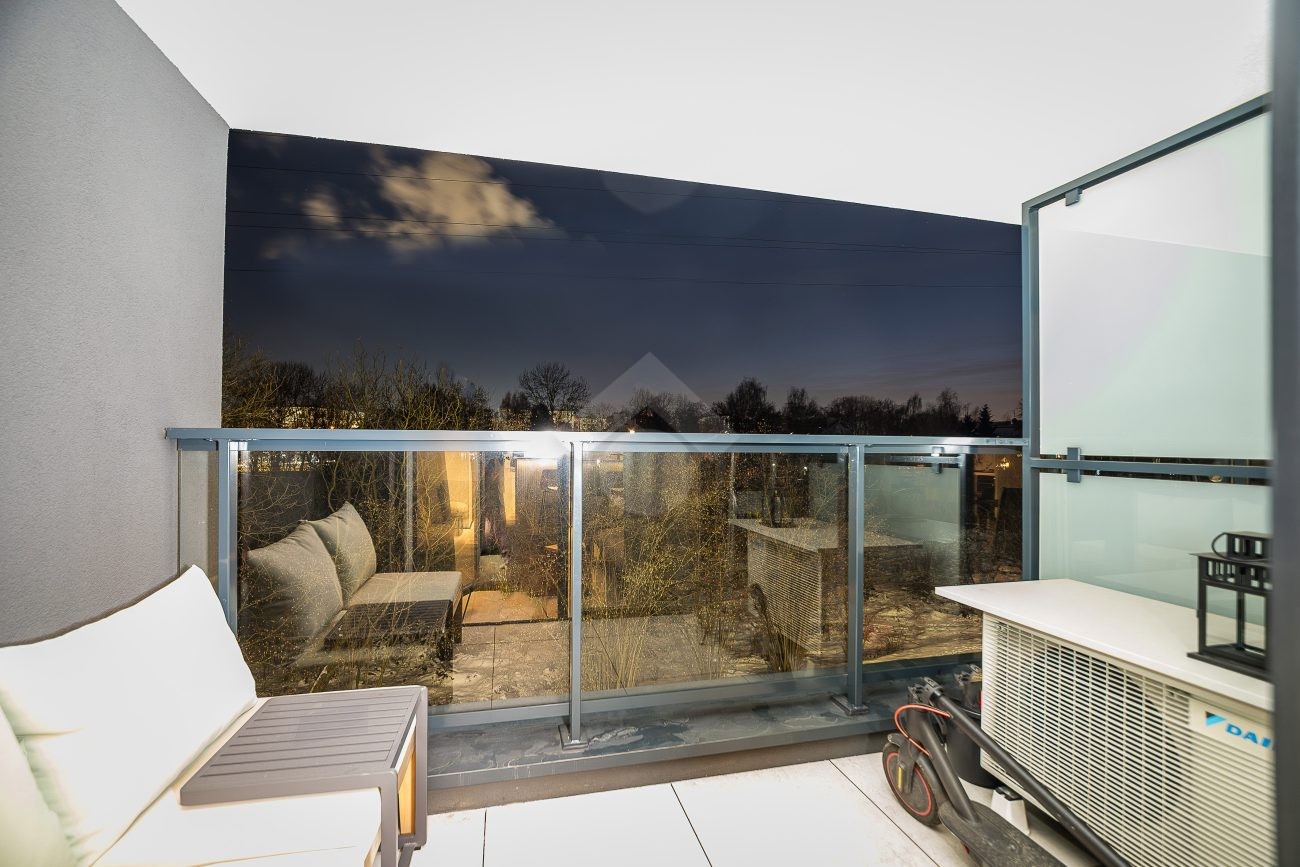 Bezpośrednio z salonu możemy wyjść na loggię, gdzie znajduje się zestaw wypoczynkowy i rozprzestrzenia się widok na otaczają zieleń.