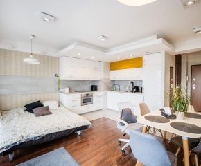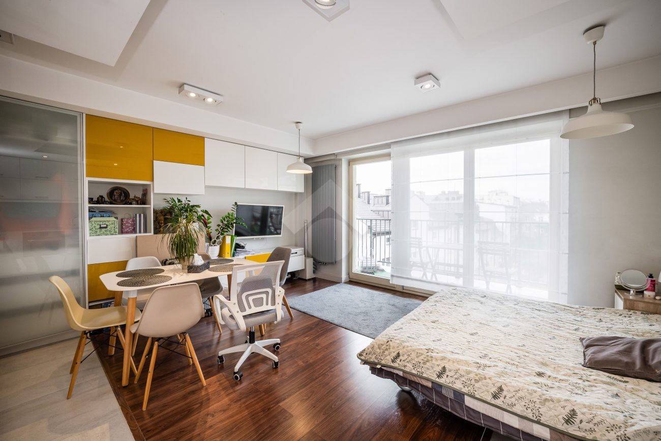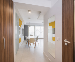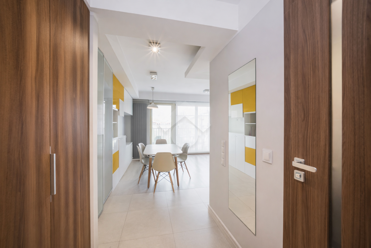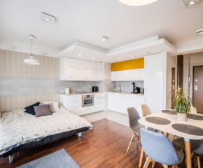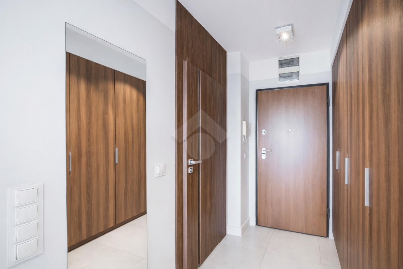 Stan mieszkania: Mieszkanie wykończone w wysokim standardzie, zaprojektowane przez architekta z dbałością o funkcjonalność i estetykę. W zabudowie znajdują się meble wykonane na wymiar, a w aneksie kuchennym zastosowano trwały i elegancki blat z granitu. Na podłogach w przedpokoju i łazience położono gres, natomiast w części dziennej deskę panelową. Łazienka w pełni wyposażona – prysznic, WC, umywalka oraz pralka. Dodatkowym udogodnieniem jest zamontowane radio oraz podgrzewane lustro zapobiegające parowaniu.