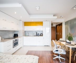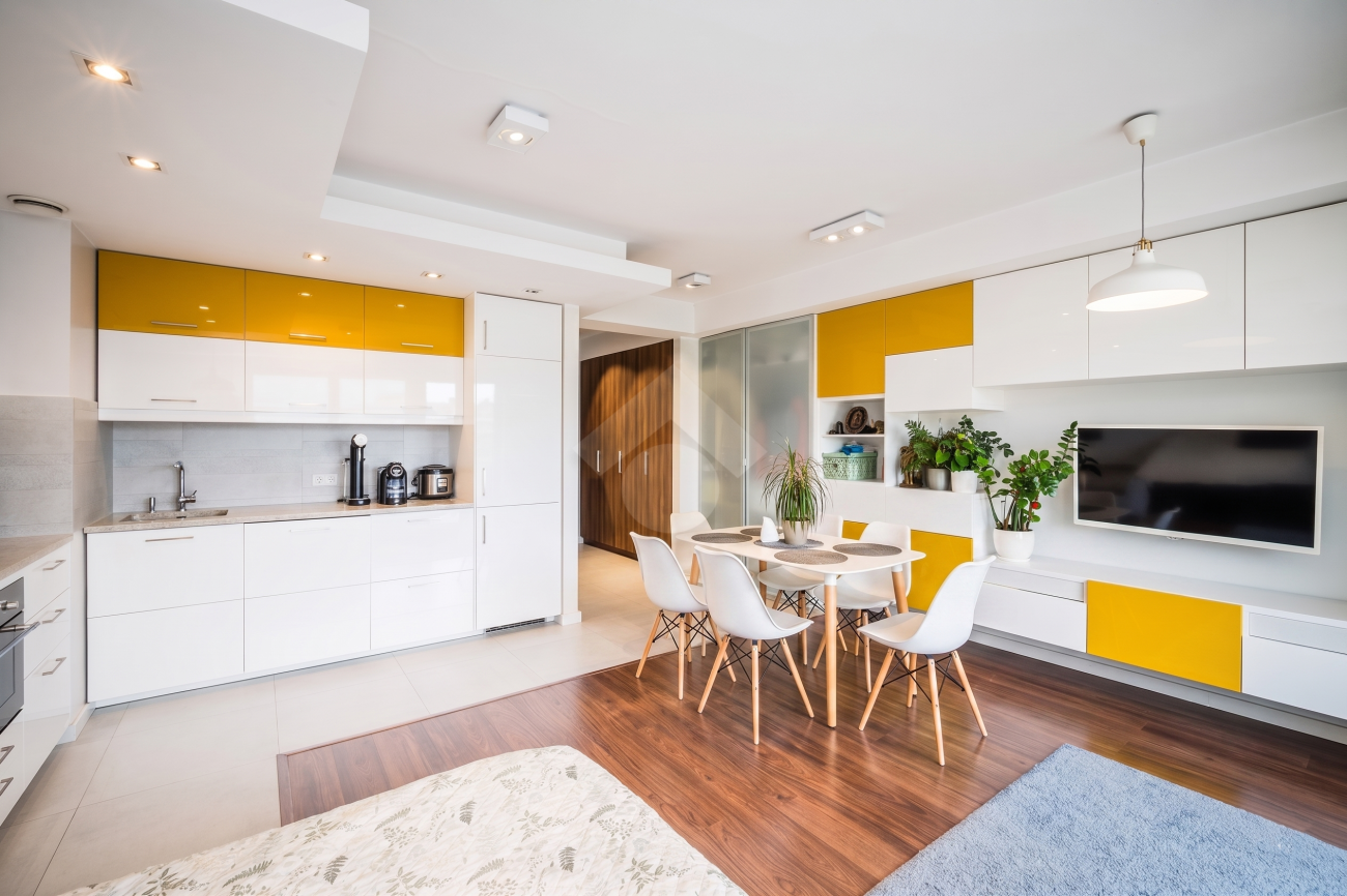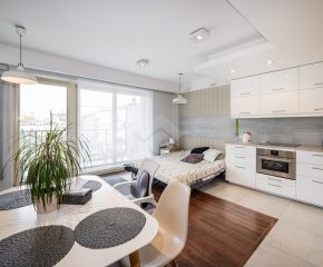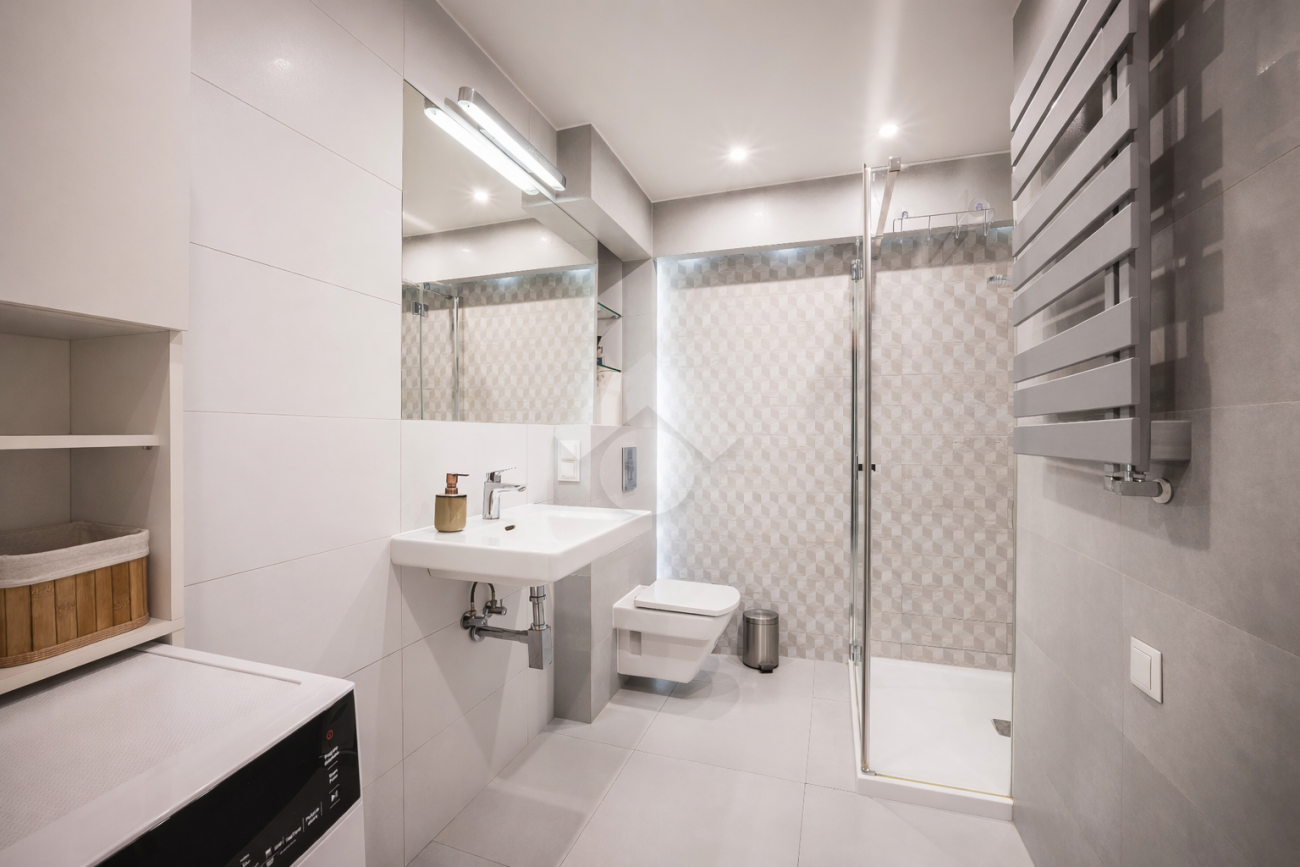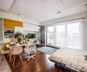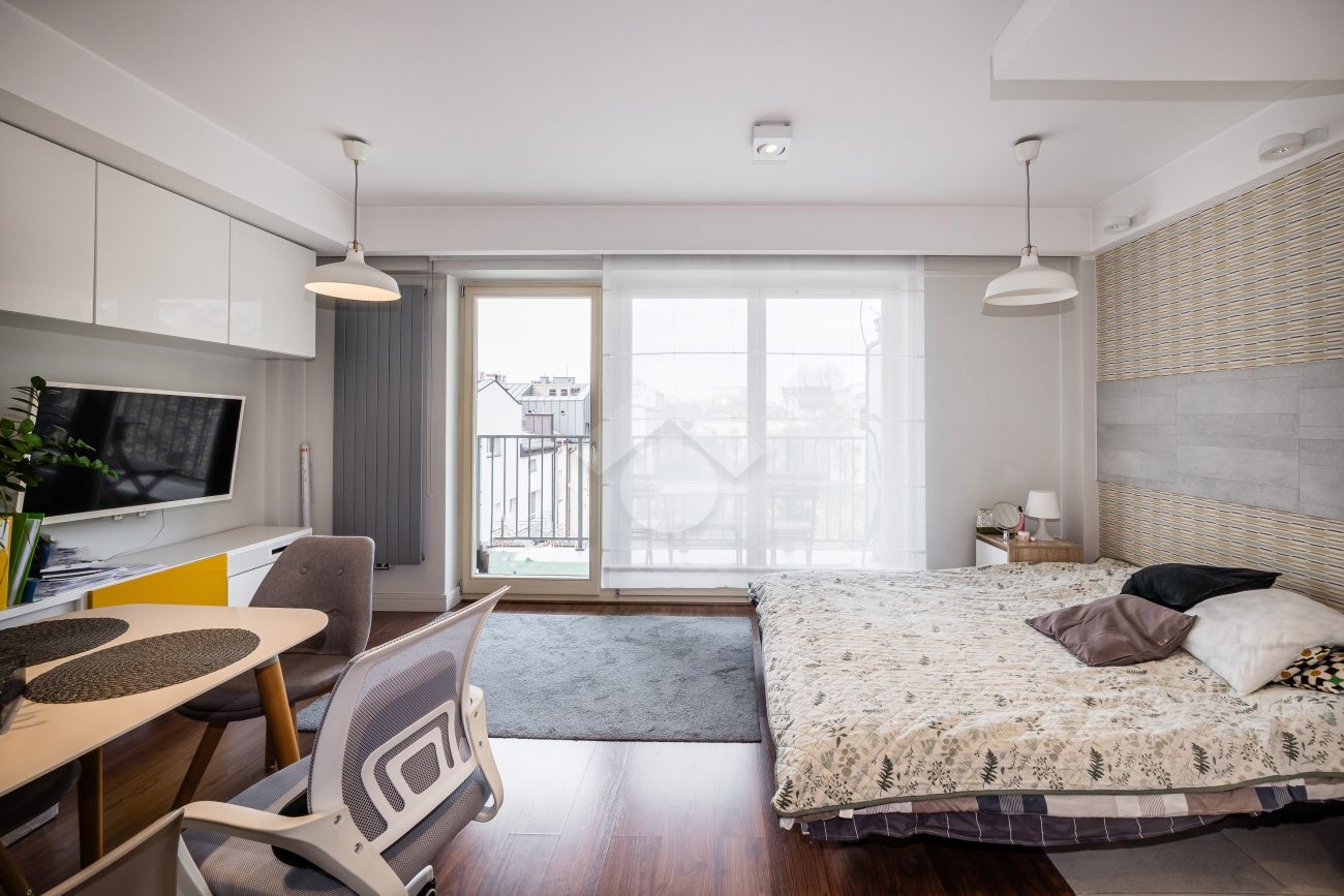 Stan mieszkania: Mieszkanie wykończone w wysokim standardzie, zaprojektowane przez architekta z dbałością o funkcjonalność i estetykę. W zabudowie znajdują się meble wykonane na wymiar, a w aneksie kuchennym zastosowano trwały i elegancki blat z granitu. Na podłogach w przedpokoju i łazience położono gres, natomiast w części dziennej deskę panelową. Łazienka w pełni wyposażona – prysznic, WC, umywalka oraz pralka. Dodatkowym udogodnieniem jest zamontowane radio oraz podgrzewane lustro zapobiegające parowaniu.