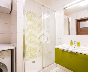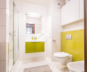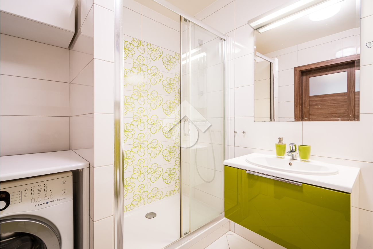 Łazienka została wyposażona w przestronny prysznic (120×80 cm), umywalkę, toaletę, bidet, pralkę oraz praktyczne szafki do przechowywania.