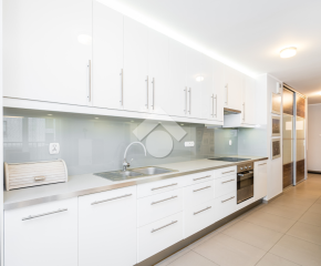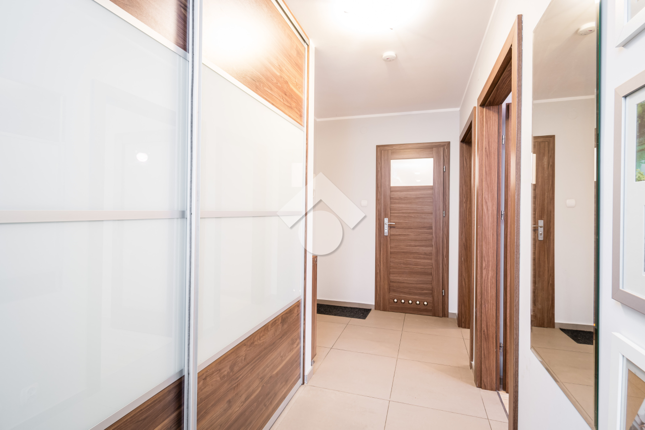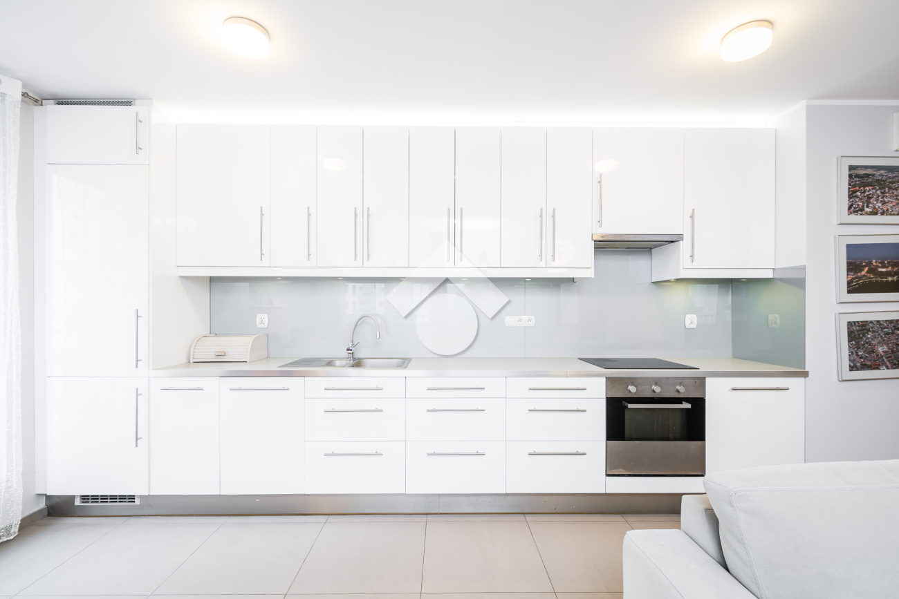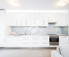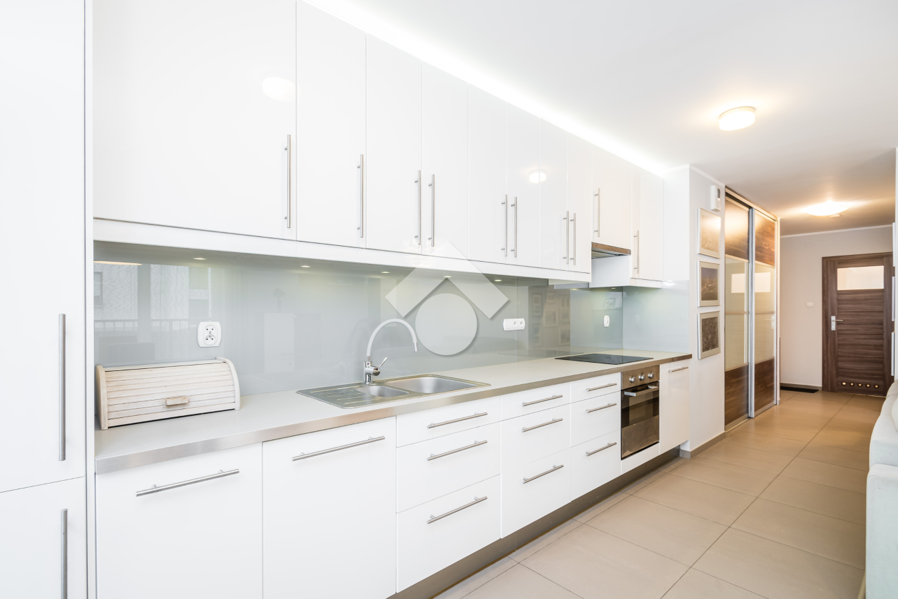 Wnętrze zostało funkcjonalnie zaprojektowane i wyposażone we wszystkie niezbędne sprzęty, takie jak: zmywarka, pralka, lodówka z zamrażarką oraz kuchenka z piekarnikiem.