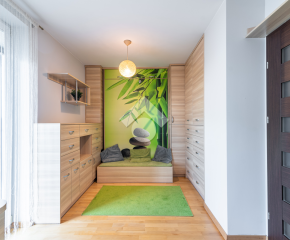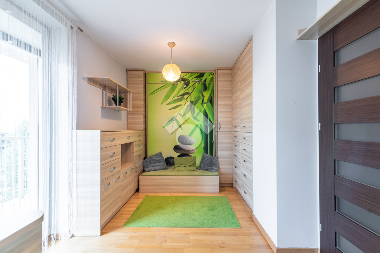Sypialnia została wyposażona w funkcjonalne, rozkładane łóżko montowane na ścianie (tzw. łóżko w zabudowie), które pozwala na maksymalne wykorzystanie przestrzeni w ciągu dnia. Dodatkowo w pomieszczeniu znajduje się nowoczesna meblościanka z licznymi półkami i szafkami, zapewniająca dużo miejsca do przechowywania. Dzięki przemyślanemu układowi wnętrze łączy wygodę z praktycznością. Przedpokój również wyposażony jest w pojemną, zabudowaną szafę.