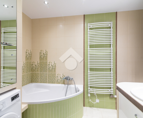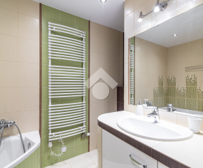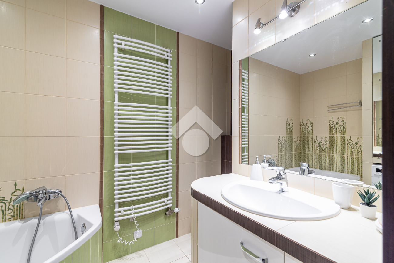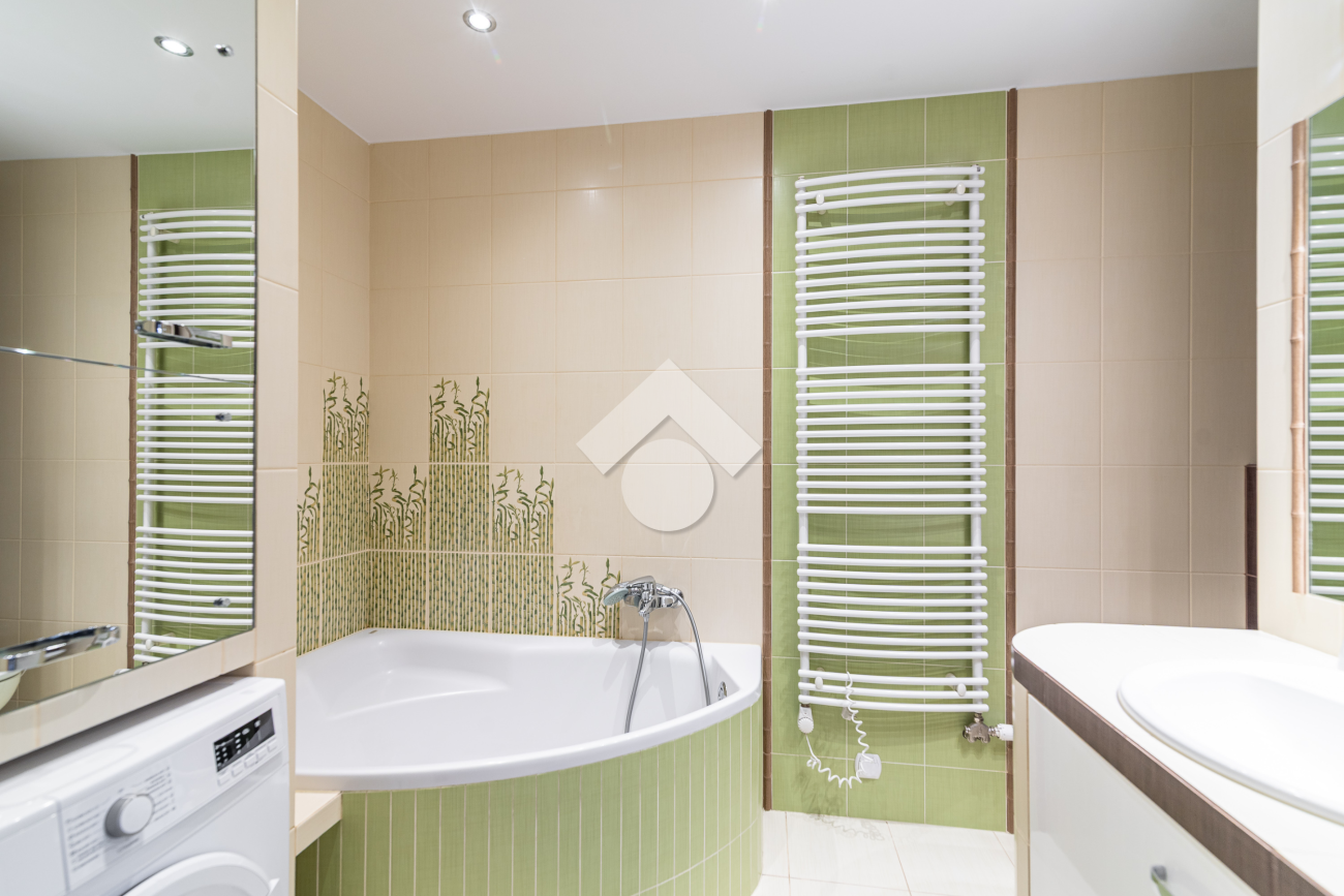Łazienka została wyposażona w wannę, umywalkę, toaletę, pralkę oraz praktyczne szafki do przechowywania.