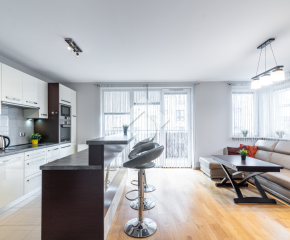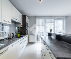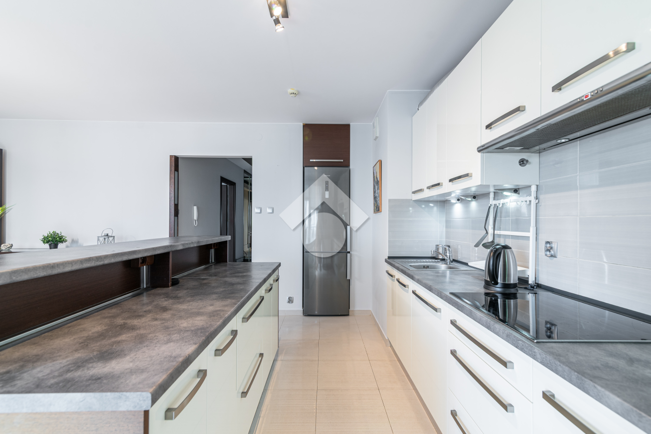 Wnętrze zostało funkcjonalnie zaprojektowane i wyposażone we wszystkie niezbędne sprzęty, takie jak: zmywarka, pralka, lodówka z zamrażarką, mikrofalówka oraz kuchenka z piekarnikiem.