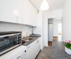 Całkowicie odnowiono również łazienkę, osobną toaletę oraz kuchnię – wszystkie te pomieszczenia zyskały nowoczesny, świeży wygląd.