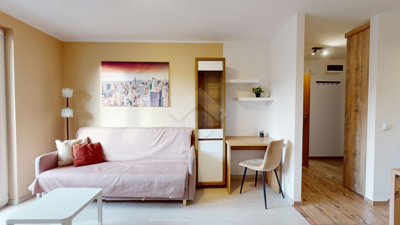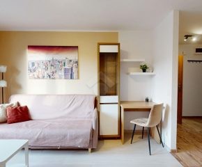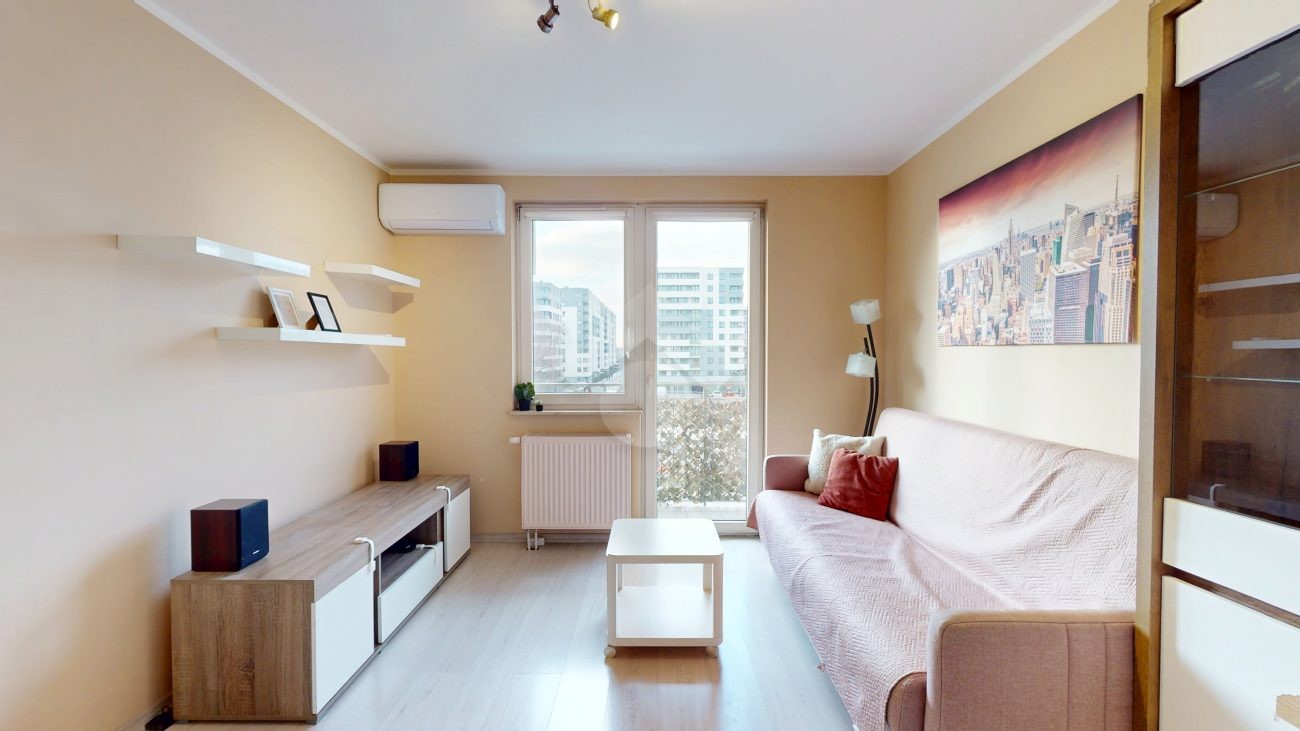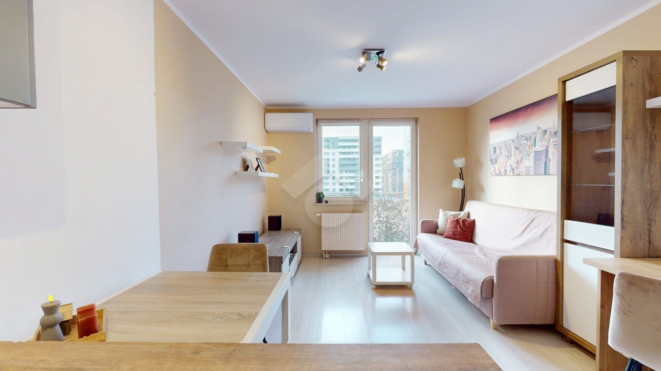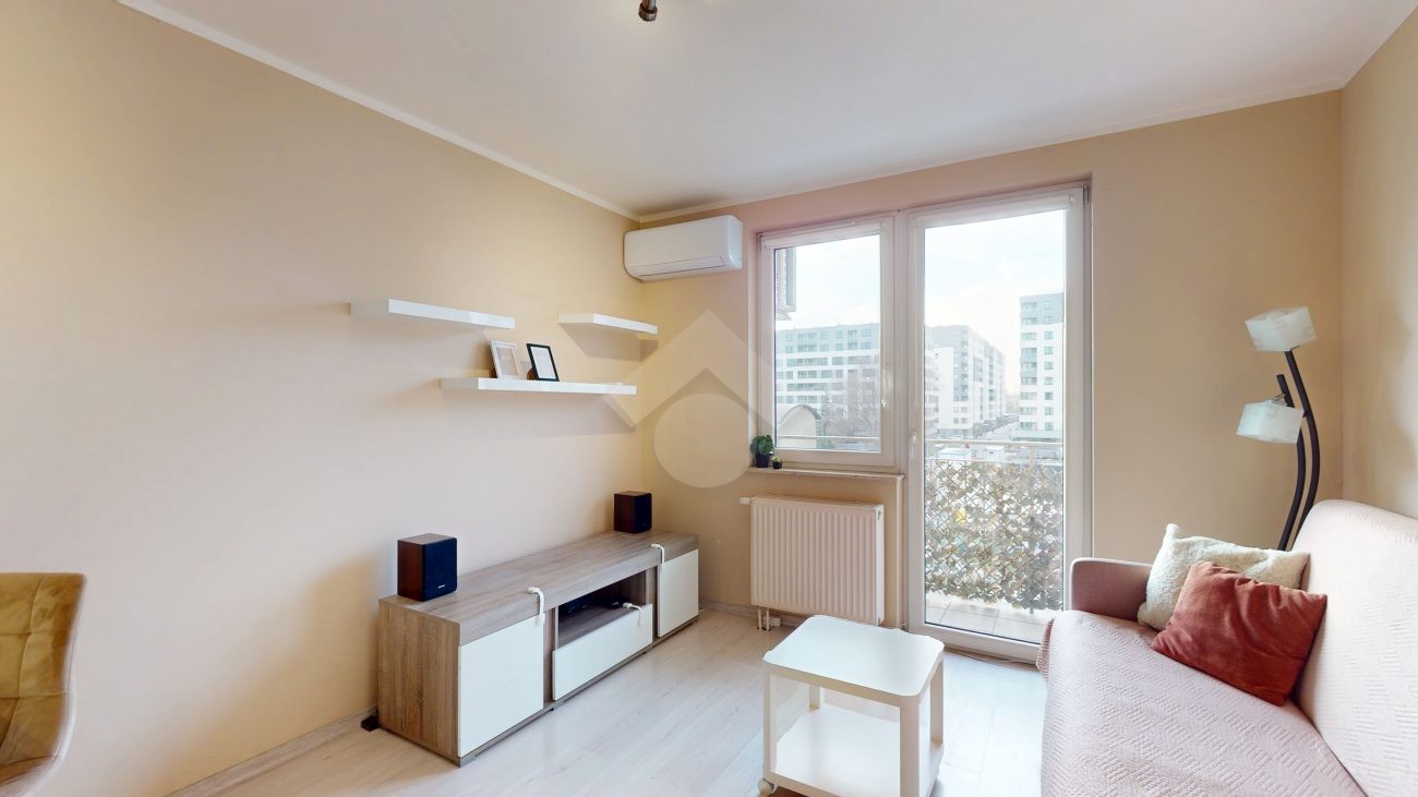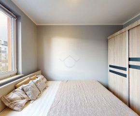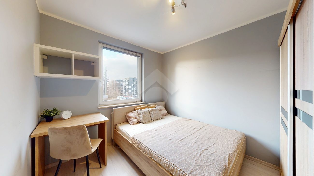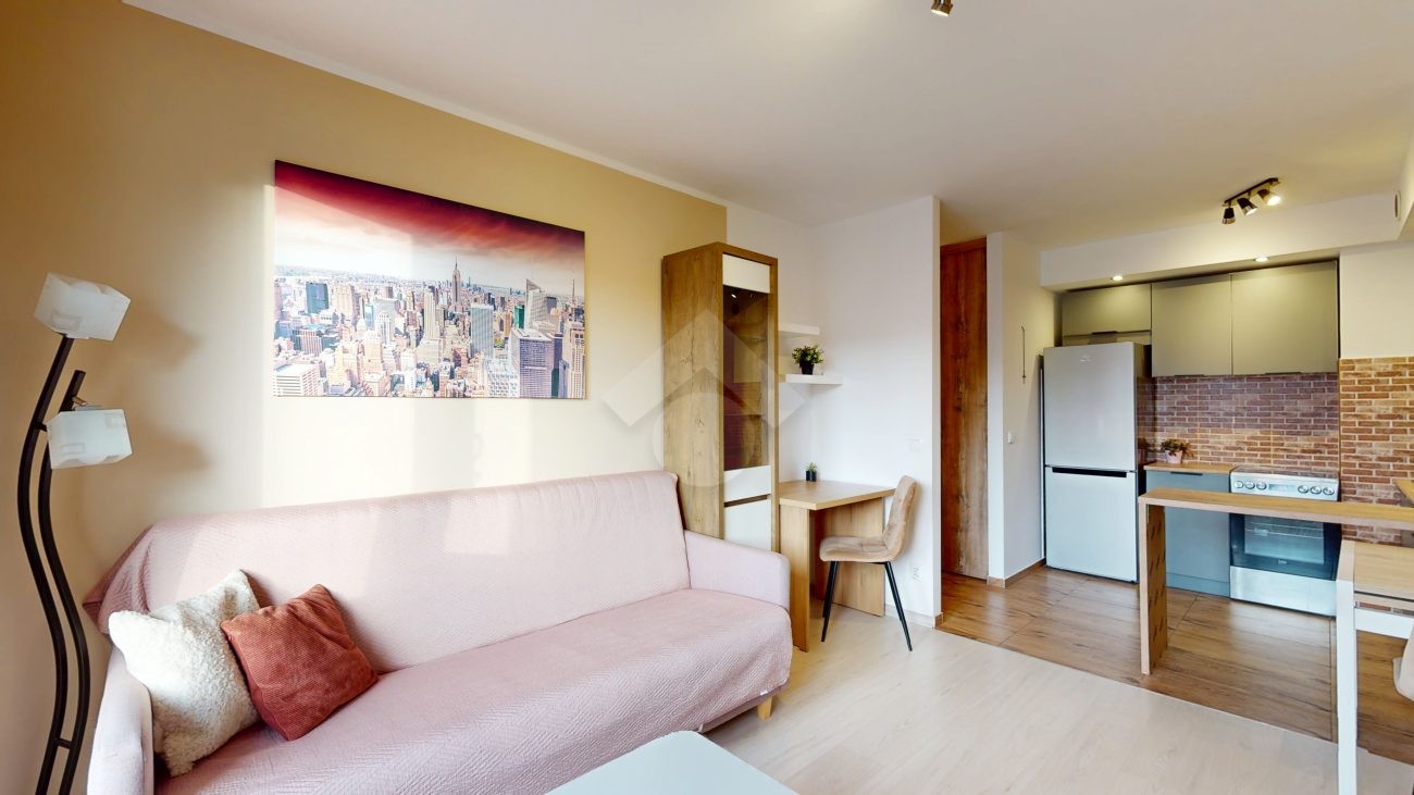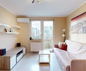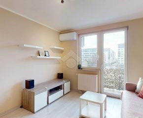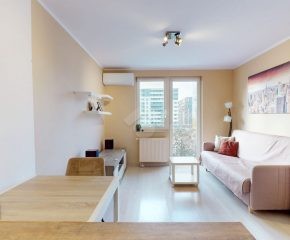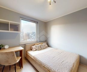 Mieszkanie w stanie do zamieszkania. Na podłodze w pokoju dziennym i sypialni panele, a w przedpokoju, aneksie kuchennym i łazience płytki. Pokój dzienny wyposażony w rozkładaną sofę, szafki pod RTV, komodę oraz biurko. Dodatkowo została wydzielona część jadalniana, w której znajduje się stół z dwoma krzesłami. W aneksie kuchennym, która była wymieniana 4 lata temu – do dyspozycji jest zabudowa kuchenna, płyta elektryczna, piekarnik, lodówka z zamrażarką oraz dużo blatu roboczego i miejsca do przechowywania. W łazience – prysznic, toaleta, pralka z gwarancją. W sypialni pojemna szafa, dwuosobowe łóżko, biurko z miejscem do pracy. W przedpokoju znajduje się szafa. Dodatkowym atutem jest klimatyzacja. Balkon wyposażony w stół oraz krzesła. Brak gazu w mieszkaniu. Ogrzewanie oraz ciepła woda z sieci miejskiej.