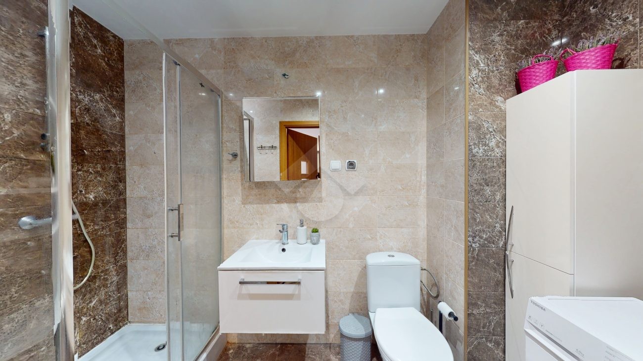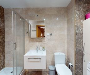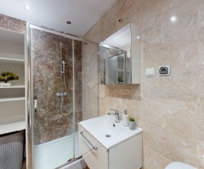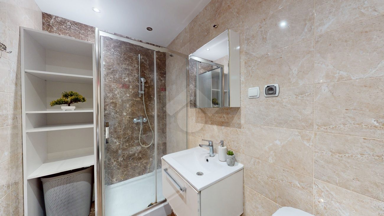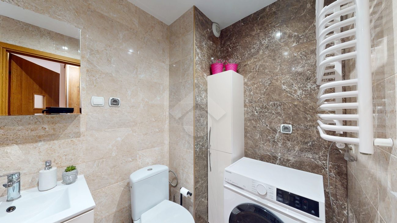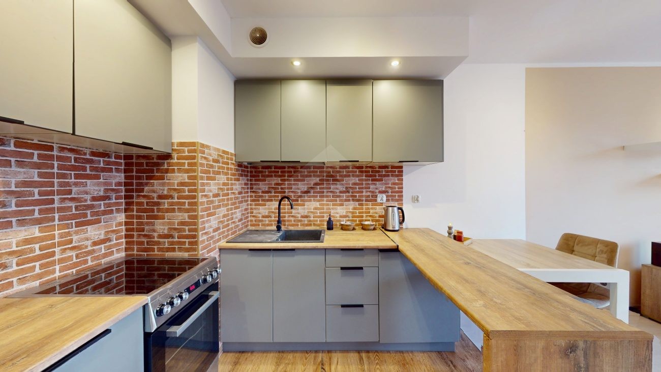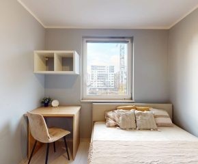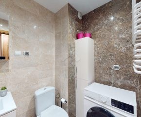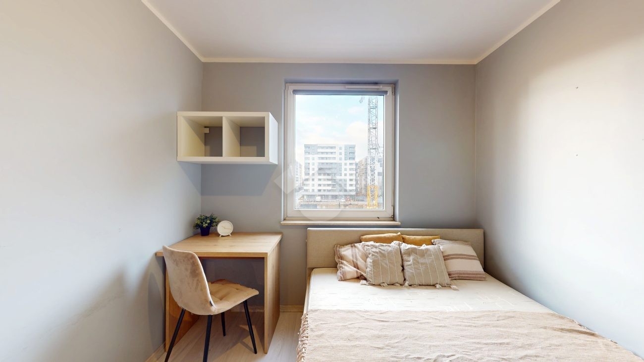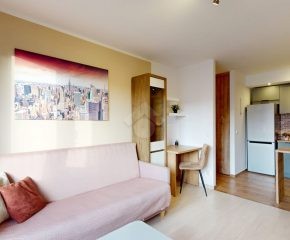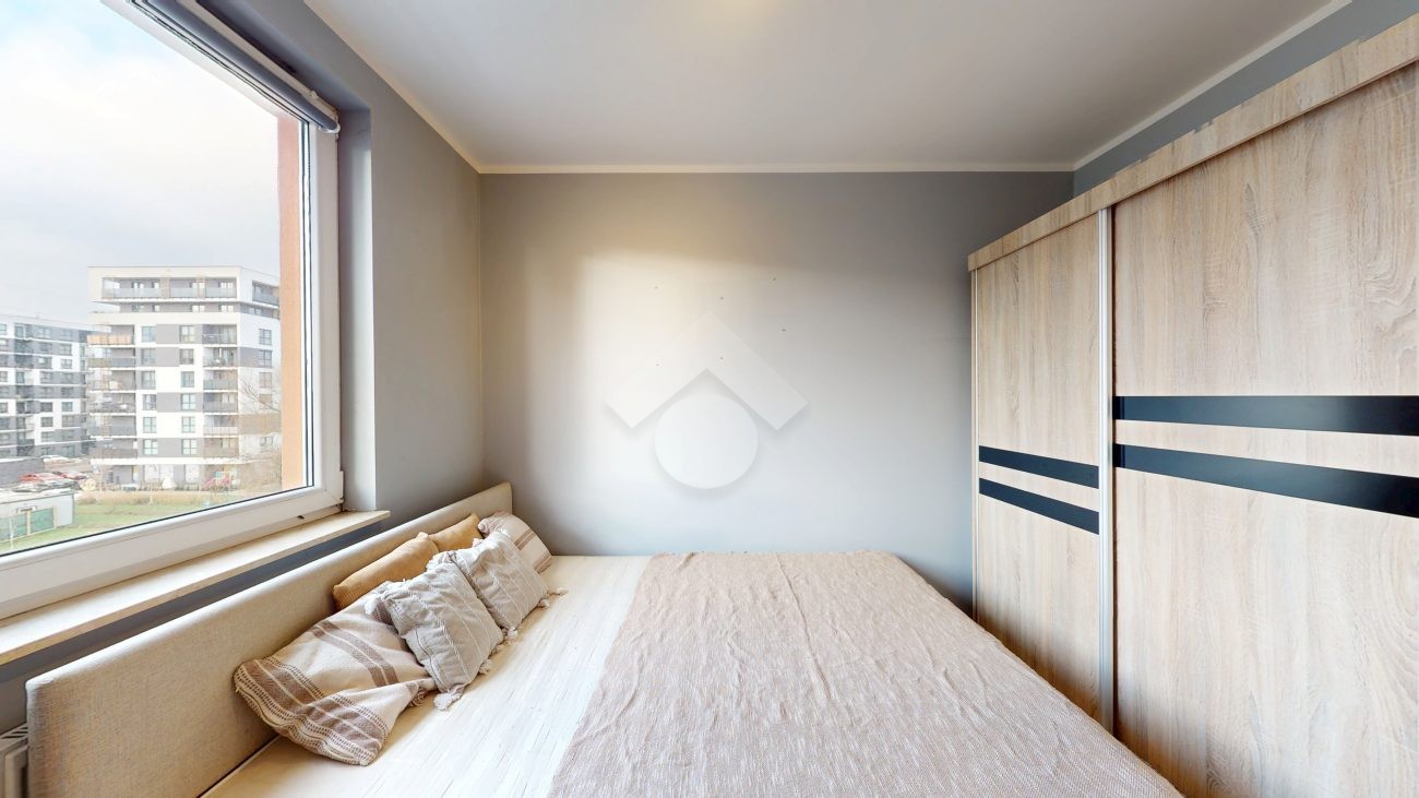 Mieszkanie w stanie do zamieszkania. Na podłodze w pokoju dziennym i sypialni panele, a w przedpokoju, aneksie kuchennym i łazience płytki. Pokój dzienny wyposażony w rozkładaną sofę, szafki pod RTV, komodę oraz biurko. Dodatkowo została wydzielona część jadalniana, w której znajduje się stół z dwoma krzesłami. W aneksie kuchennym, która była wymieniana 4 lata temu – do dyspozycji jest zabudowa kuchenna, płyta elektryczna, piekarnik, lodówka z zamrażarką oraz dużo blatu roboczego i miejsca do przechowywania. W łazience – prysznic, toaleta, pralka z gwarancją. W sypialni pojemna szafa, dwuosobowe łóżko, biurko z miejscem do pracy. W przedpokoju znajduje się szafa. Dodatkowym atutem jest klimatyzacja. Balkon wyposażony w stół oraz krzesła. Brak gazu w mieszkaniu. Ogrzewanie oraz ciepła woda z sieci miejskiej.