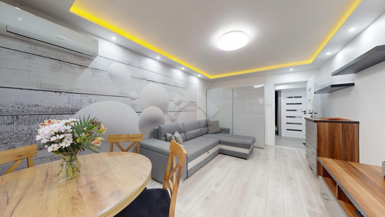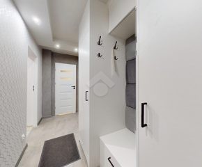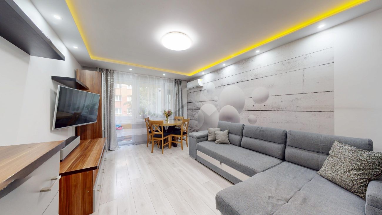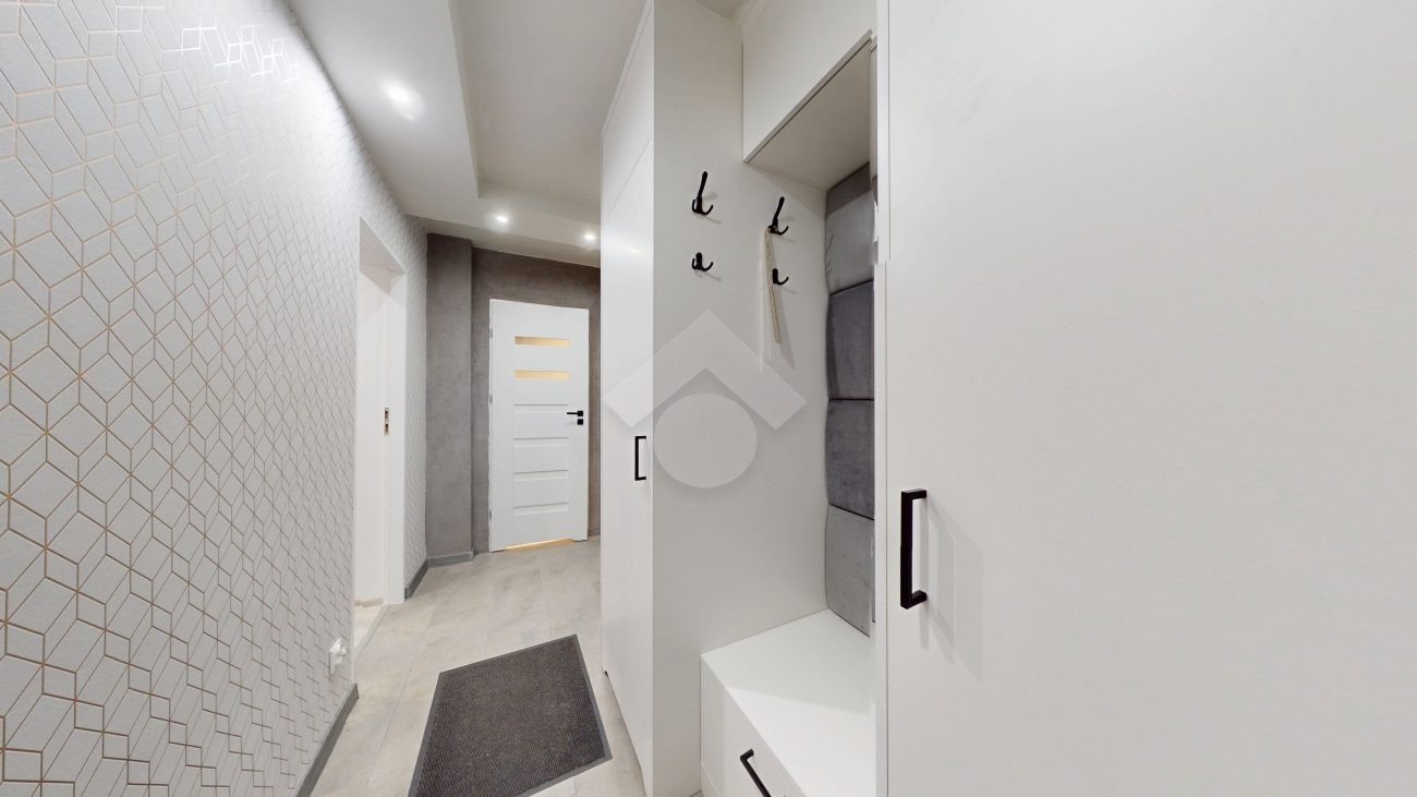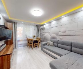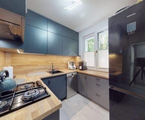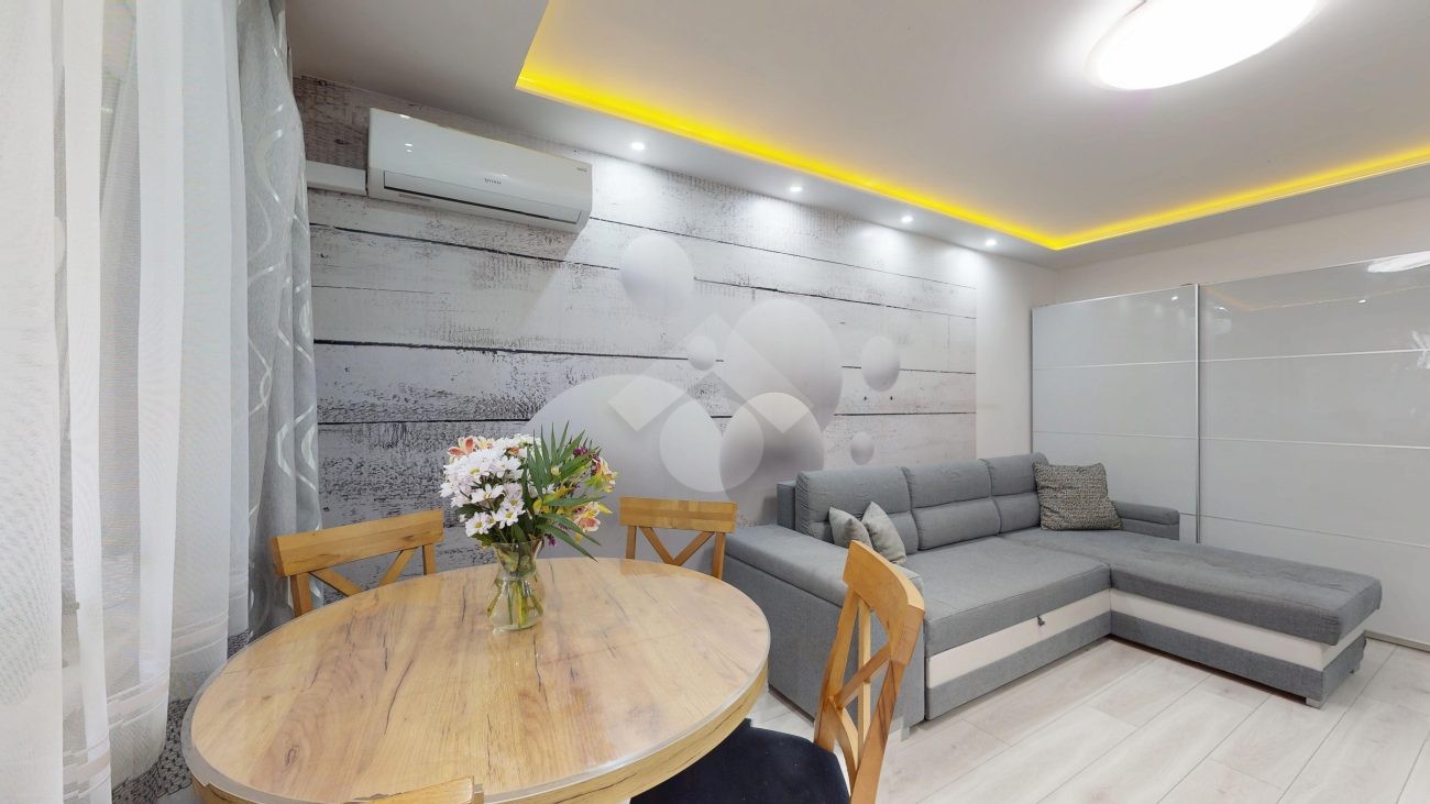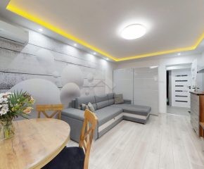 W salonie klimatyzacja, rozkładana kanapa, komoda, szafka RTV oraz stolik i krzesła. Kuchnia wyposażona w nową zabudowę kuchenną, zlew, zmywarkę, płytę gazową, piekarnik, okap oraz lodówkę. W pokoju duża szafa wnękowa, dwa rozkładane łóżka, biurko. Łazienka posiada wannę z prysznicem, szafki, pralkę oraz WC. Świeżo wykonana zabudowa w przedpokoju.