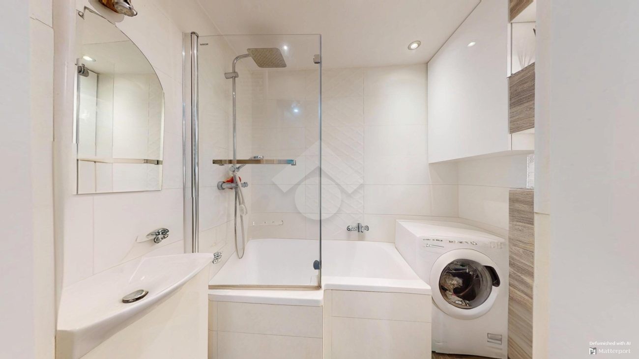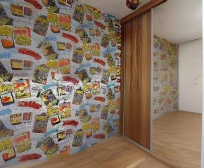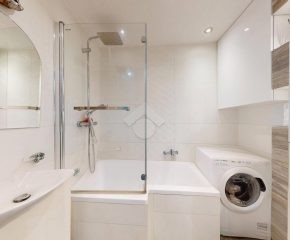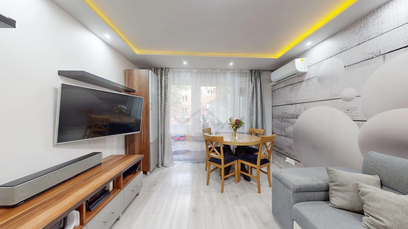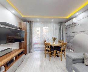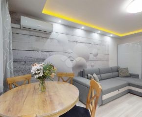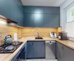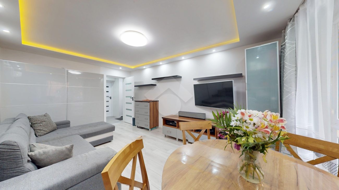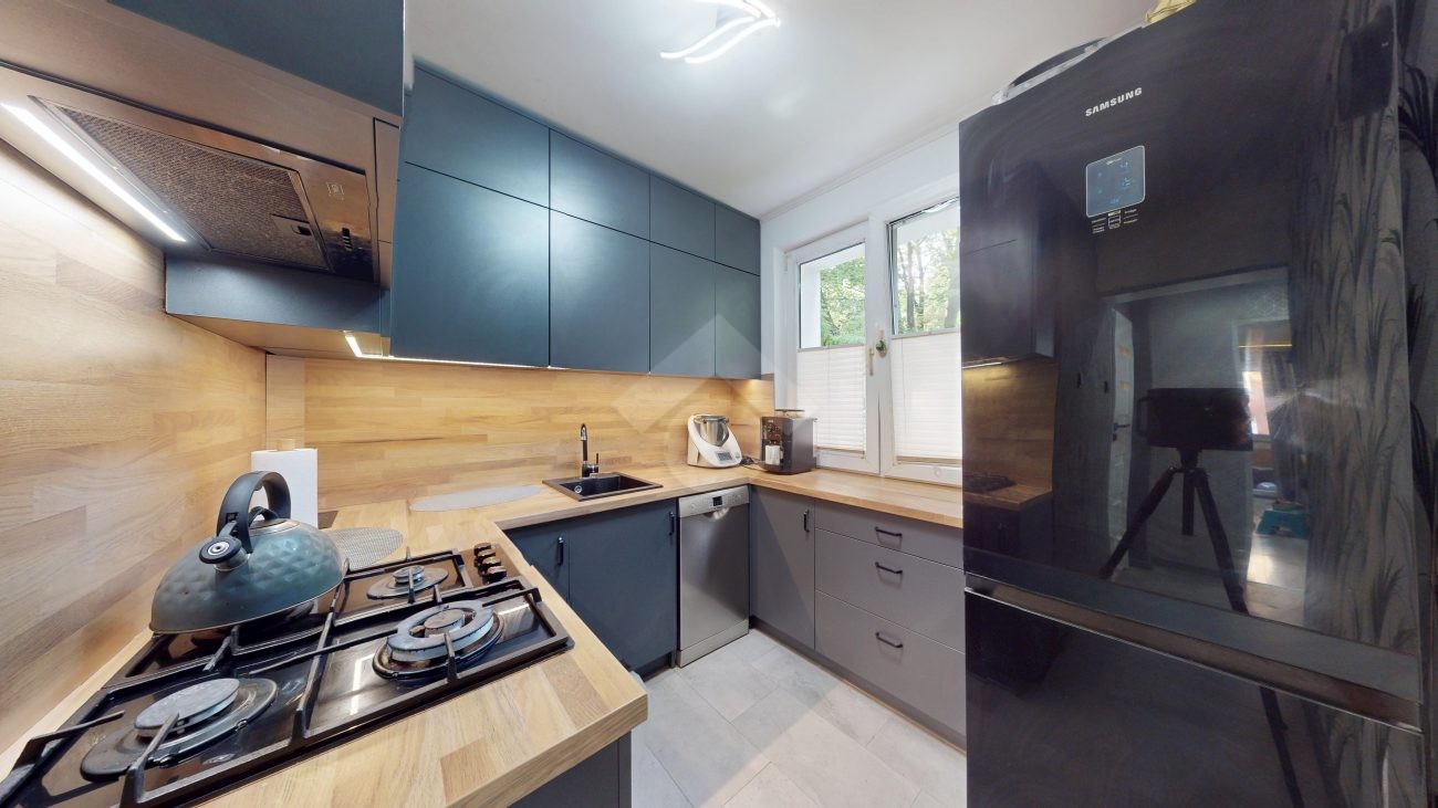 W salonie klimatyzacja, rozkładana kanapa, komoda, szafka RTV oraz stolik i krzesła. Kuchnia wyposażona w nową zabudowę kuchenną, zlew, zmywarkę, płytę gazową, piekarnik, okap oraz lodówkę. W pokoju duża szafa wnękowa, dwa rozkładane łóżka, biurko. Łazienka posiada wannę z prysznicem, szafki, pralkę oraz WC. Świeżo wykonana zabudowa w przedpokoju.