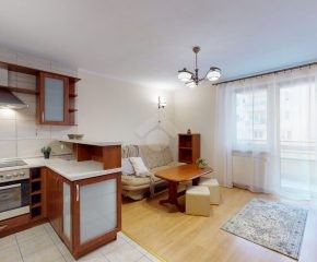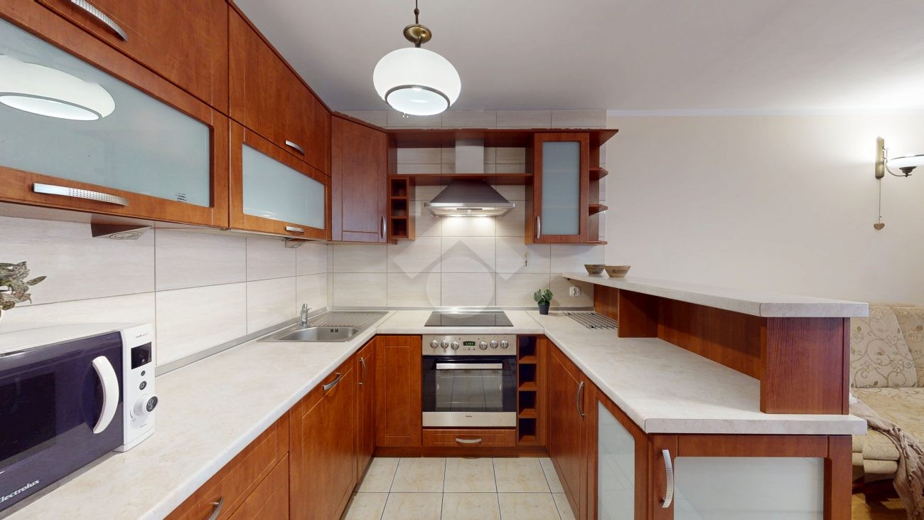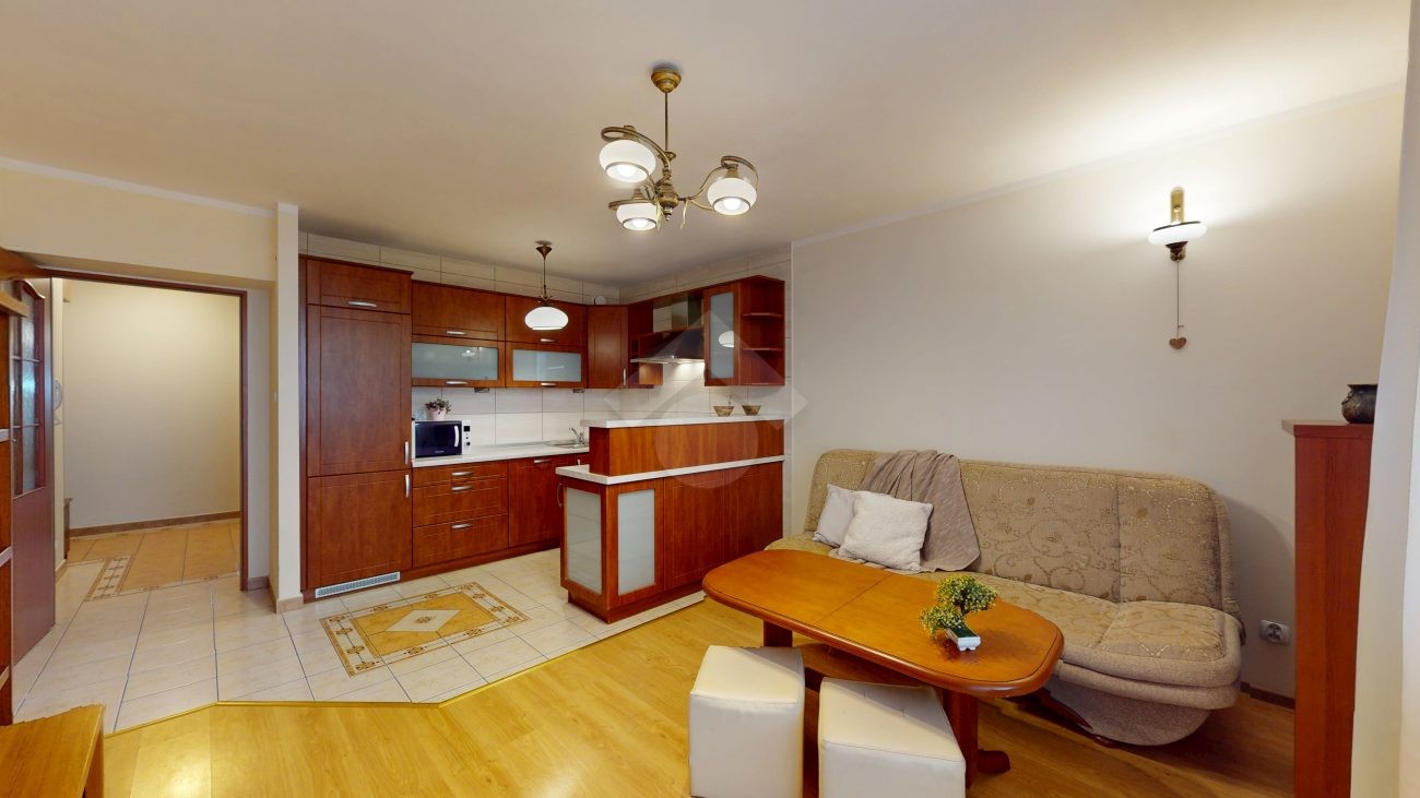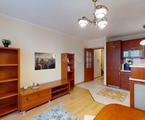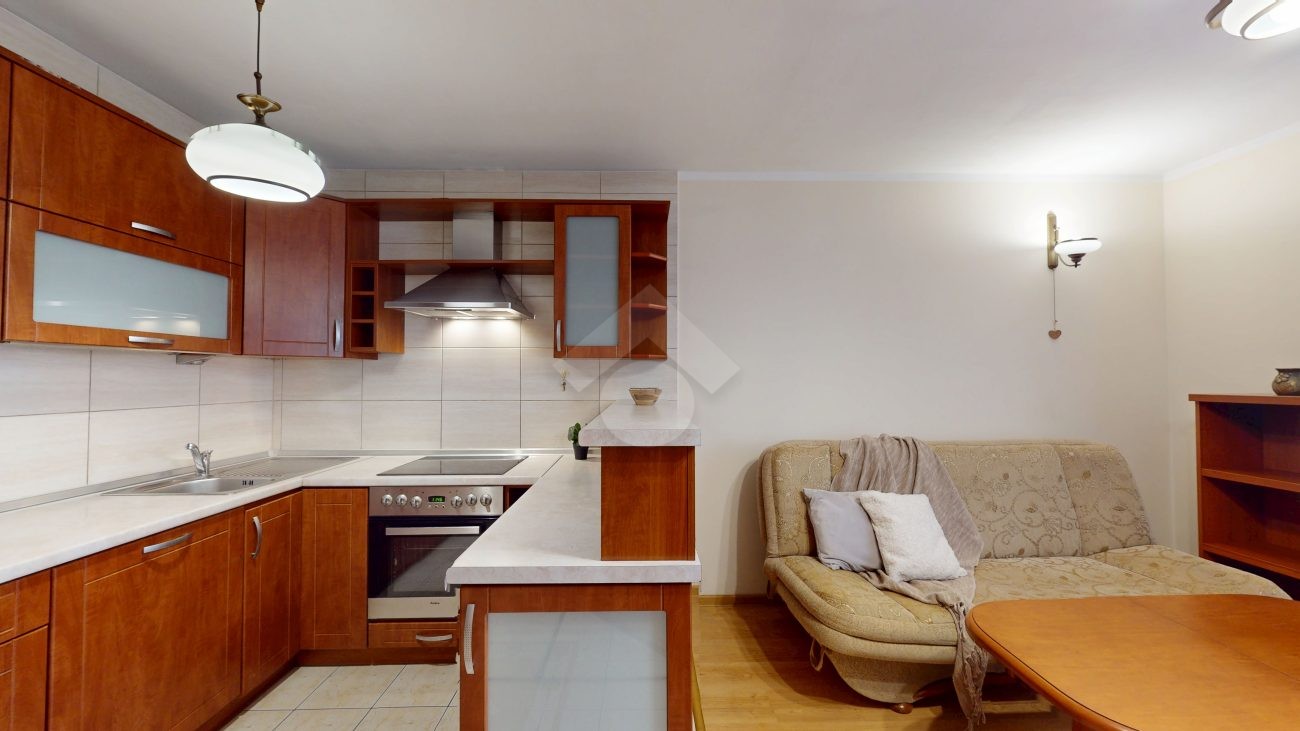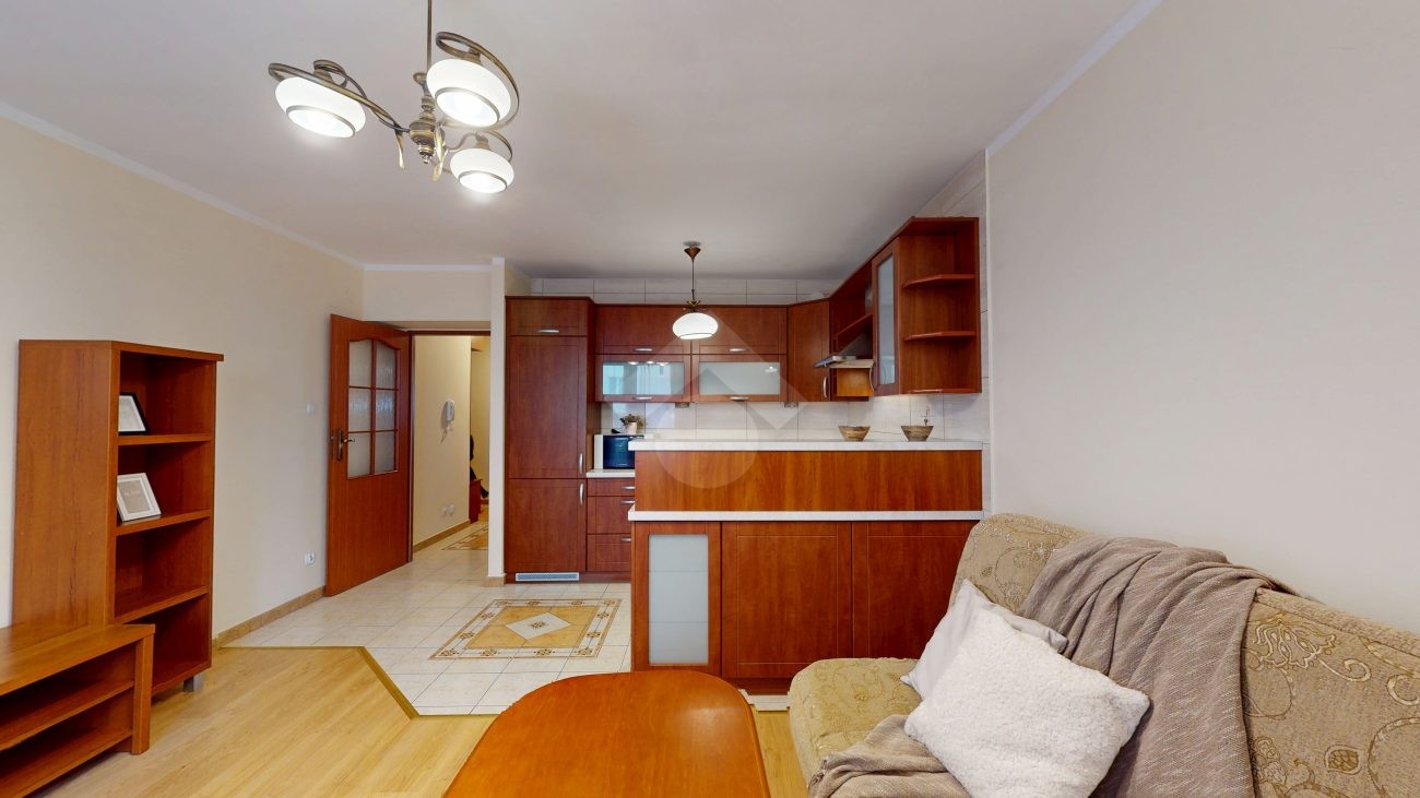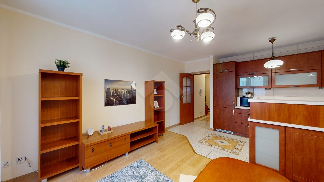 Mieszkanie jest w bardzo dobrym stanie. W salonie i sypialni na podłodze: panele, natomiast w części kuchennej, łazience, na przedpokoju są płytki. Nieruchomość jest w pełni wyposażona. W salonie znajduje się rozkładana kanapa, stolik kawowy, regały. W aneksie kuchennym: zabudowa kuchenna, piekarnik, płyta elektryczna, lodówka z zamrażarką w zabudowie, okap, mikrofalówka. Dużo miejsca do przechowywania oraz blatu roboczego. W sypialni znajduje się duże dwuosobowe łóżko komoda, regał oraz biurko. Łazienka wyposażona w toaletę, nową pralkę, wannę, umywalkę. Ogrzewanie oraz ciepła woda pochodzą z sieci miejskiej. Brak gazu.