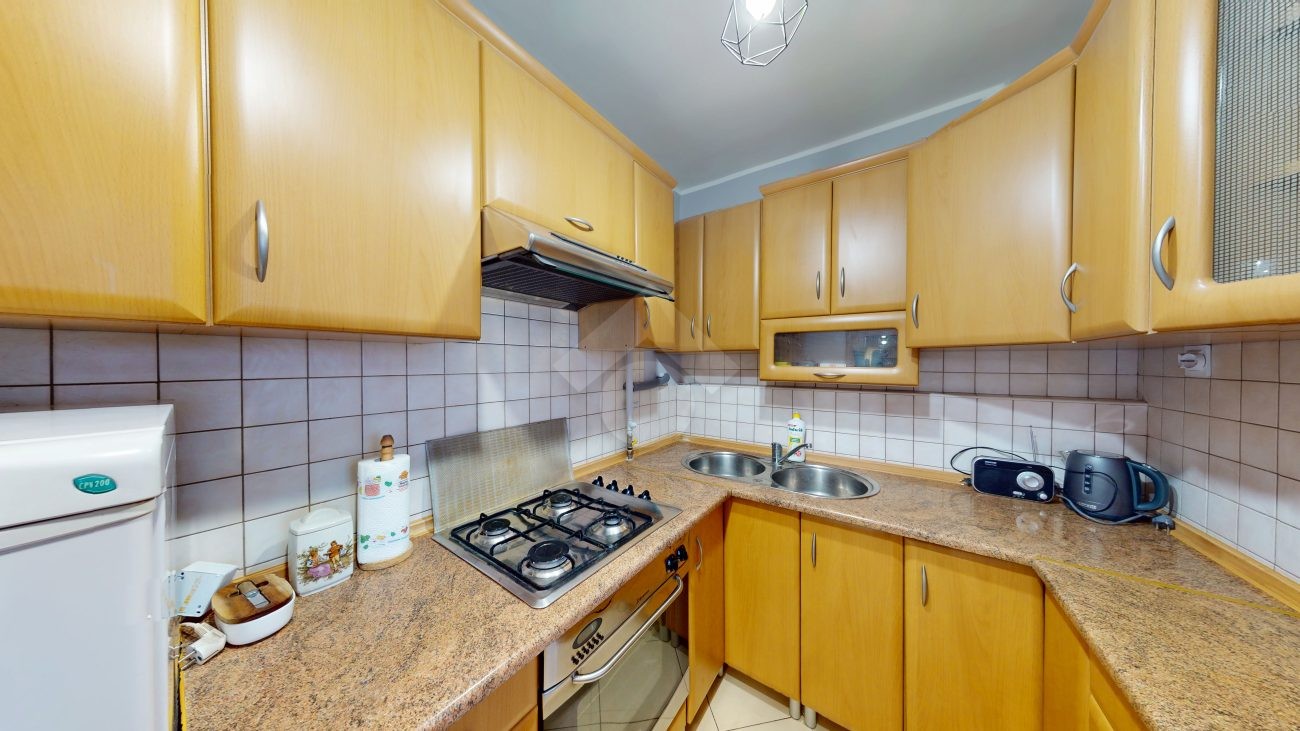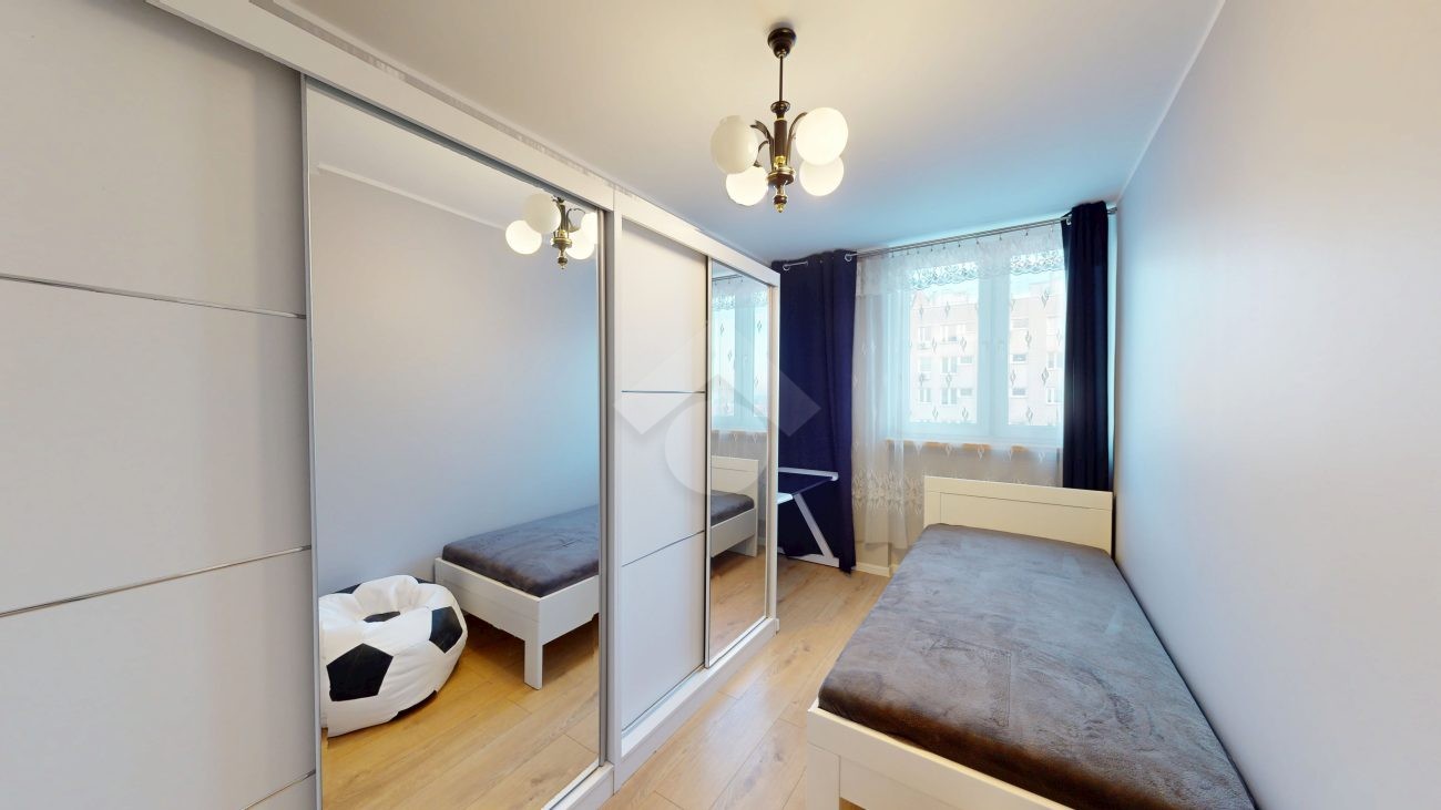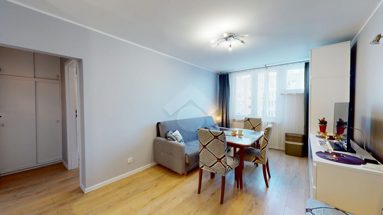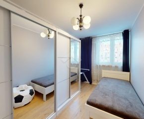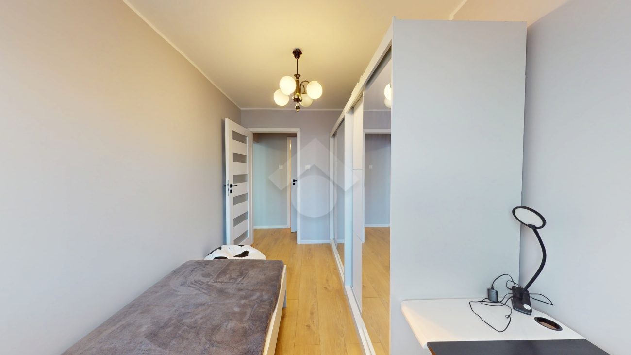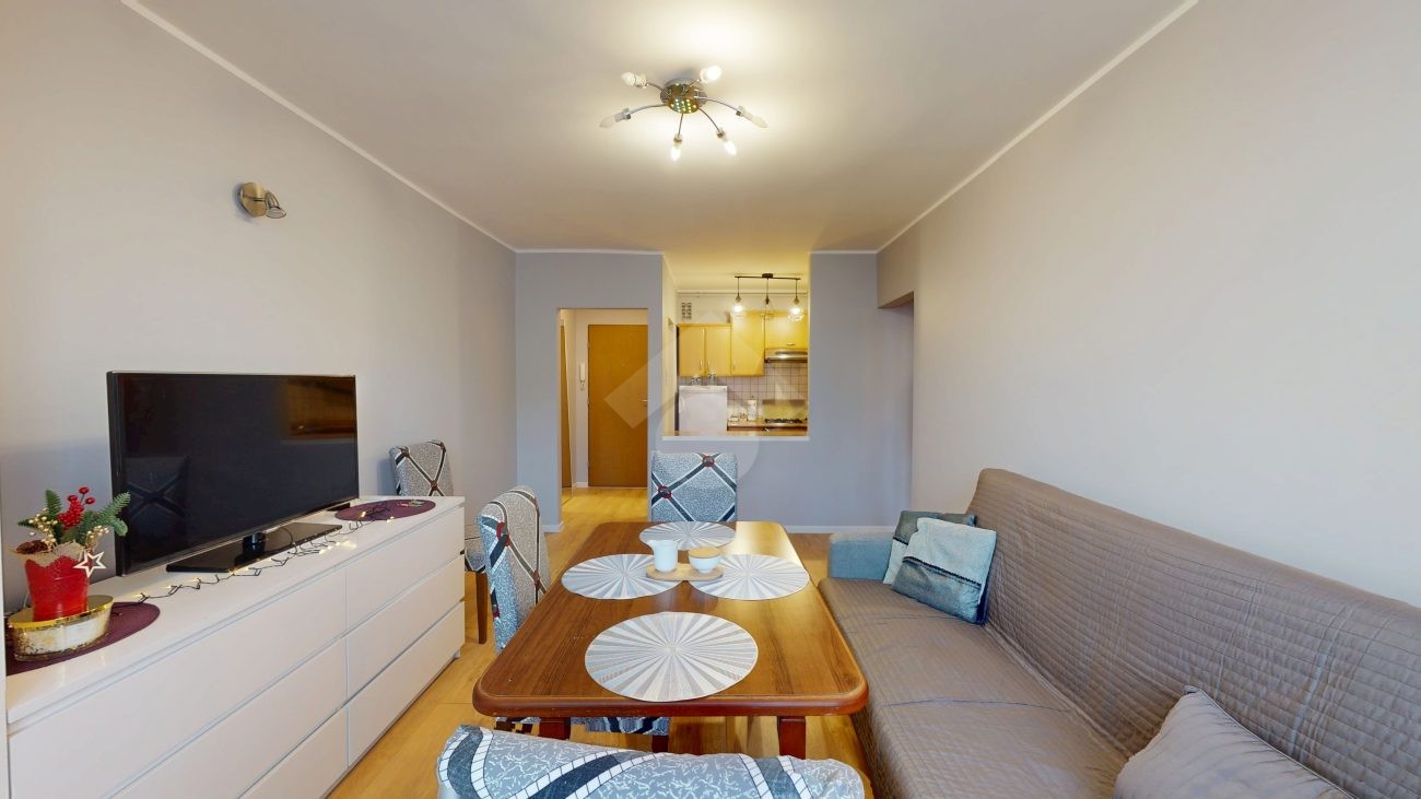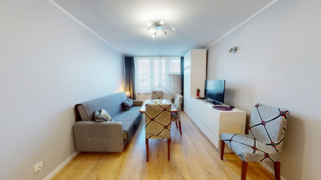 W pokoju dziennym znajduje się rozkładana kanapa, szafka RTV z telewizorem, duża szafa oraz stół z czterema krzesłami. Aneks kuchenny wyposażony jest w zabudowę kuchenną, płytę grzewczą z piekarnikiem, lodówkę z zamrażarką, okap oraz zlew. W sypialni znajduje się jednoosobowe łóżko, dwie pojemne szafy oraz biurko. Łazienka wyposażona jest w toaletę, wannę, pralkę oraz szafkę. W przedpokoju znajduje się zabudowana szafa.