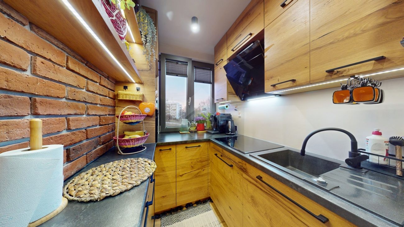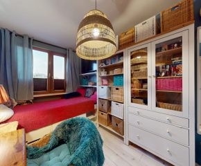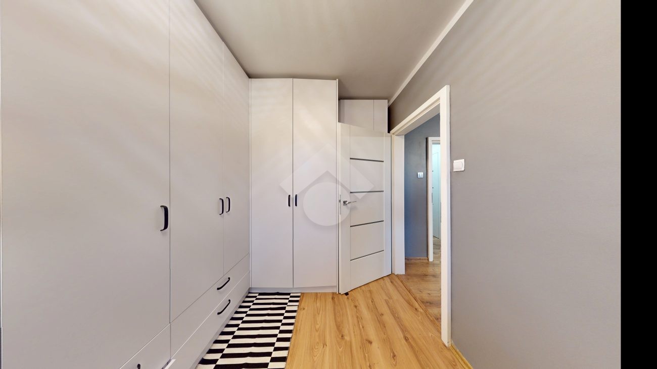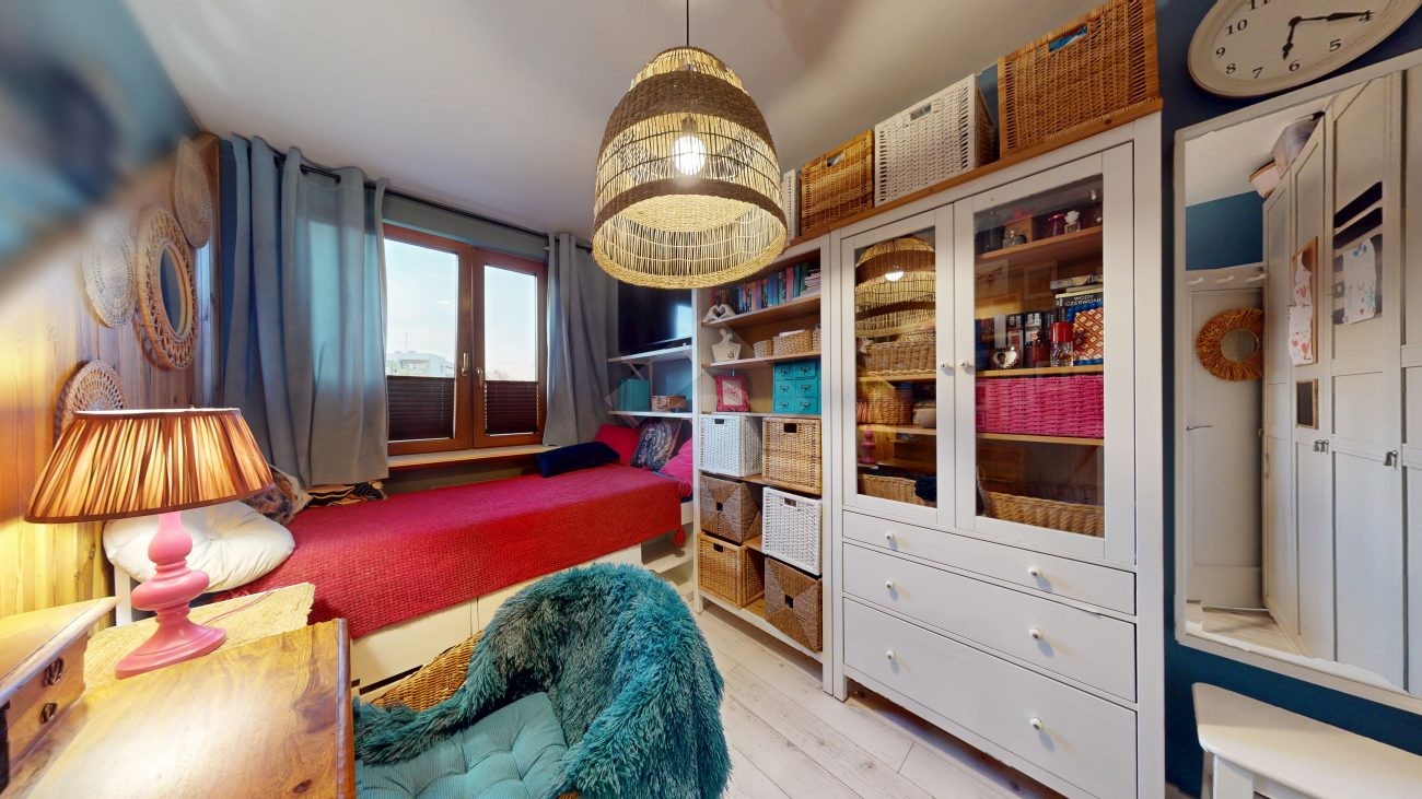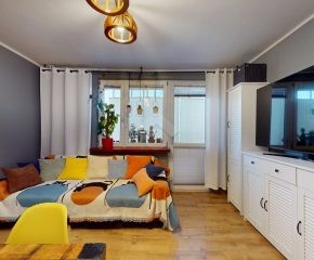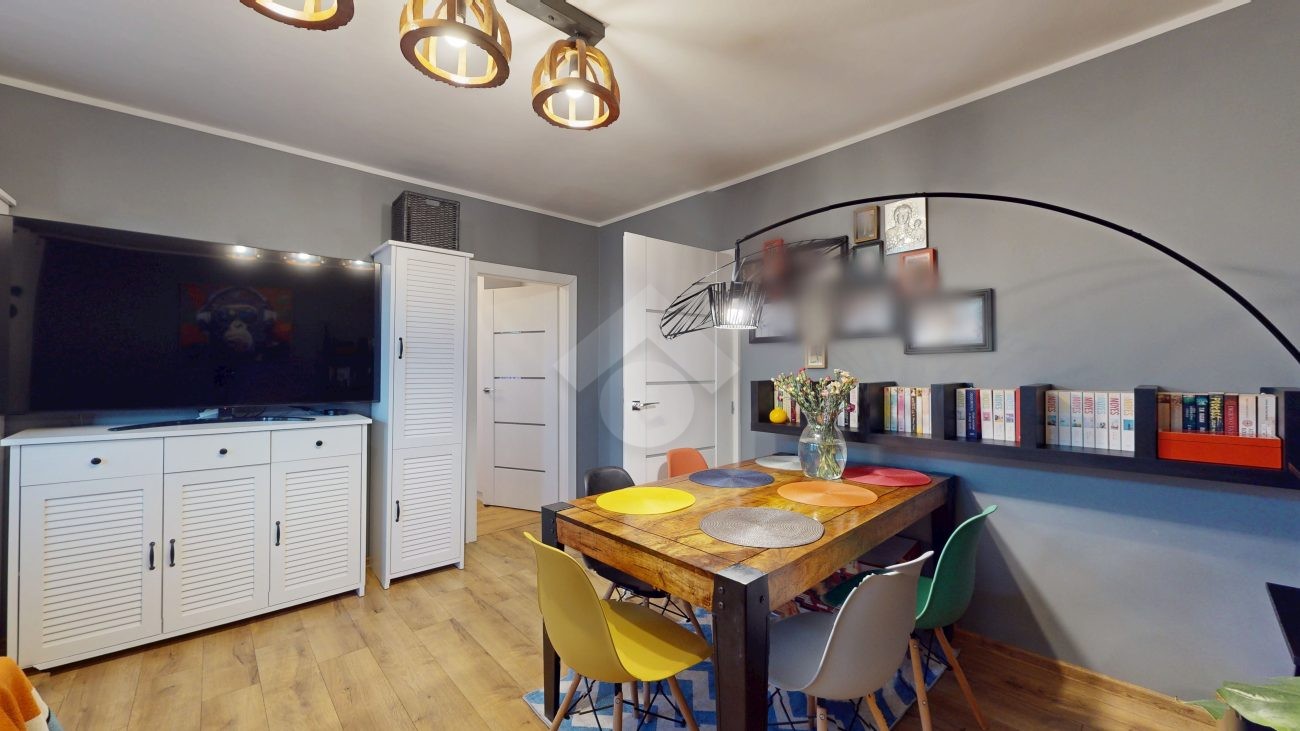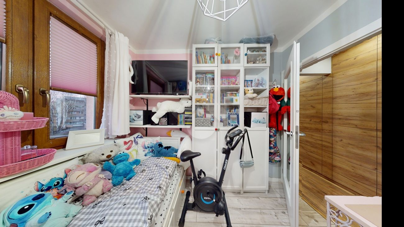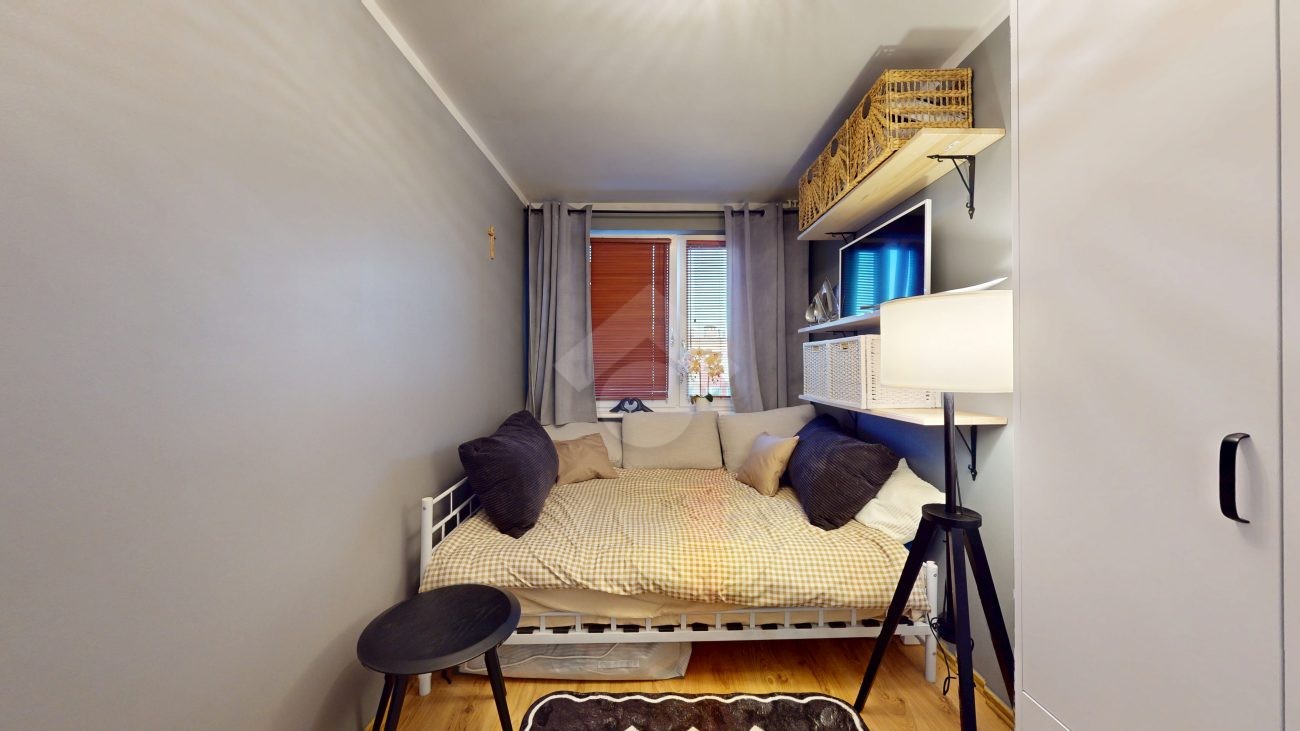 Do wejścia. W łazience położone są płytki natomiast w kuchni, salonie, na przedpokoju oraz w sypialniach znajdują się panele. W pomieszczeniach, na ścianach i sufitach zostały położone gładzie. Okna plastikowe. Instalacja wodno – kanalizacyjna wymieniona. Instalacja elektryczna wymieniona w kuchni i w łazience. Ogrzewanie oraz ciepła woda z sieci miejskiej – bez piecyków i dodatkowych kosztów eksploatacyjnych. Zabudowa kuchenna wyposażona w płytę elektryczną, okap, zmywarkę, lodówkę z zamrażarką, mikrofalówkę oraz blat roboczy i miejsca do przechowywania. W łazience – prysznic, toaleta i pralka. W sypialniach znajdują się pojemne szafy, regały, łóżka, biurko z miejscem do pracy. W przedpokoju wbudowana szafa. Możliwość powiększenia kuchni. Brak gazu w mieszkaniu.