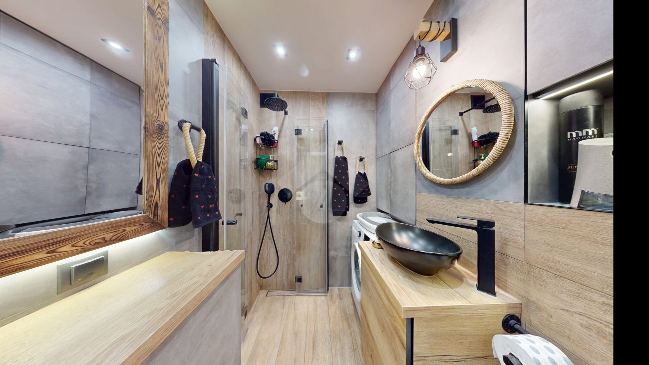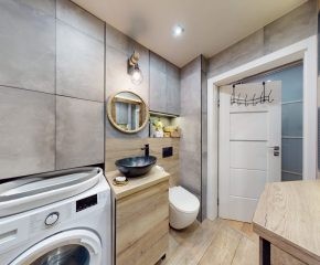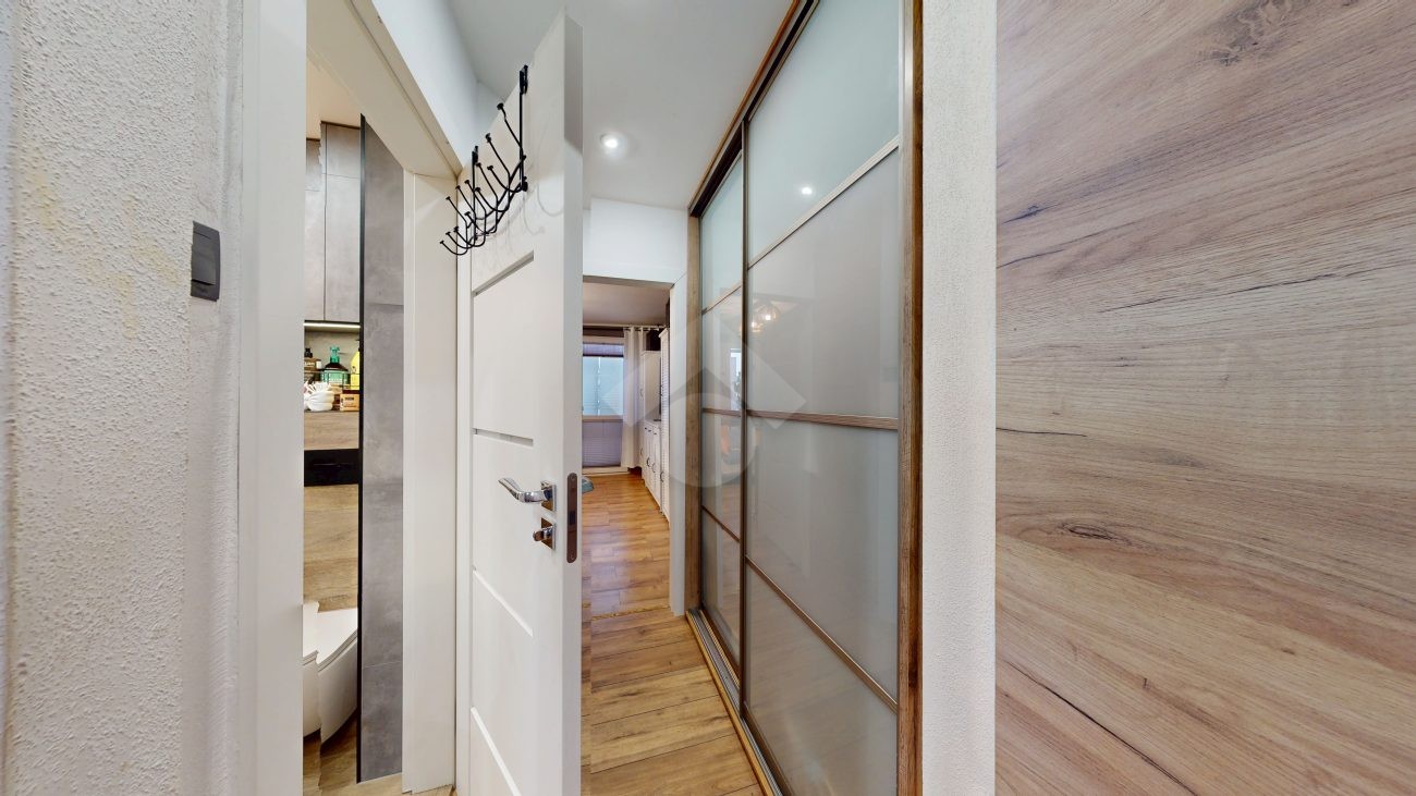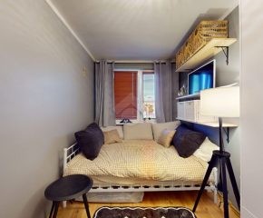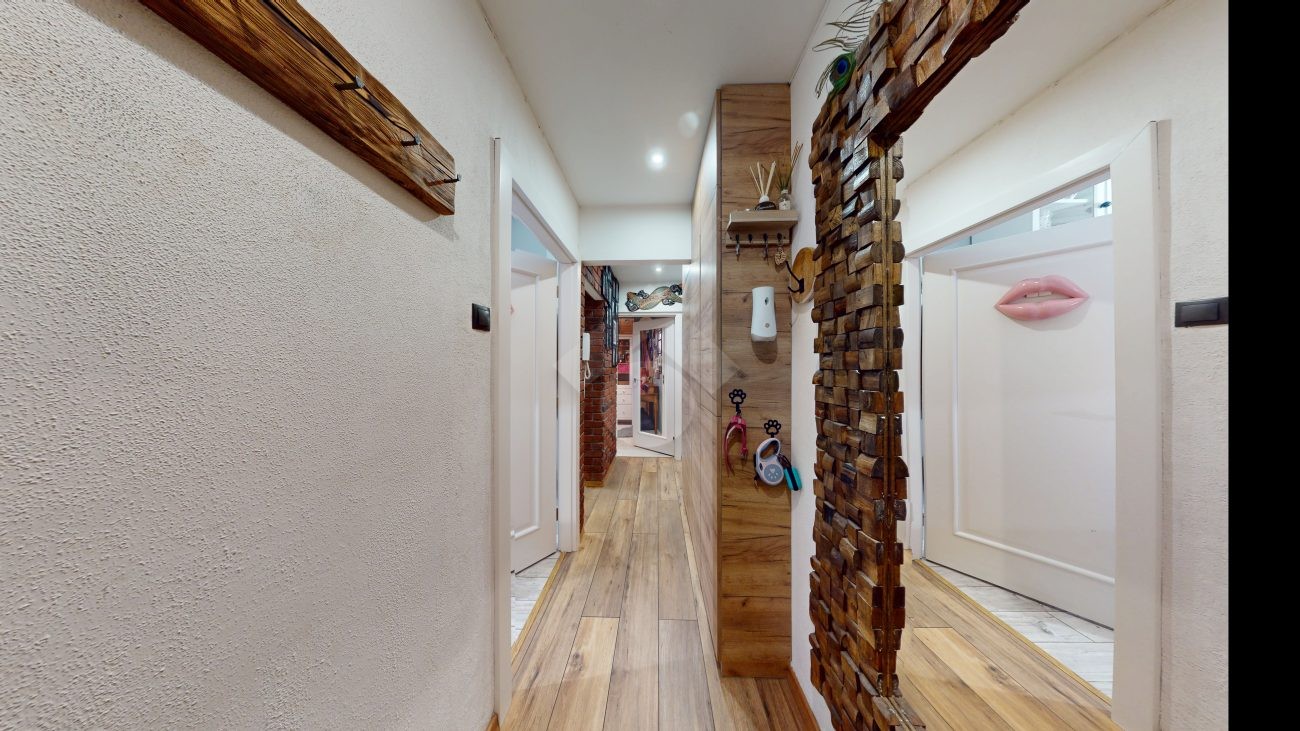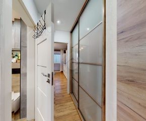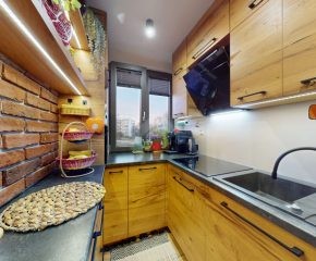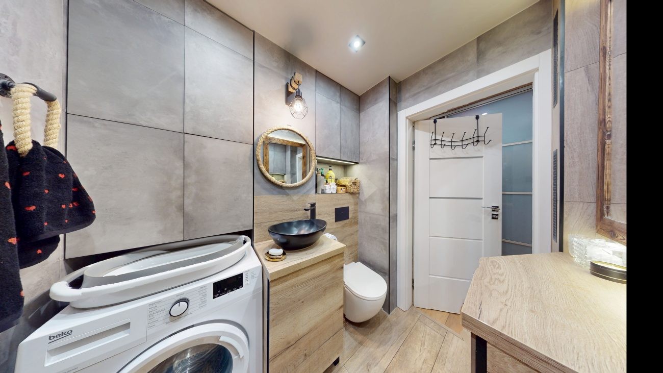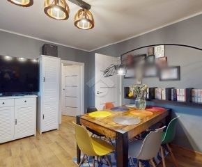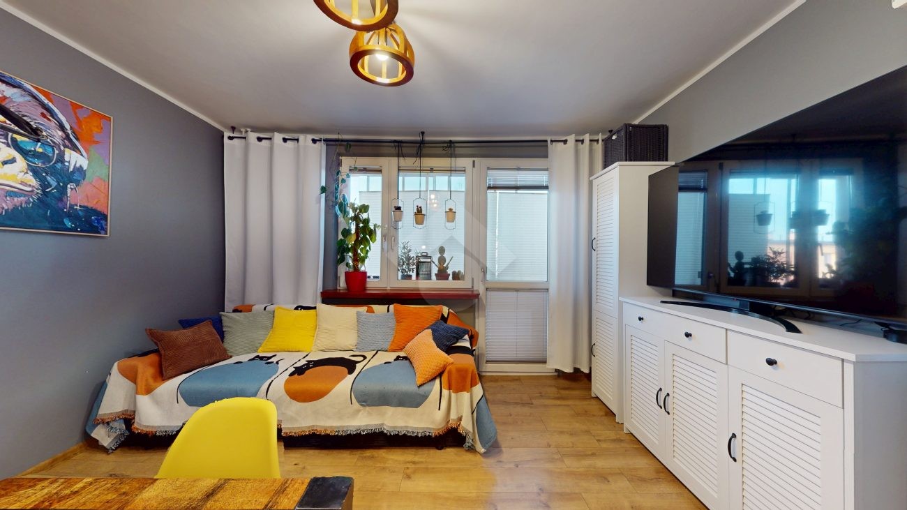 Do wejścia. W łazience położone są płytki natomiast w kuchni, salonie, na przedpokoju oraz w sypialniach znajdują się panele. W pomieszczeniach, na ścianach i sufitach zostały położone gładzie. Okna plastikowe. Instalacja wodno – kanalizacyjna wymieniona. Instalacja elektryczna wymieniona w kuchni i w łazience. Ogrzewanie oraz ciepła woda z sieci miejskiej – bez piecyków i dodatkowych kosztów eksploatacyjnych. Zabudowa kuchenna wyposażona w płytę elektryczną, okap, zmywarkę, lodówkę z zamrażarką, mikrofalówkę oraz blat roboczy i miejsca do przechowywania. W łazience – prysznic, toaleta i pralka. W sypialniach znajdują się pojemne szafy, regały, łóżka, biurko z miejscem do pracy. W przedpokoju wbudowana szafa. Możliwość powiększenia kuchni. Brak gazu w mieszkaniu.