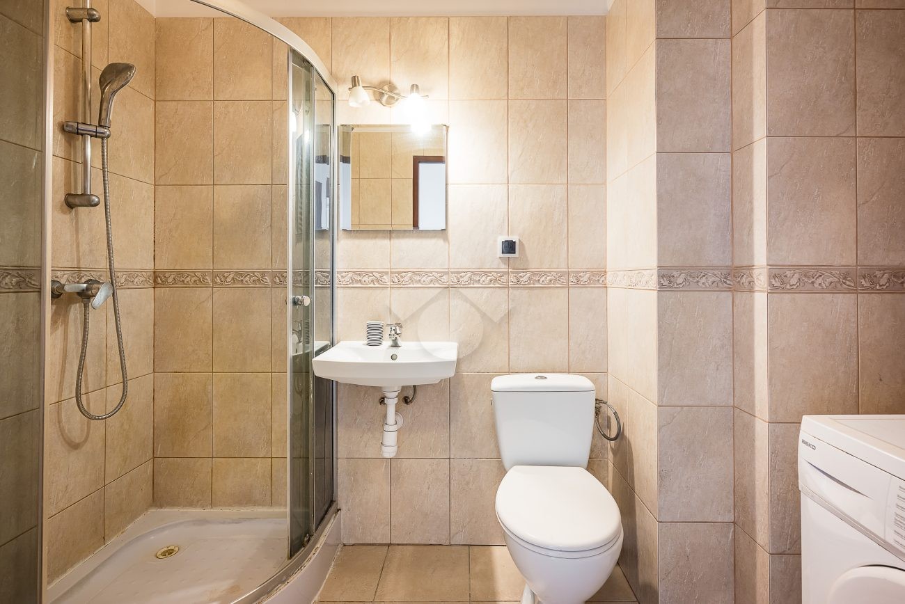 Stan mieszkania: dobry, stan do odświeżenia. Łazienka z WC oraz prysznicem, na ścianach i podłodze położone płytki. Kuchnia w zabudowie, wyposażona w piekarnik z płytą indukcyjną, lodówkę oraz zlewozmywak. Okna plastikowe. Ogrzewanie oraz ciepła woda z sieci miejskiej (MPEC). Ekspozycja północno-wschodnia.