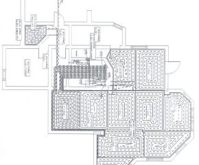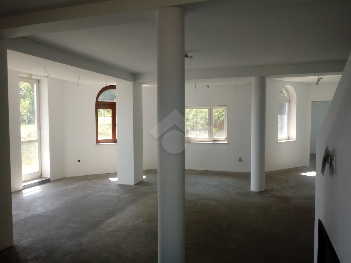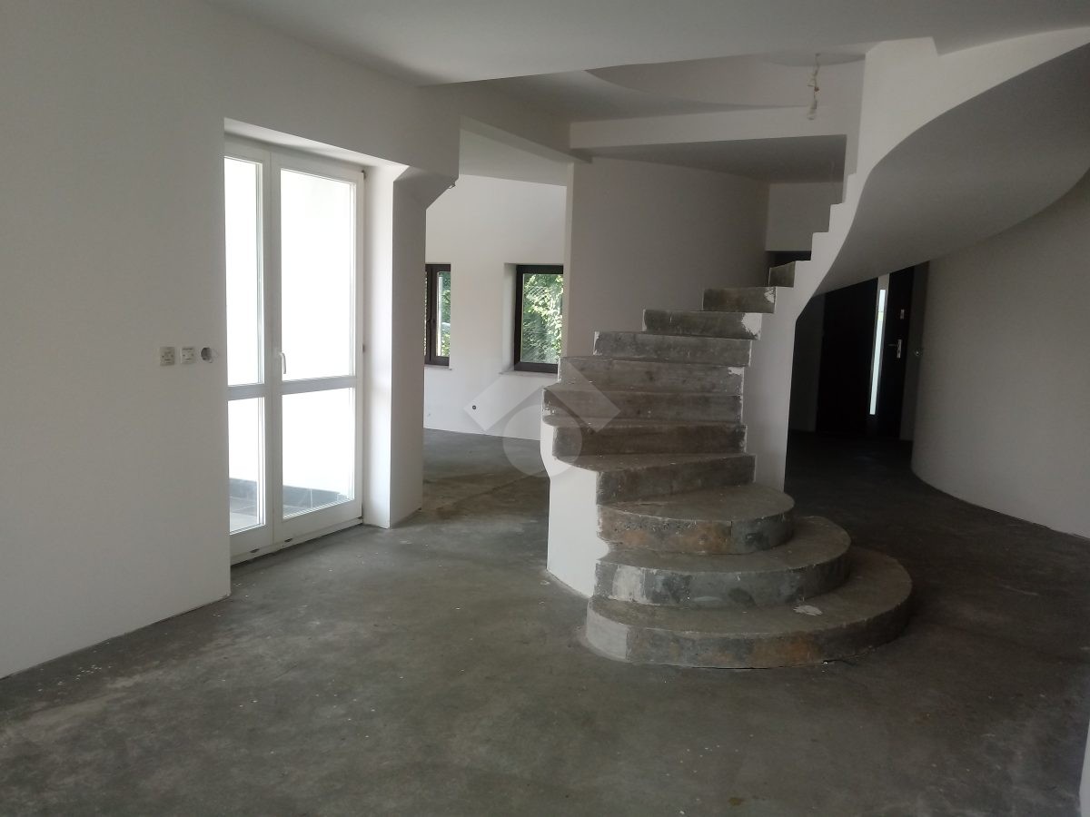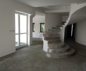 Zgodnie z projektem na parterze: łazienka z sauną, spiżarnia, kotłownia oraz otwarta przestrzeń, z przeznaczeniem na pokój bilardowy z kominkiem i tarasem, z której okazałe spiralne schody prowadzą na piętro.