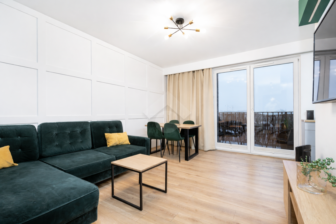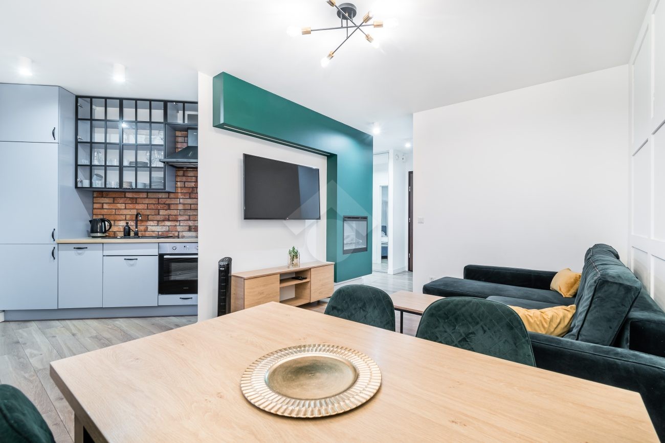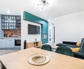 Stan mieszkania: bardzo dobry, gotowy do zamieszkania. Na podłodze panele, w łazience położona glazura. W salonie znajduje się elektryczny kominek, który zapewnia przytulną atmosferę, sześcioosobowy stół jadalniany, telewizor. Kuchnia w pełni wyposażona (ze zmywarką, płytą indukcyjną, piekarnikiem, tosterem i ekspresem do kawy). Łazienka z prysznicem i pralką. Balkon z widokiem na panoramę miasta. Ogrzewanie i ciepła woda z sieci miejskiej.