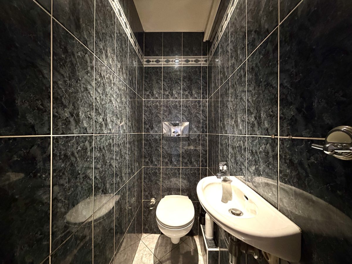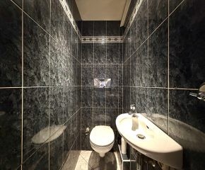 The bathroom includes a bathtub, washing machine, and storage cabinets, while the separate WC adds extra convenience.