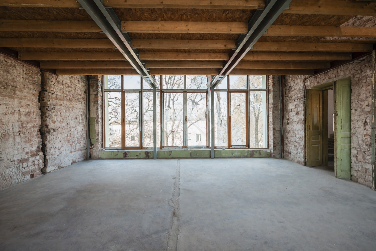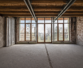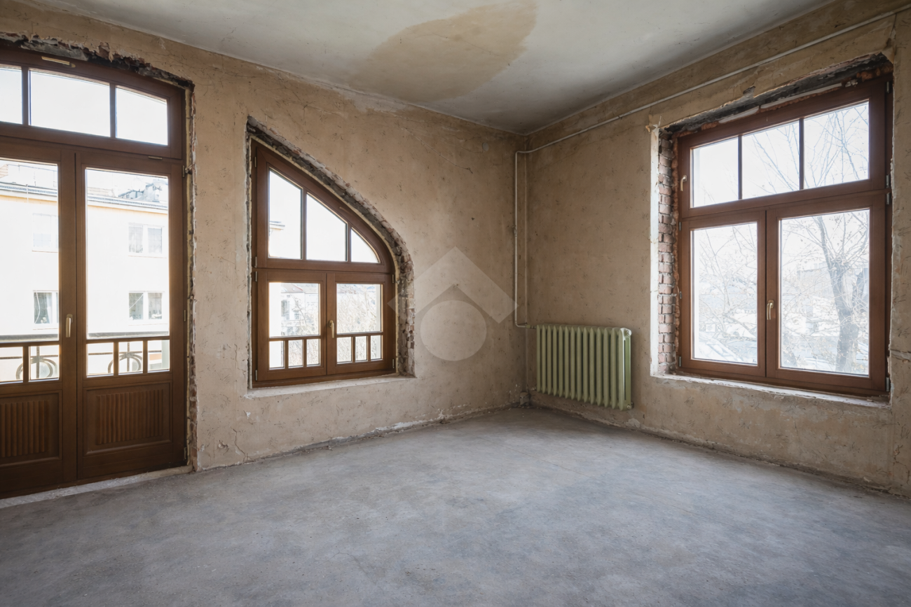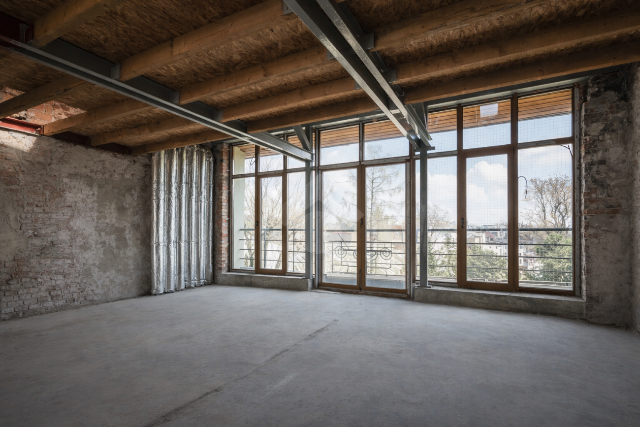 In need of renovation. The owner is currently preparing a renovation project, which gives a potential tenant the opportunity to adapt the layout to their needs. The rooms feature exposed original brick walls, while the flooring structure is to be determined. A major advantage of the apartment is the “wall of windows,” which creates an impressive sense of space and allows plenty of natural light into the unit.