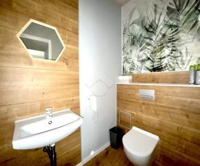 Lokal frontowy od strony ulicy jest w pełni przygotowany pod usługi kosmetyczne – wcześniej funkcjonował tam gabinet kosmetyczny specjalizujący się w makijażu permanentnym. Układ, instalacje oraz standard wykończenia pozwalają na natychmiastowe rozpoczęcie działalności bez dodatkowych inwestycji. Idealne miejsce na salon kosmetyczny, beauty, gabinet estetyczny lub fryzjerski.