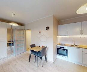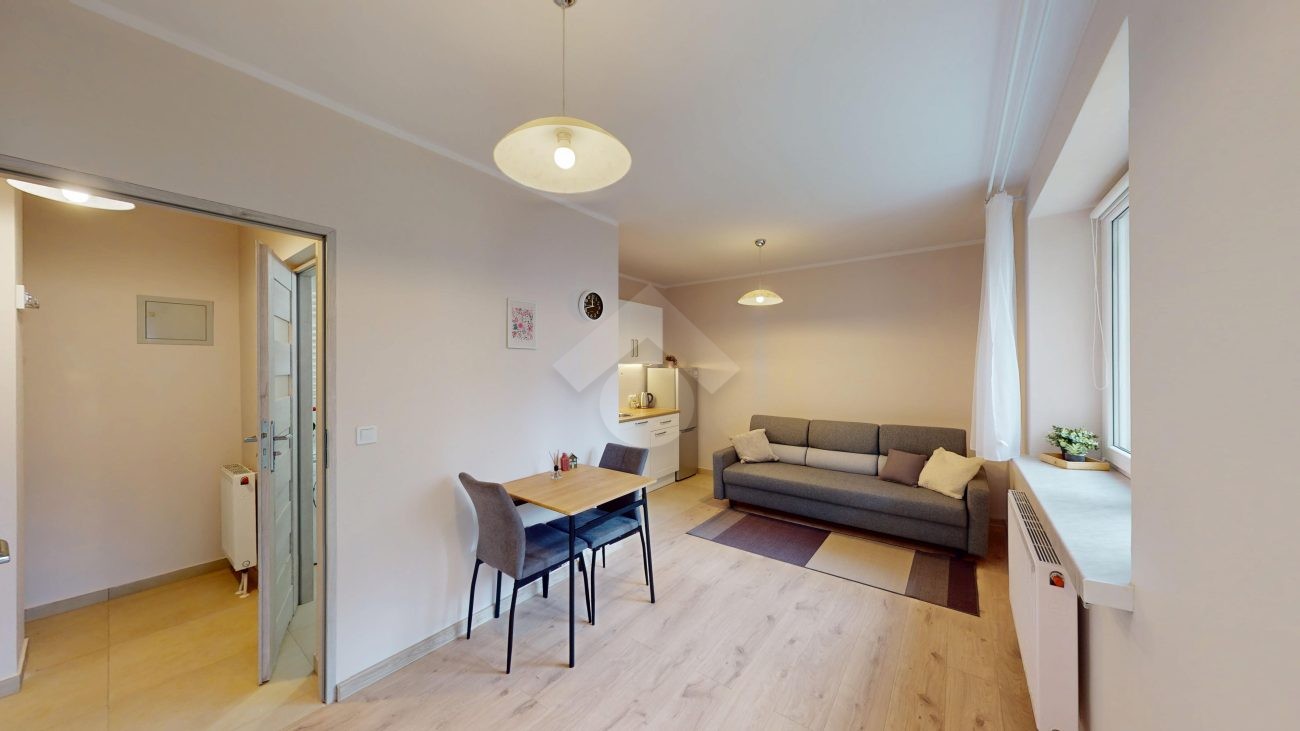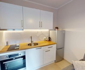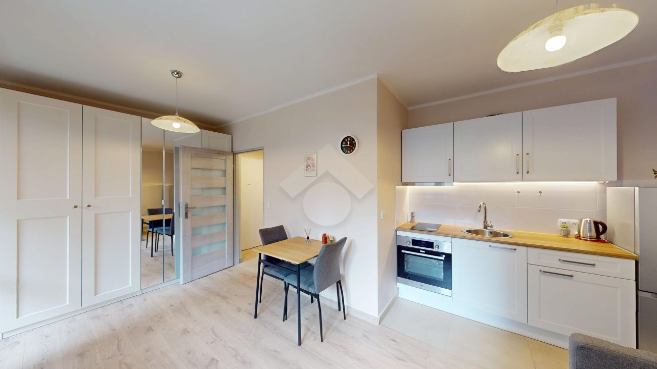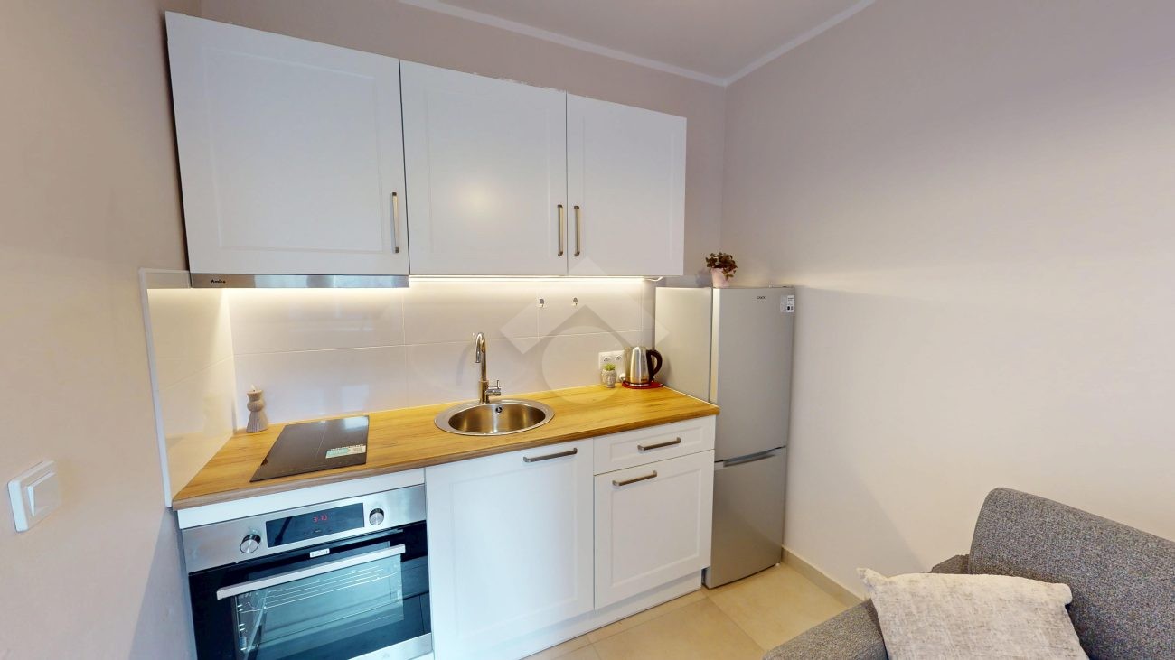 W jasnym pokoju z aneksem kuchennym znajduje się kompletne wyposażenie: płyta indukcyjna, piekarnik, zlew oraz lodówka. Część dzienna oferuje wygodną, rozkładaną kanapę, dużą szafę oraz stolik z dwoma krzesłami. Z pokoju prowadzi wyjście na balkon, idealny na poranną kawę lub chwilę relaksu na świeżym powietrzu.