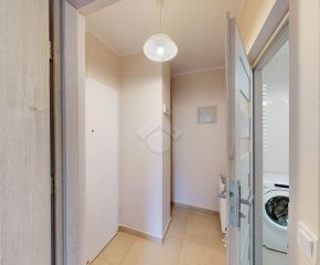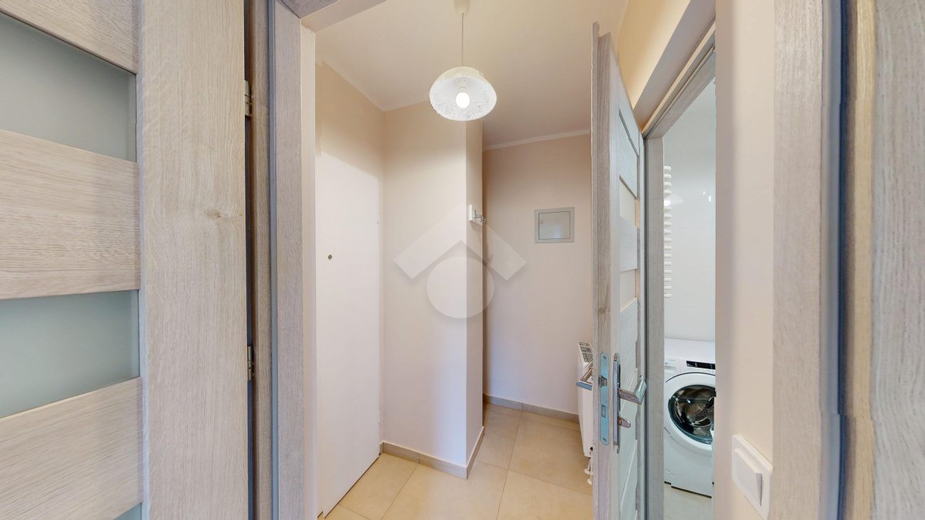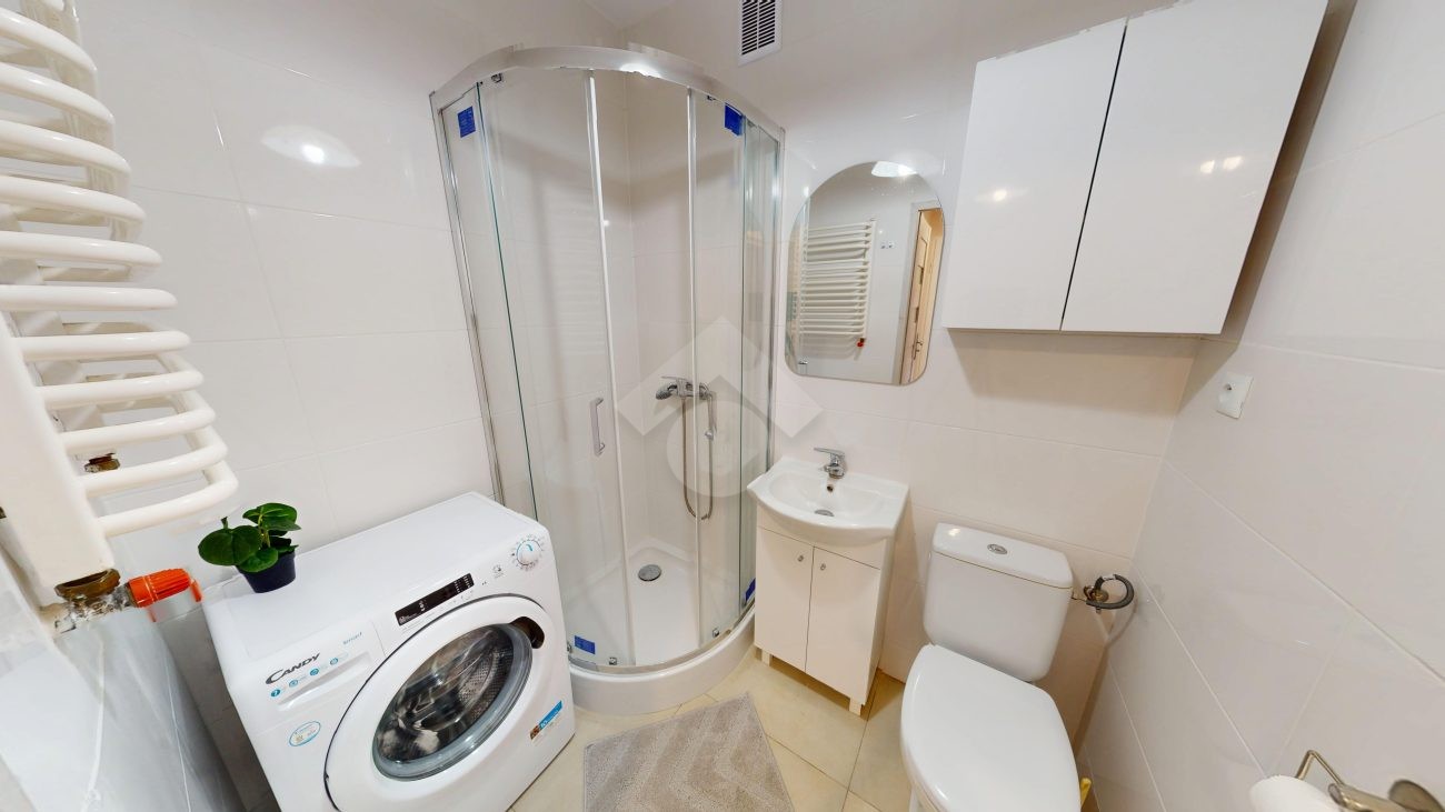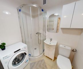 Łazienka wyposażona jest w prysznic, pralkę, umywalkę oraz praktyczną wiszącą szafkę. Mieszkanie utrzymane jest w nowoczesnym, neutralnym stylu.