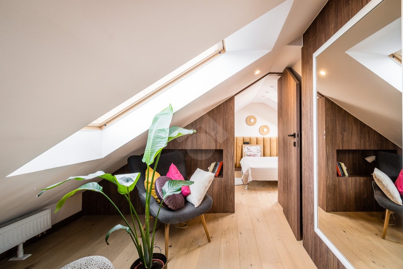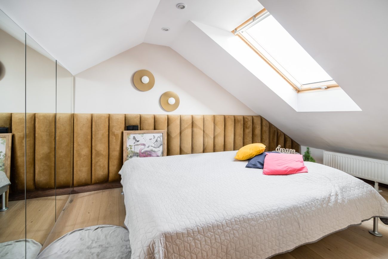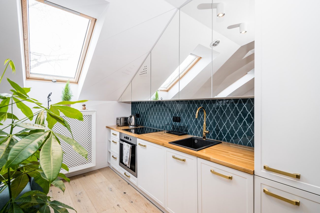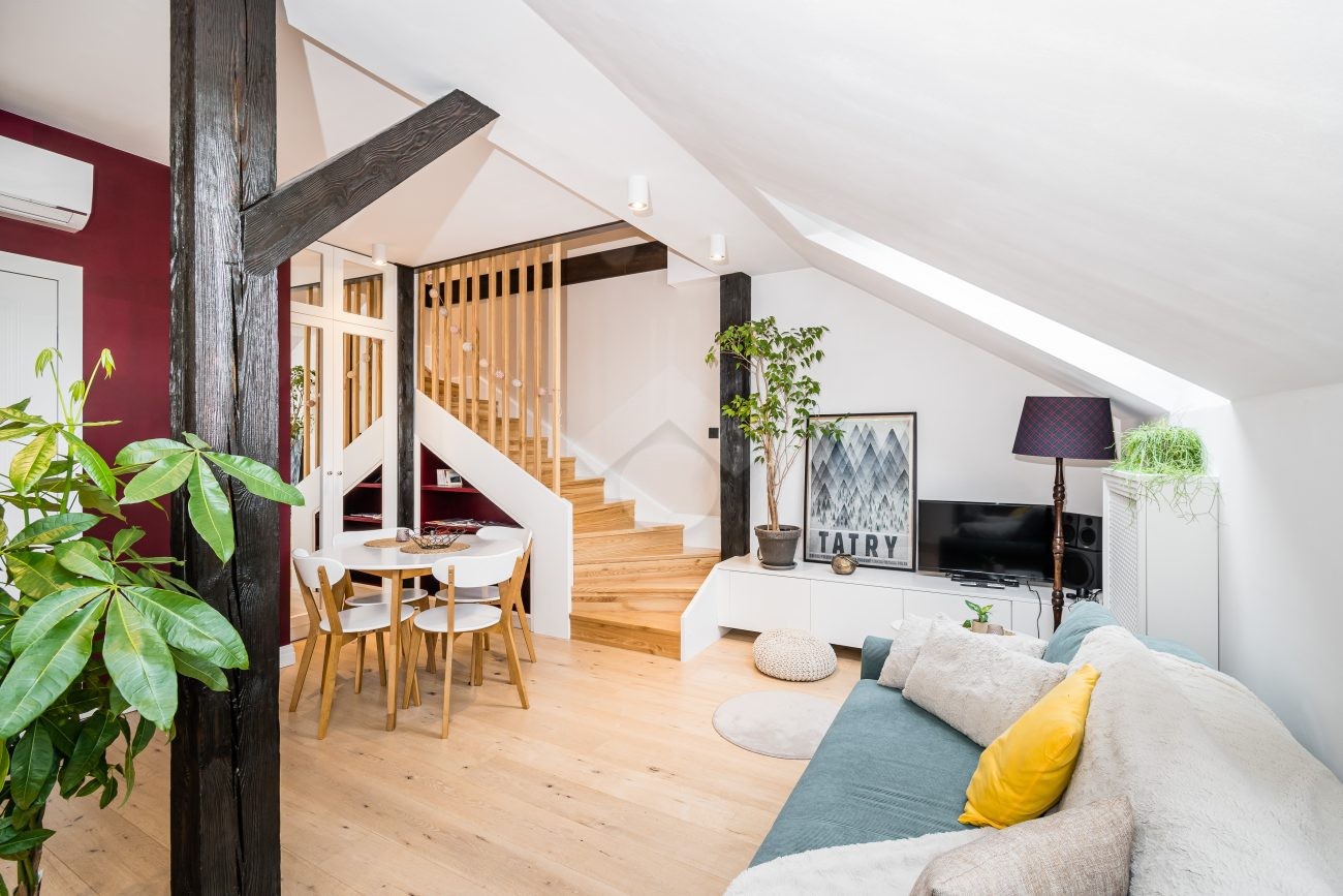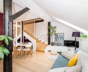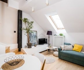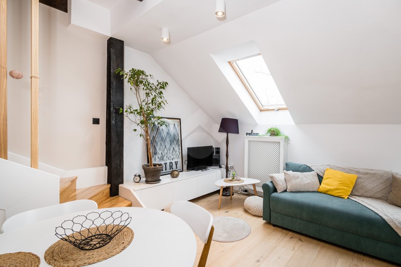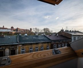 Property: We offer you an apartment with a usable area of 38.37 m² and a total area of approximately 62 m². The property is ready to move in and consists of two levels. The first level features a hall, a living room with a kitchenette, and a bathroom with a toilet. The second level comprises a hall and a bedroom with a beautiful view of Wawel Castle. The hall has a spacious built-in wardrobe, and the kitchenette is equipped with high-quality appliances. The living room features an impressive exposed roof truss, while the bathroom has a walk-in glass shower with a rain shower head. Solid, full stairs lead to the mezzanine, under which there is additional storage space in the form of a built-in wardrobe.