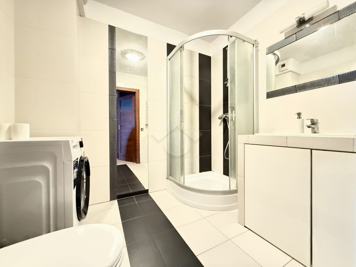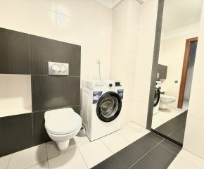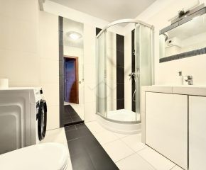 • łazienka z kabiną prysznicową, WC, umywalką oraz pralką,